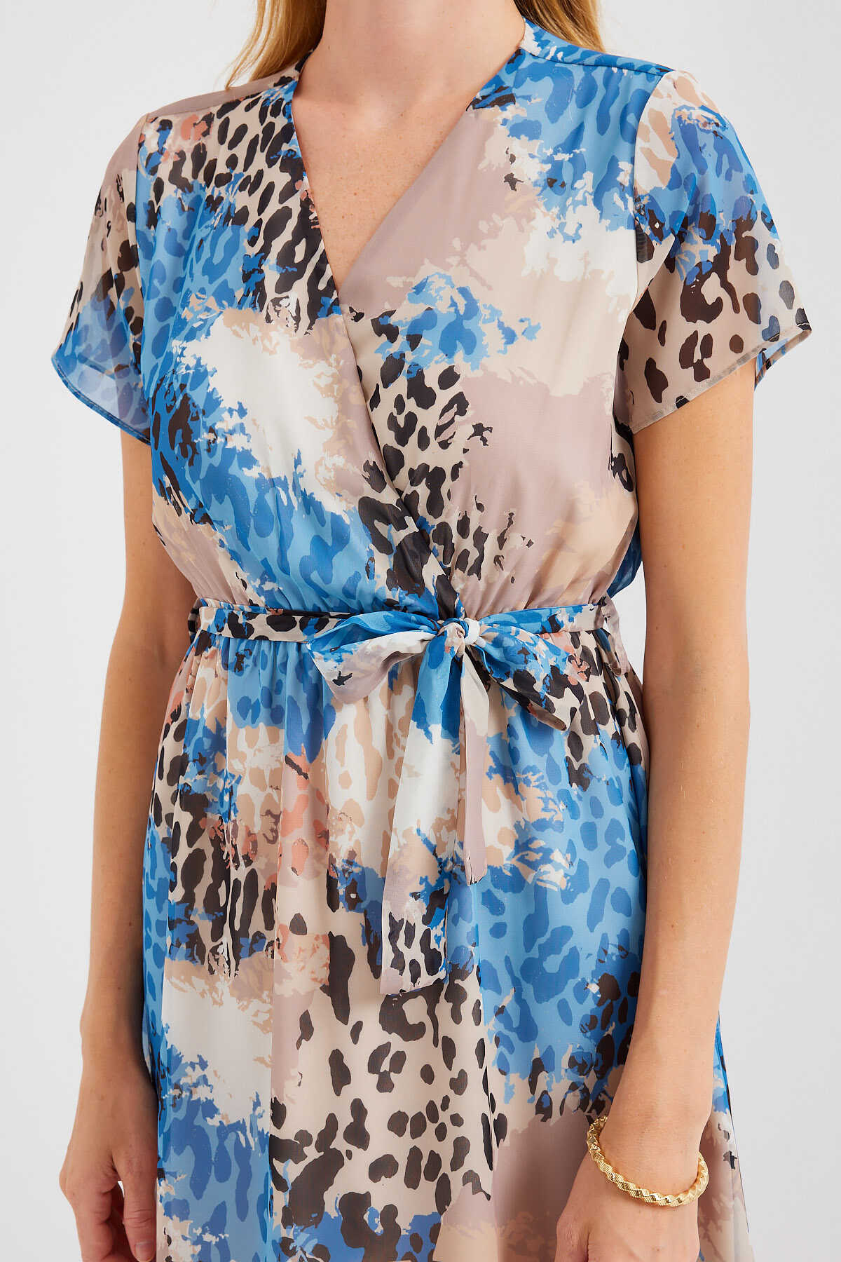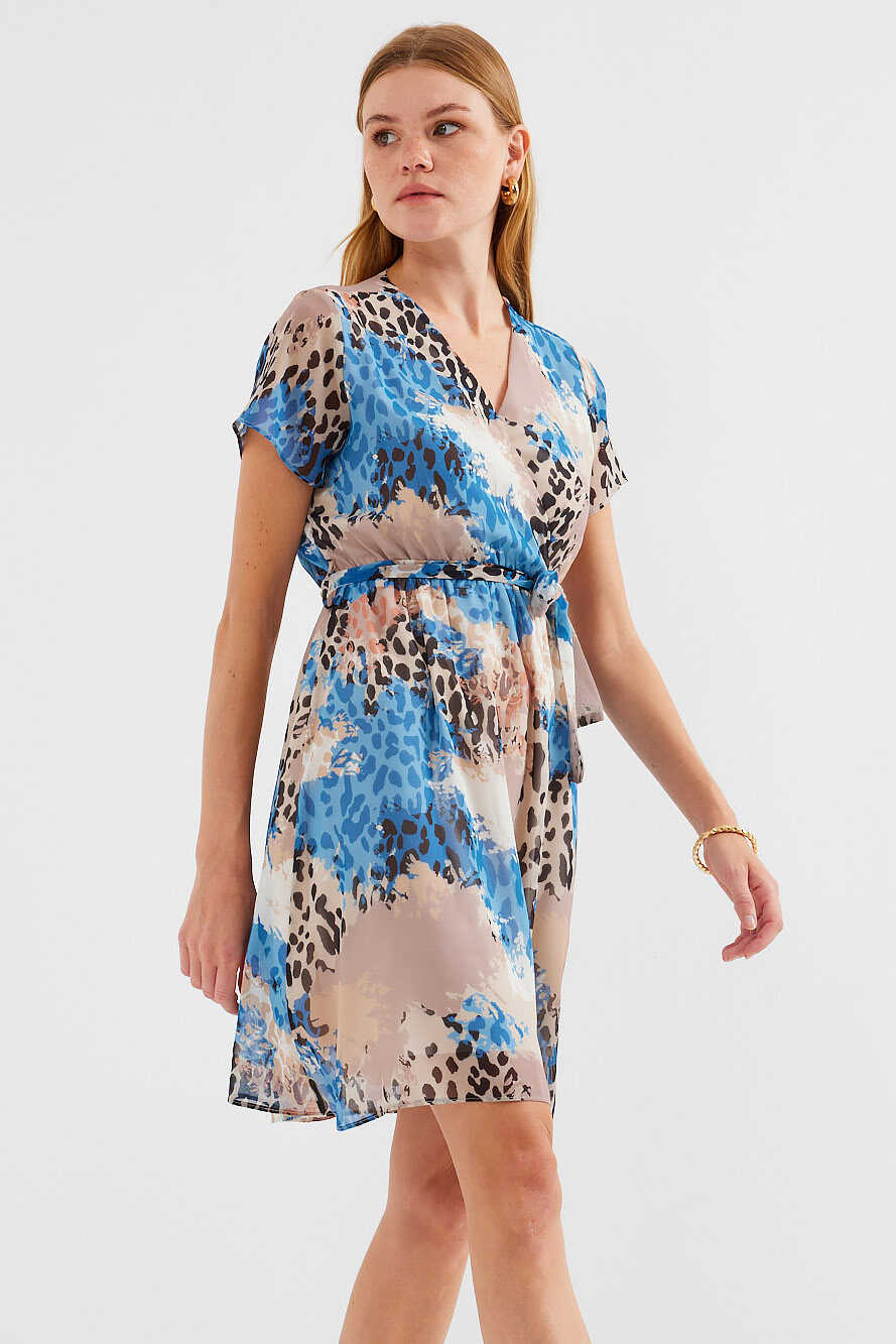 2502 Kısa Kol Desenli Şifon Elbise - Mavi - Kombin