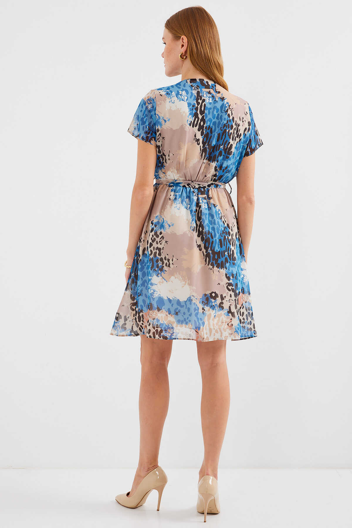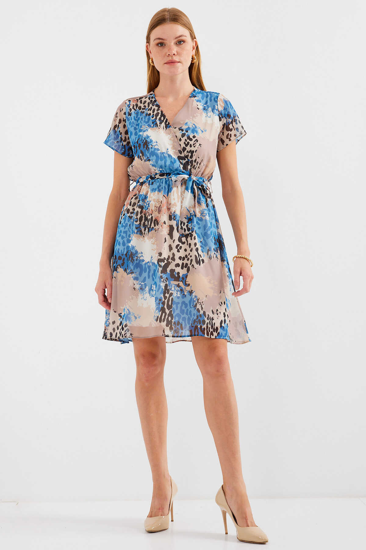 2502 Kısa Kol Desenli Şifon Elbise - Mavi