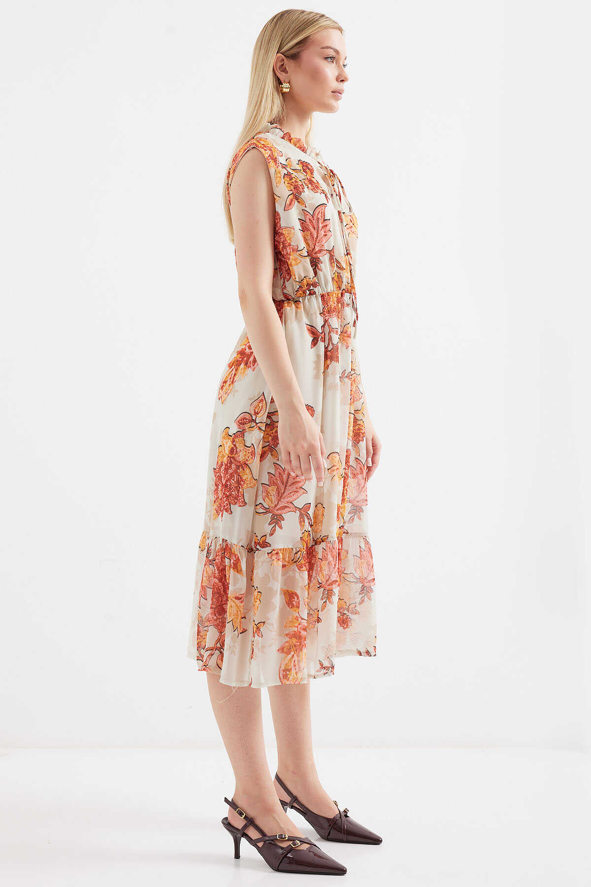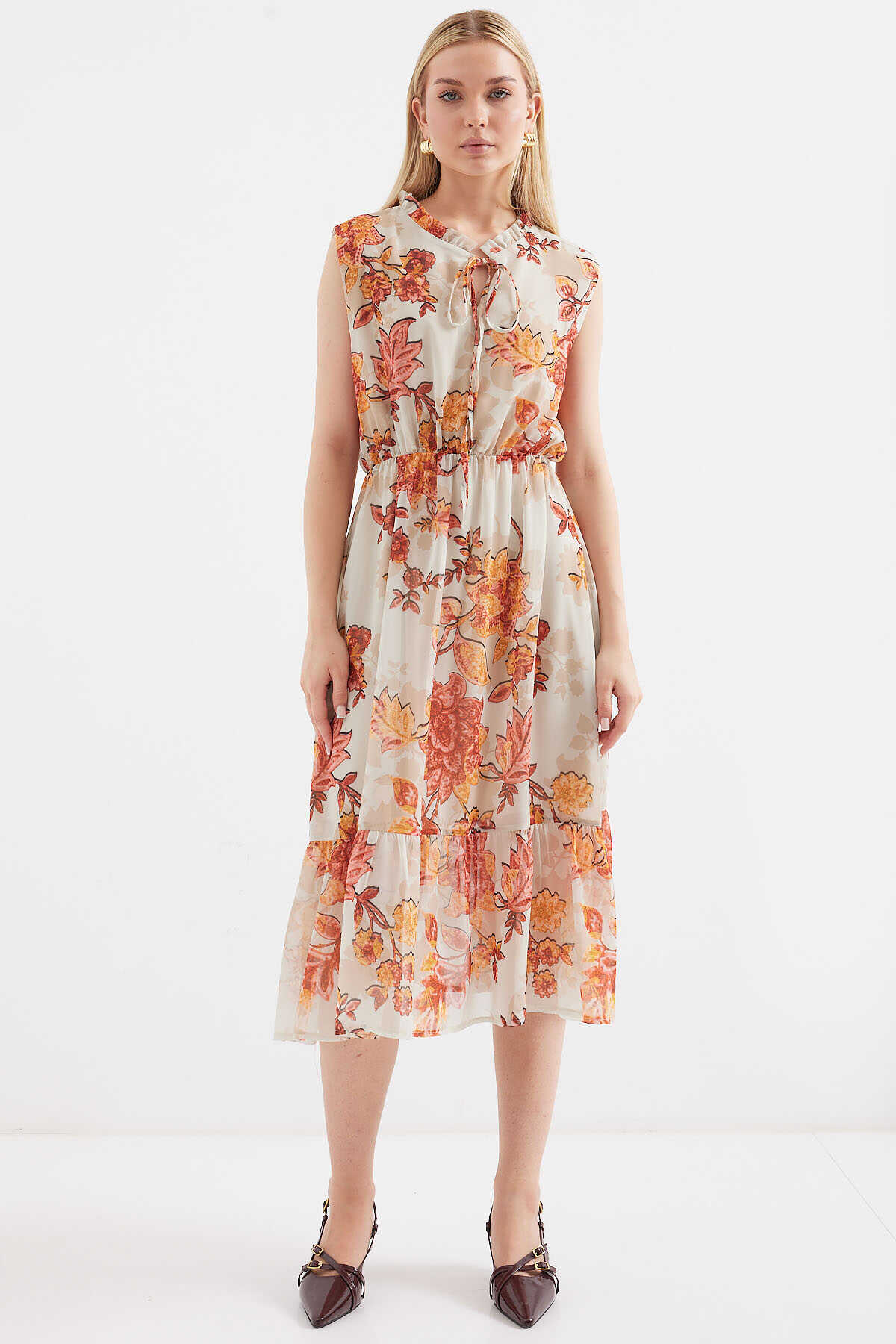 2503 Desenli Sıfır Kol Şifon Elbise - Kiremit - Kombin