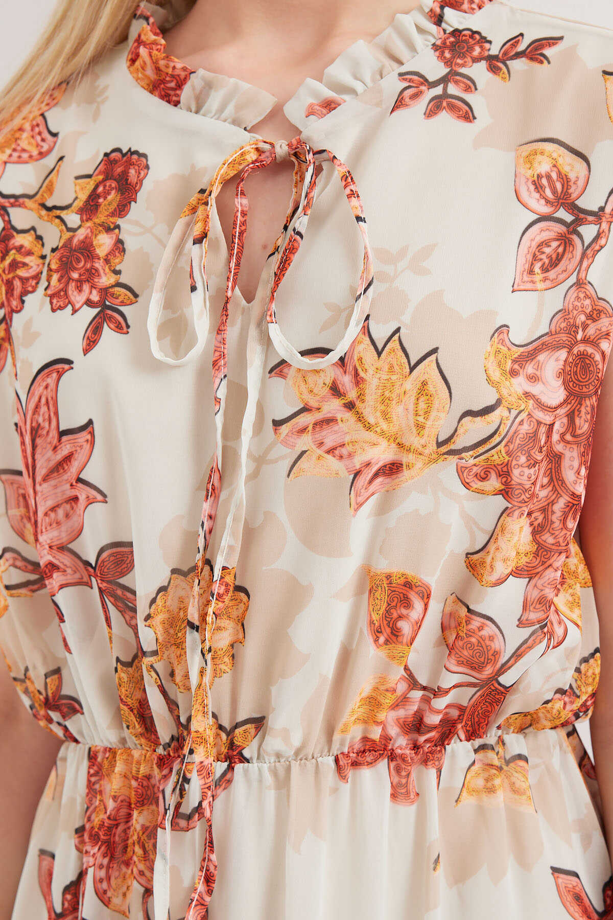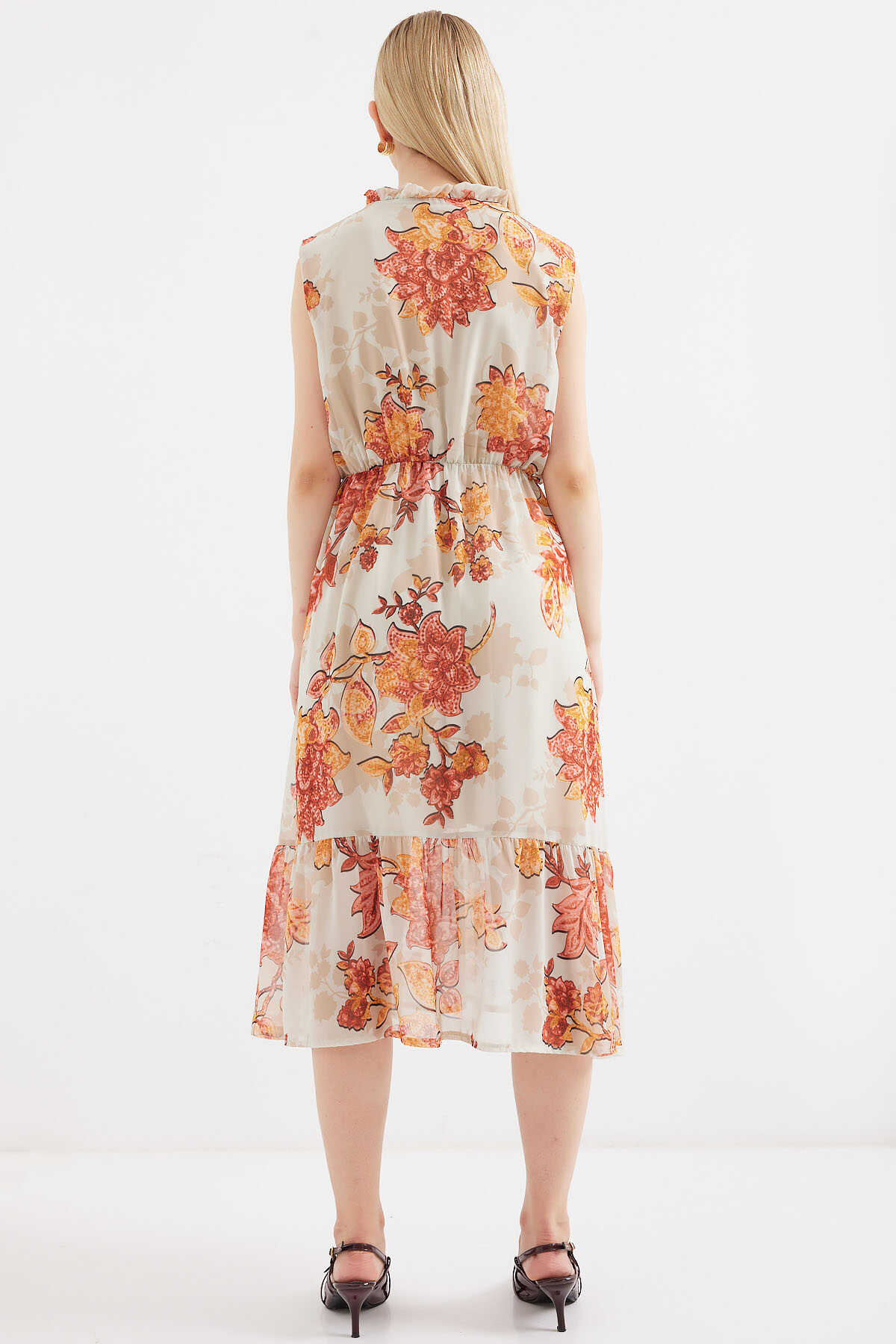 2503 Desenli Sıfır Kol Şifon Elbise - Kiremit