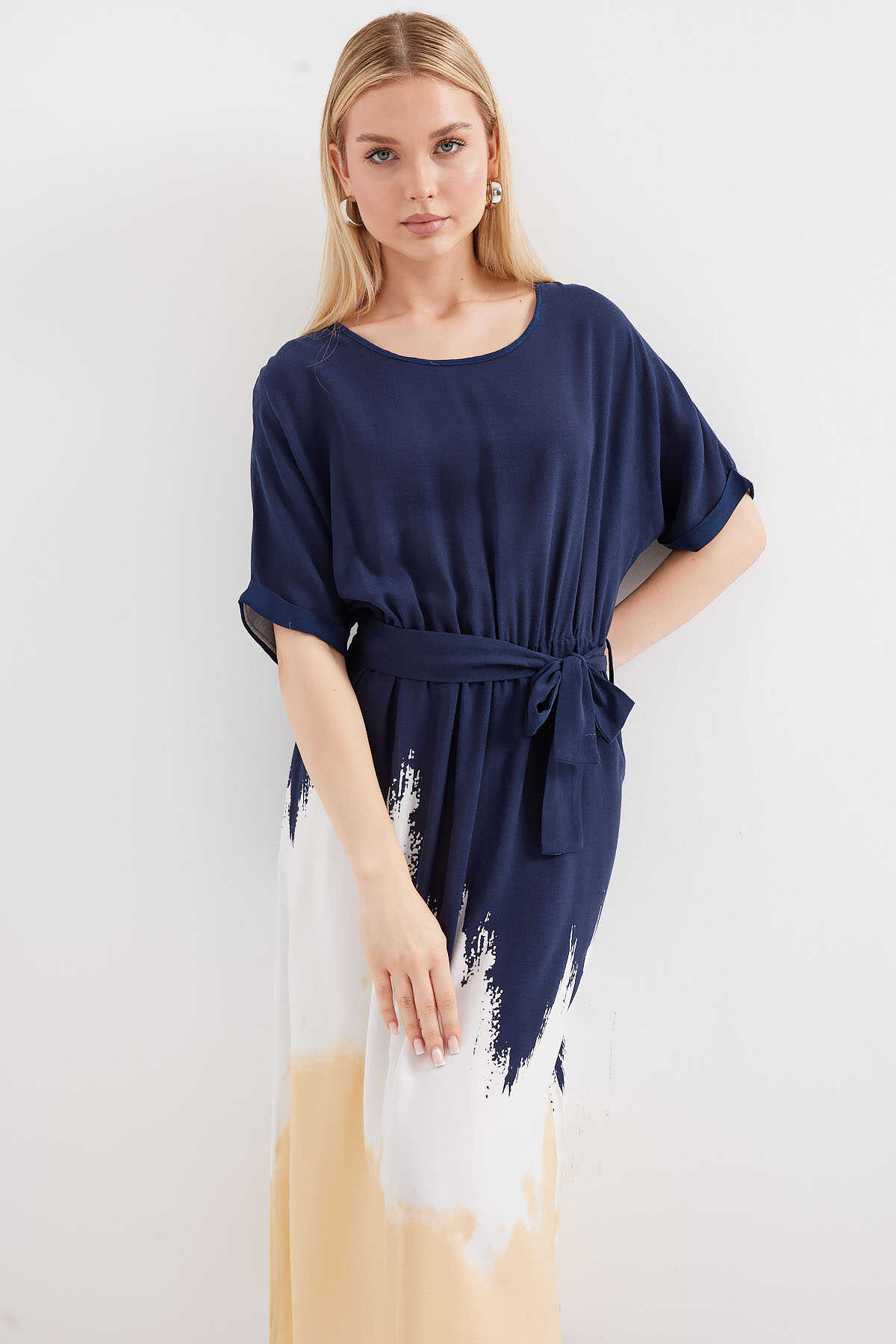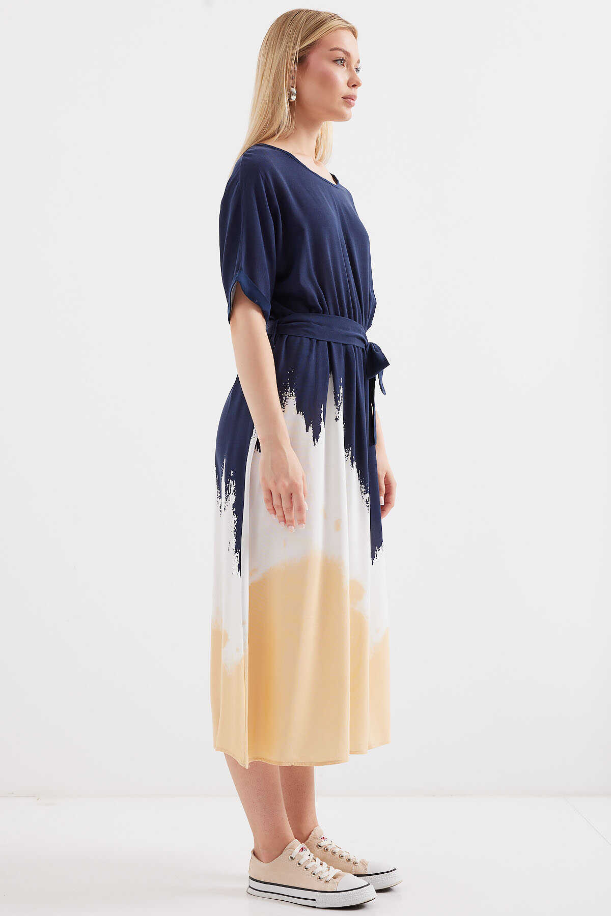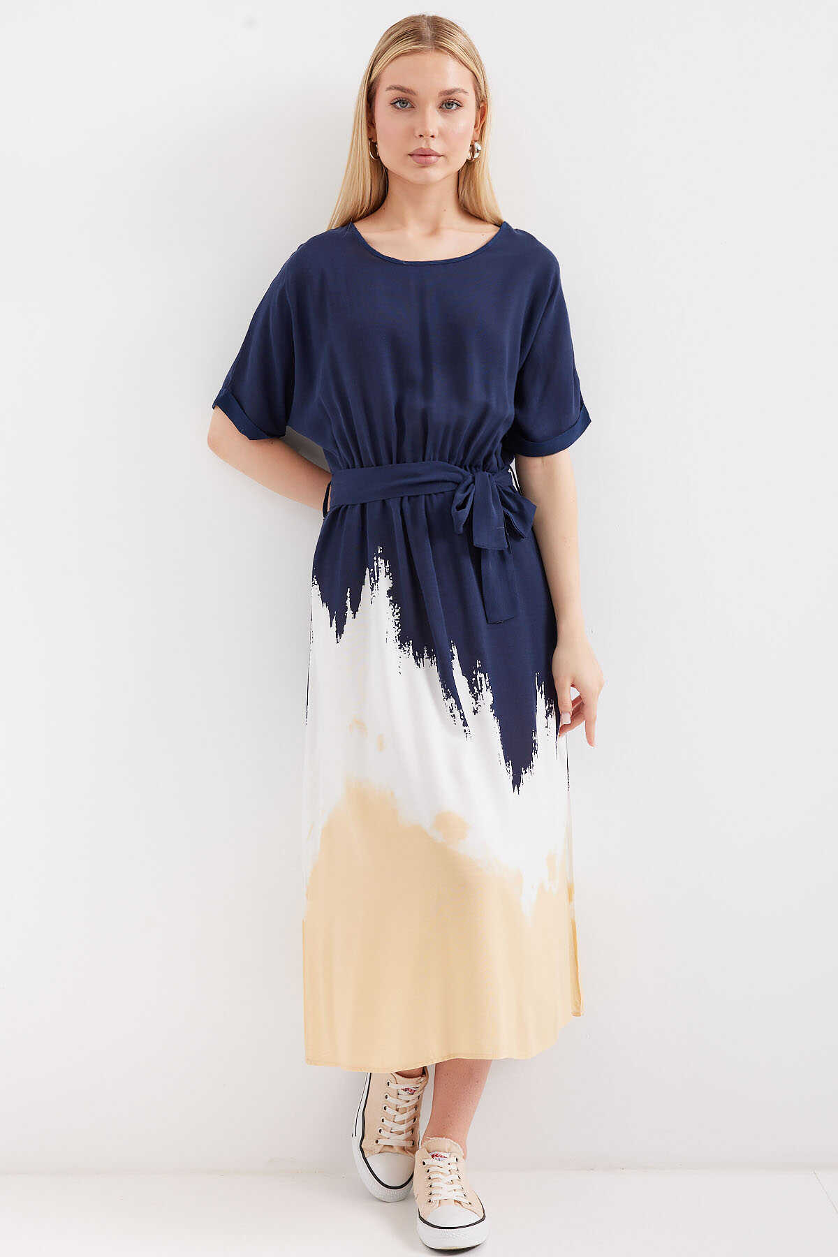 Desenli Kisa Kol Viskon Elbise