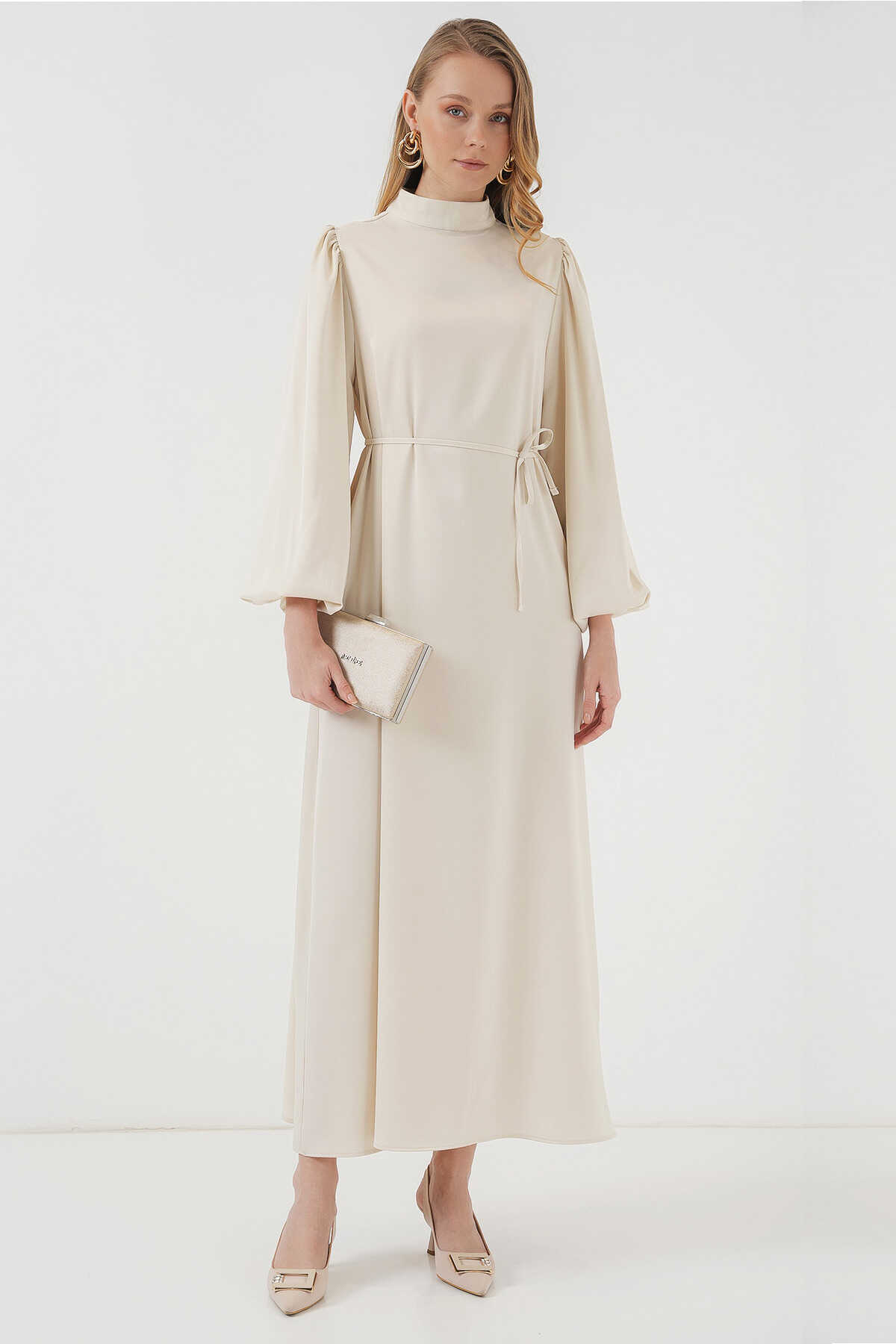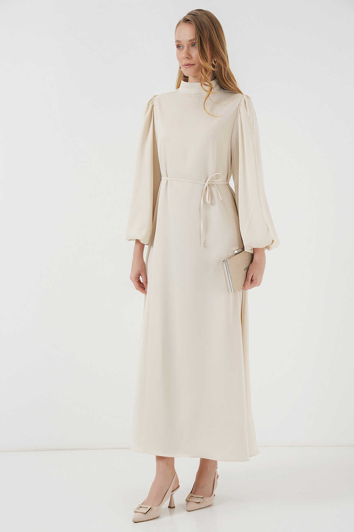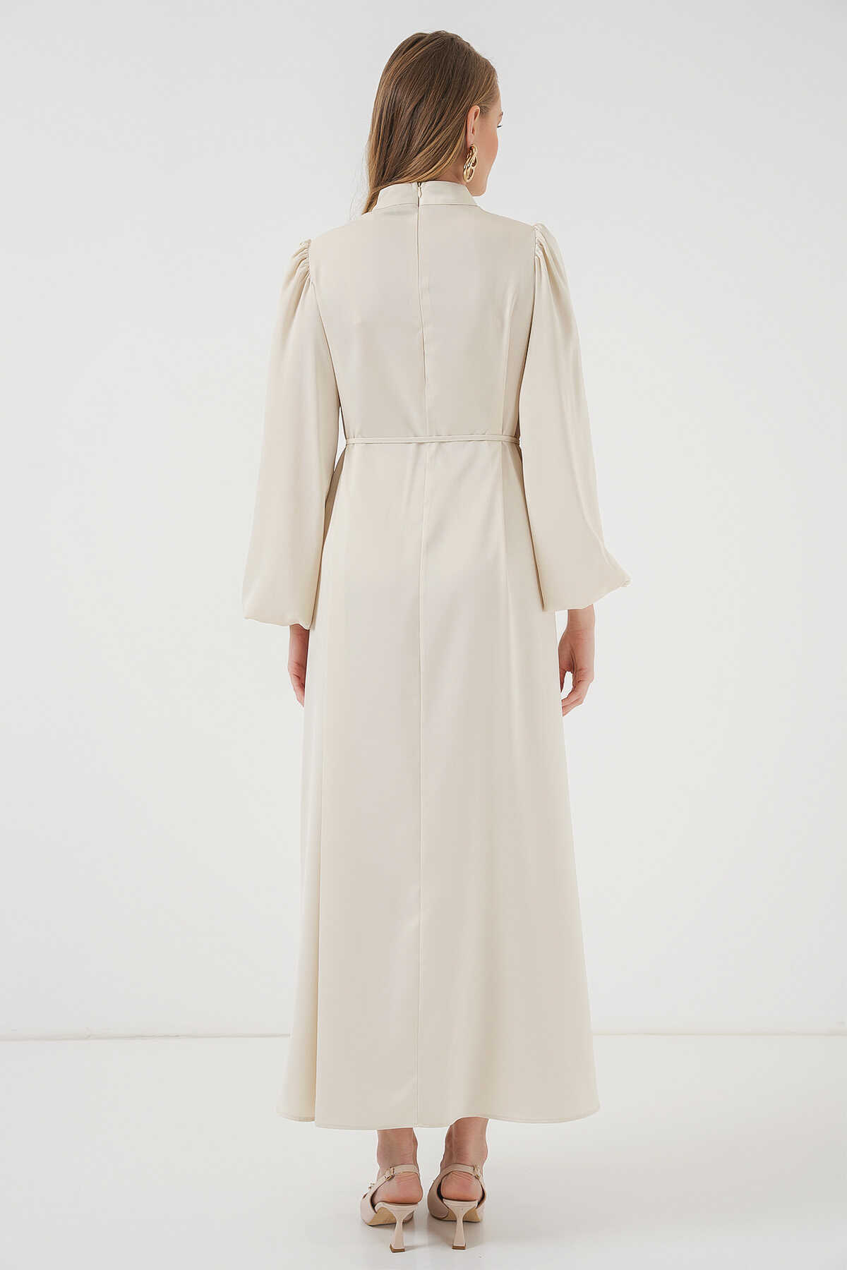 2510 Saten Tesettür Abiye Elbise - Ekru