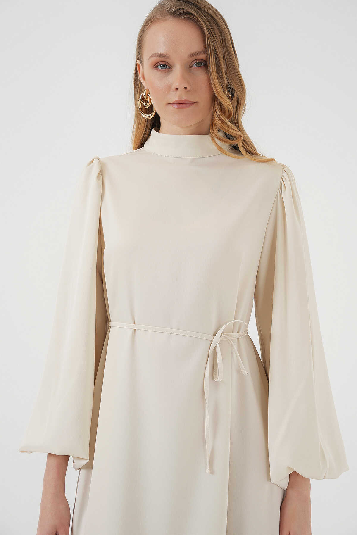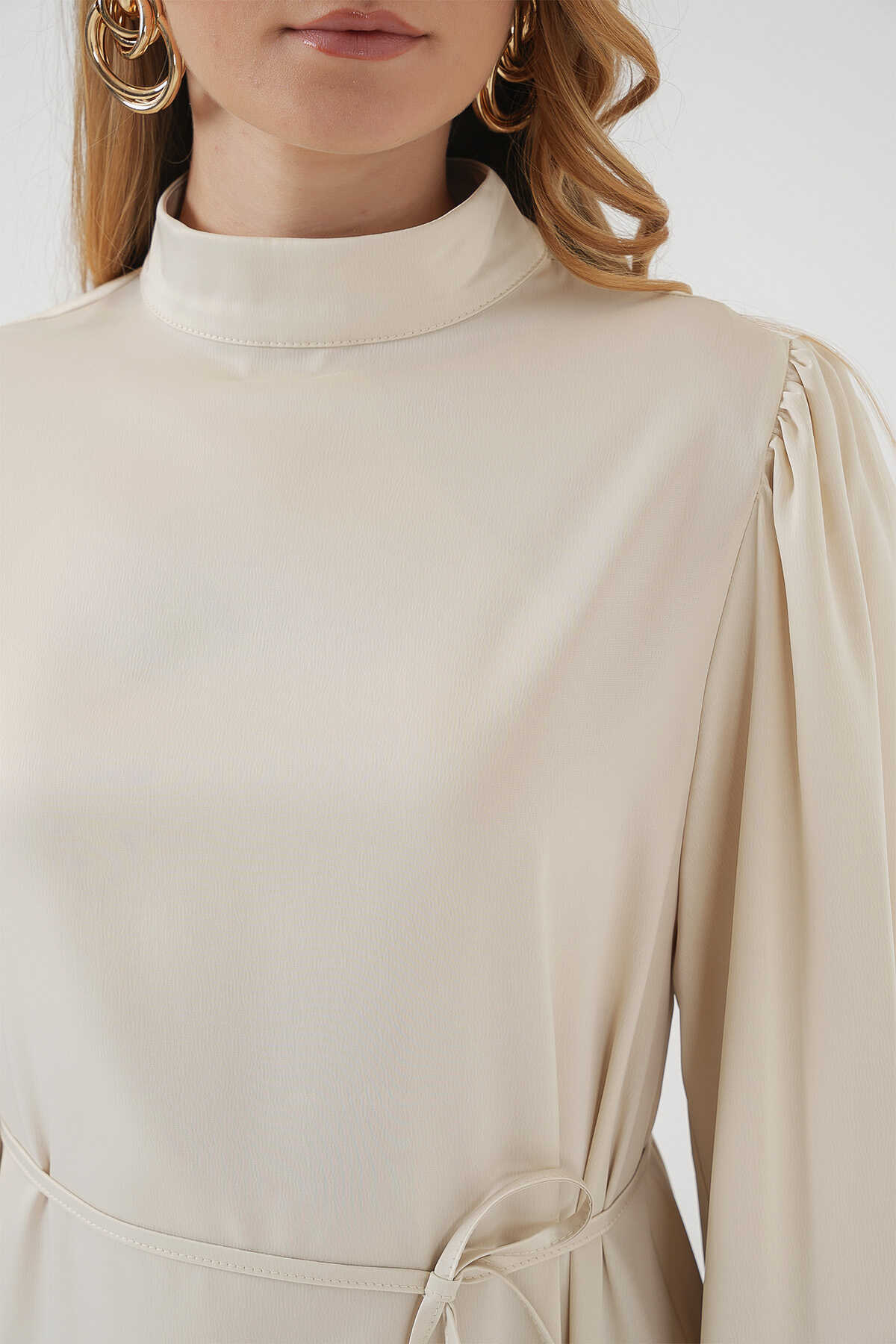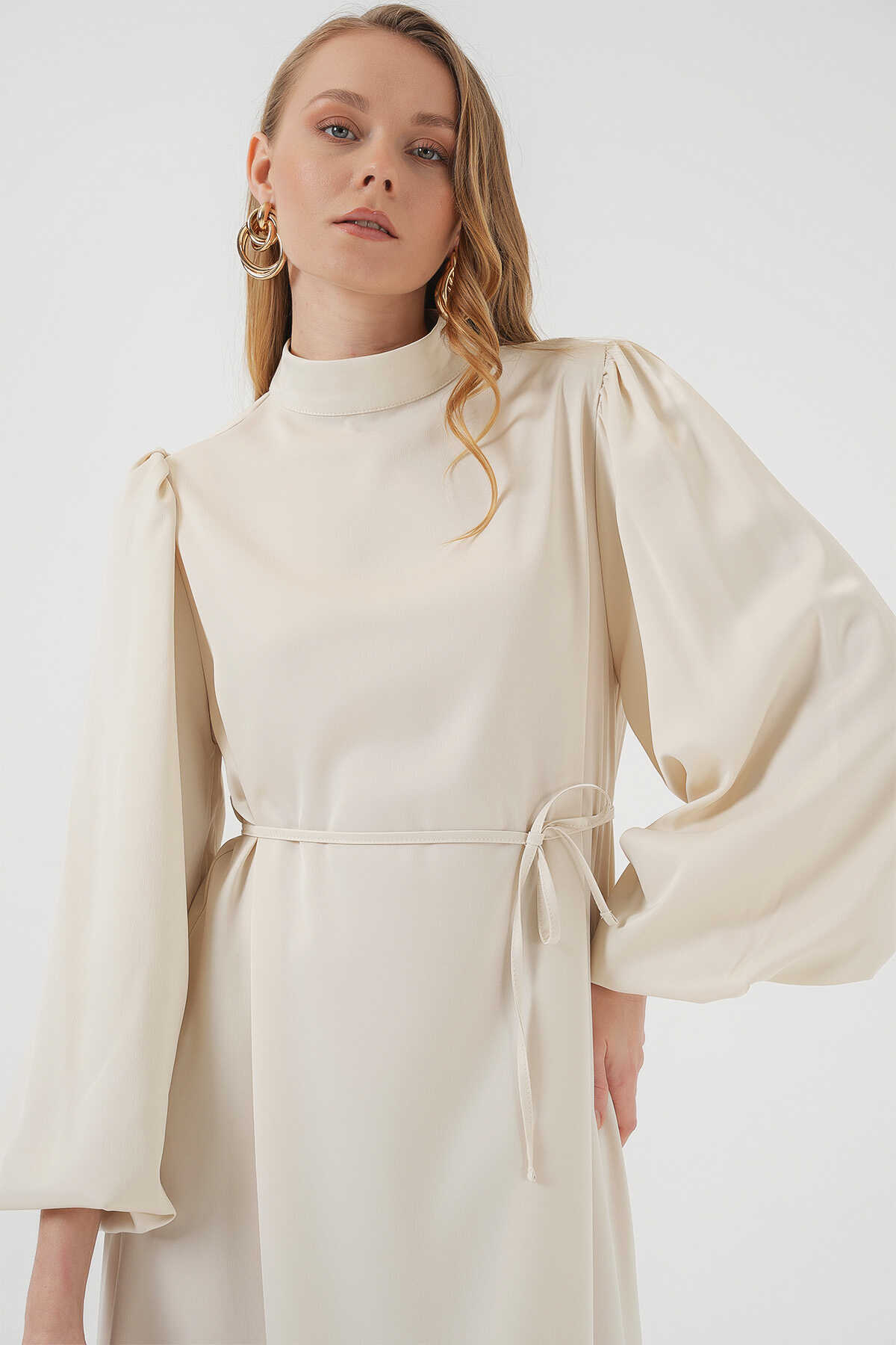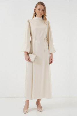 2510 Saten Tesettür Abiye Elbise - Ekru - Kombin