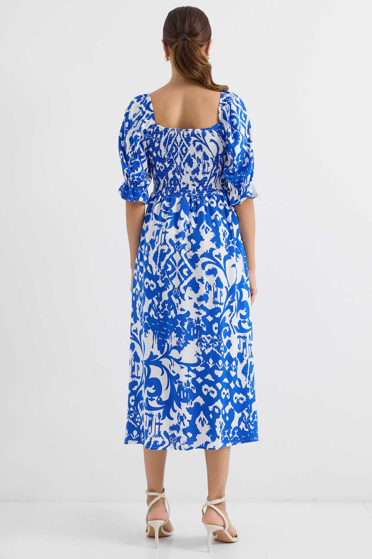 2512 Desenli Yırtmaçlı Elbise - Saks - Kombin