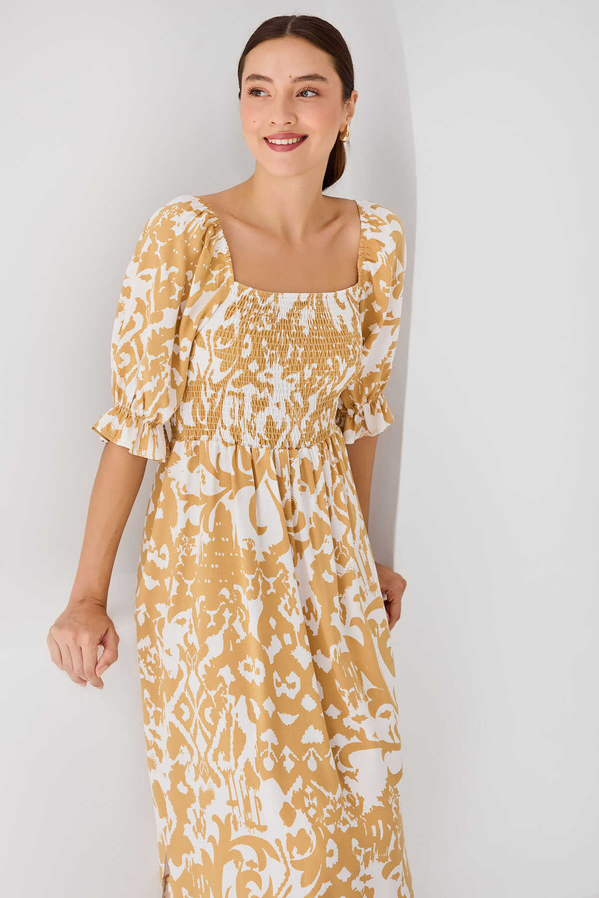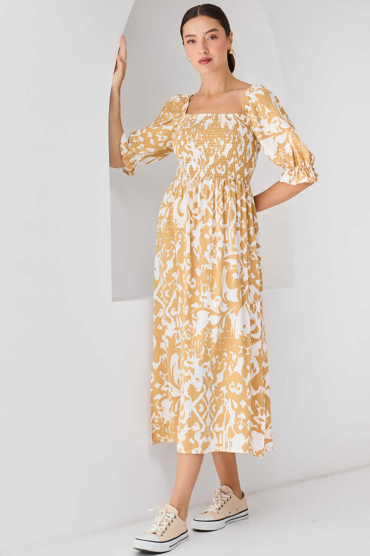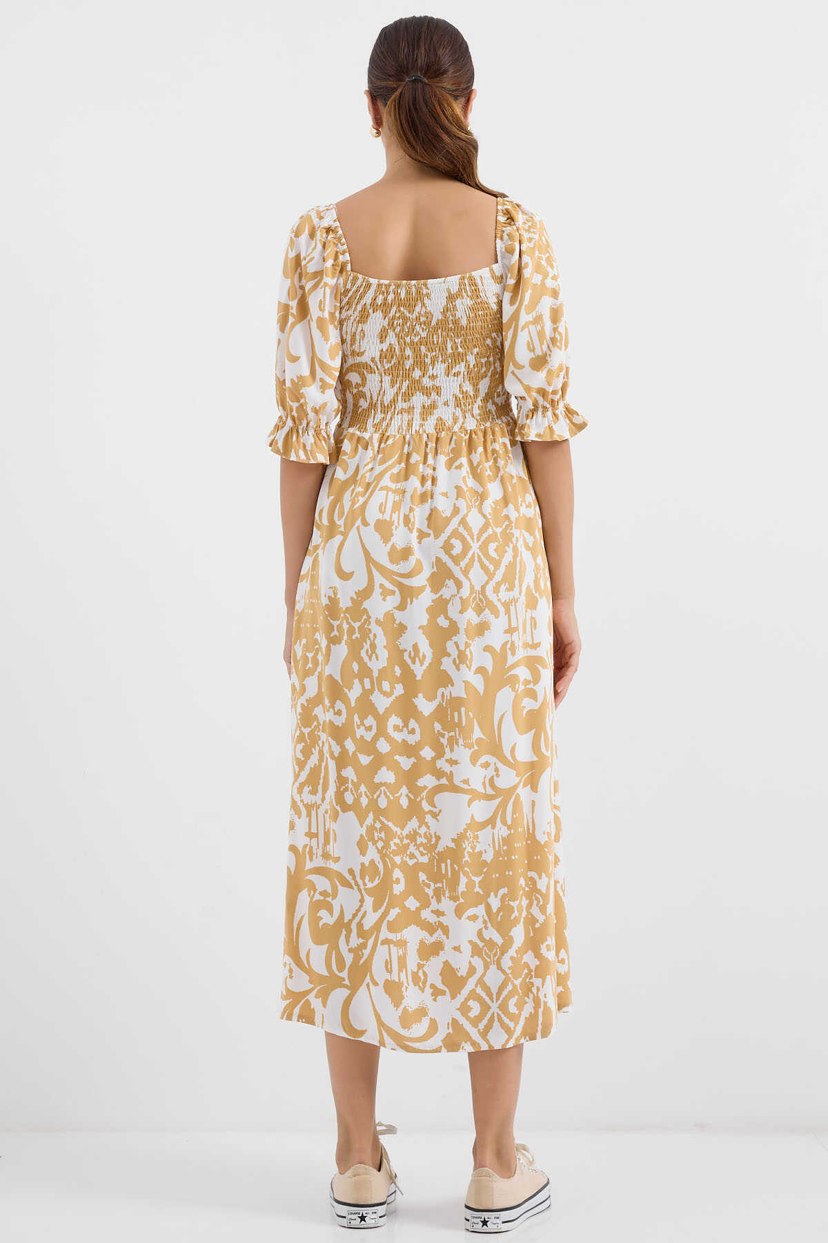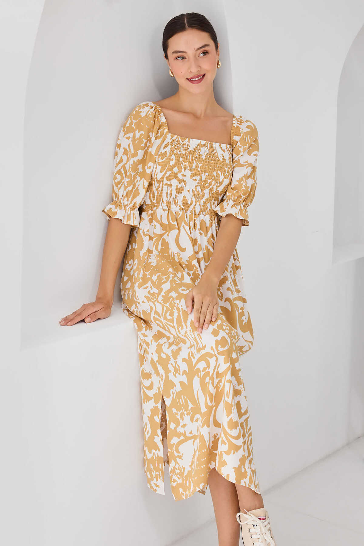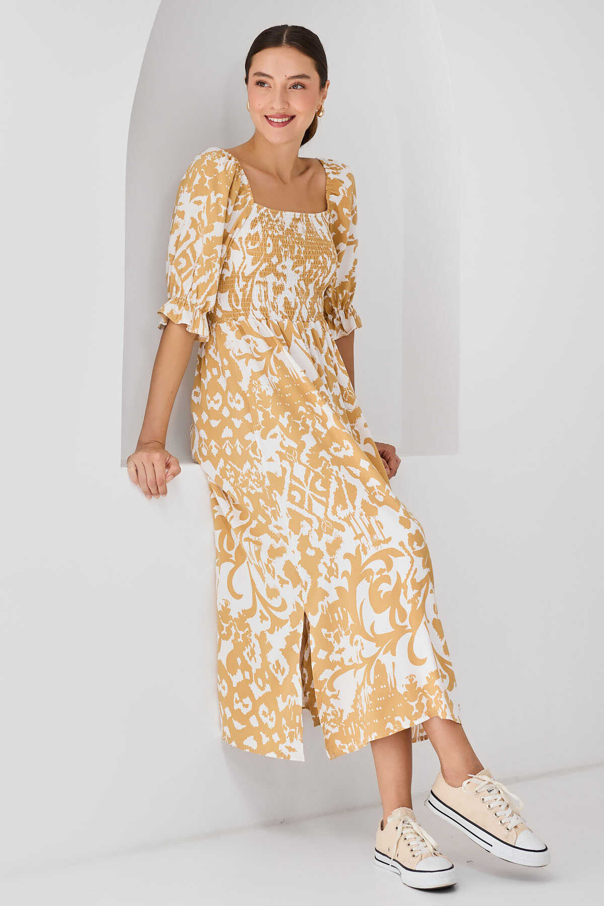 2512 Desenli Yırtmaçlı Elbise - Sarı - Kombin