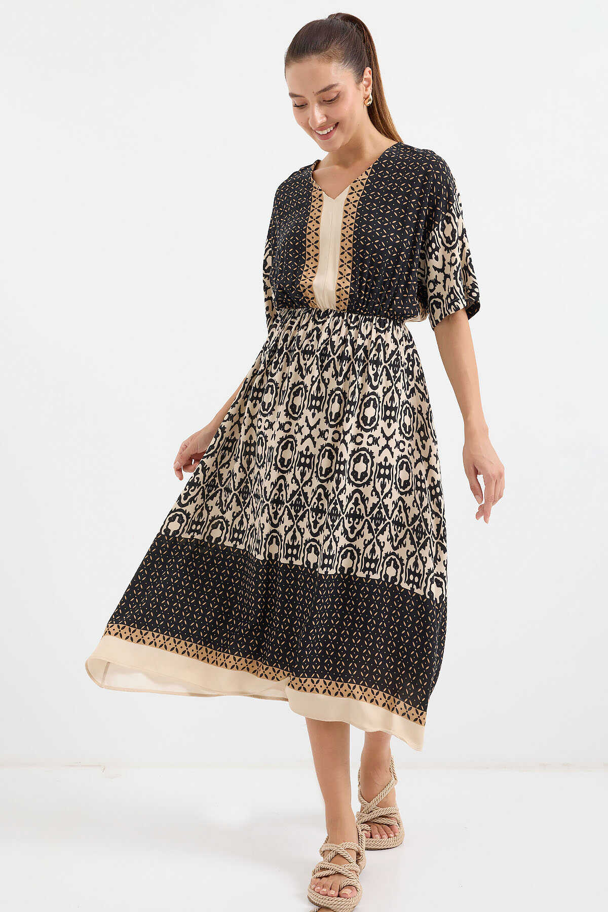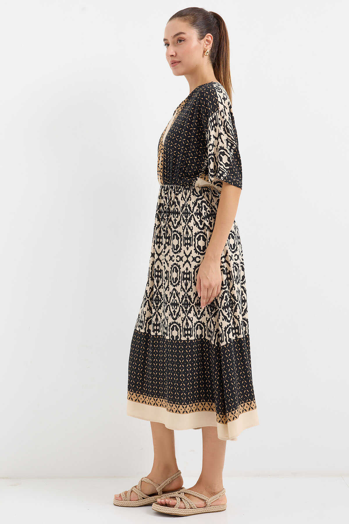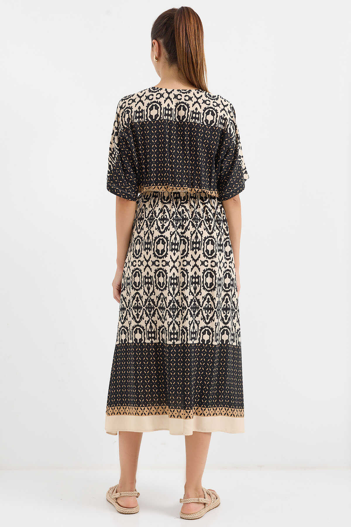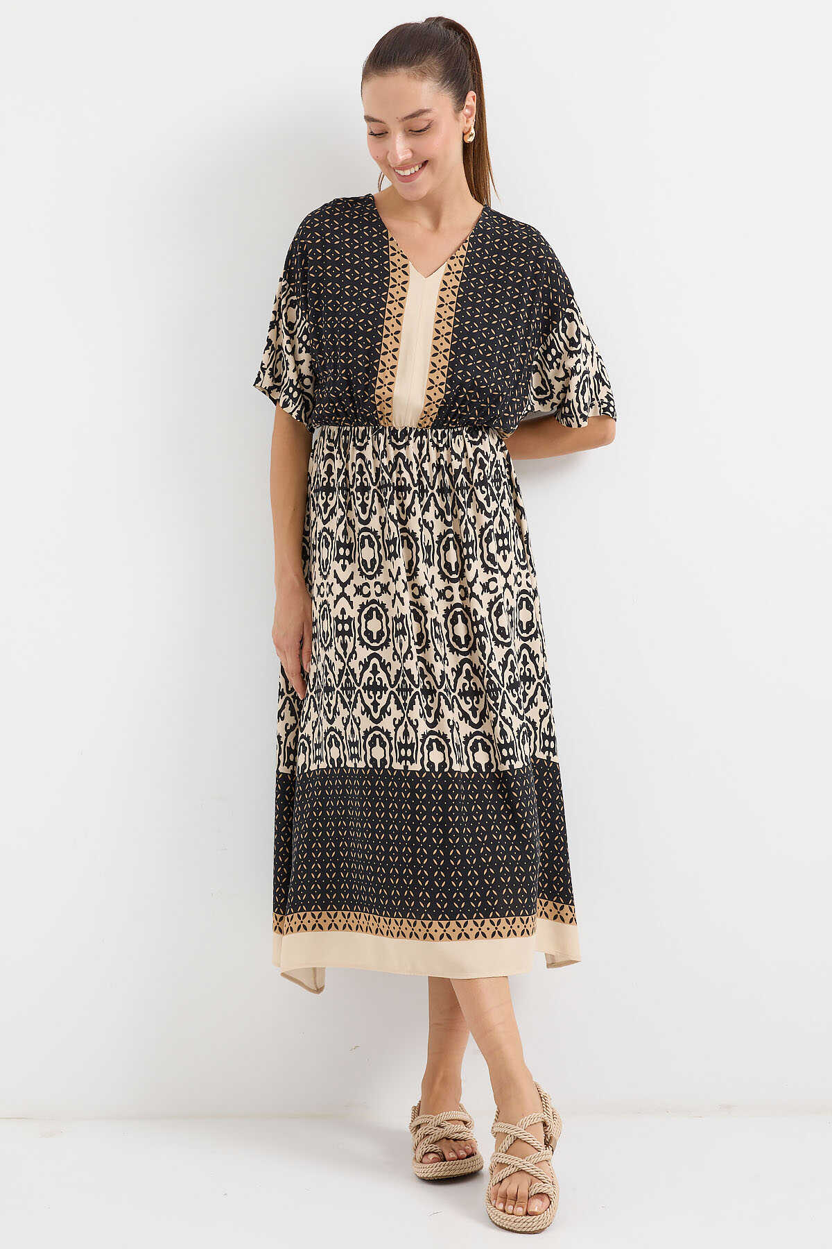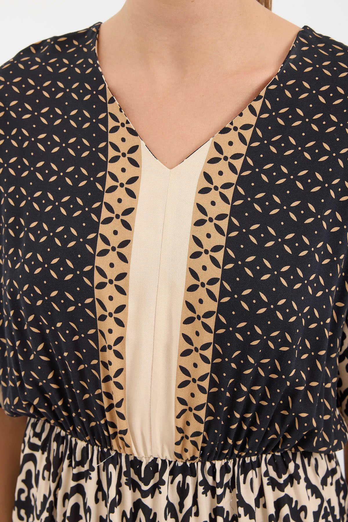 Desenli Kisa Kol Viskon Elbise