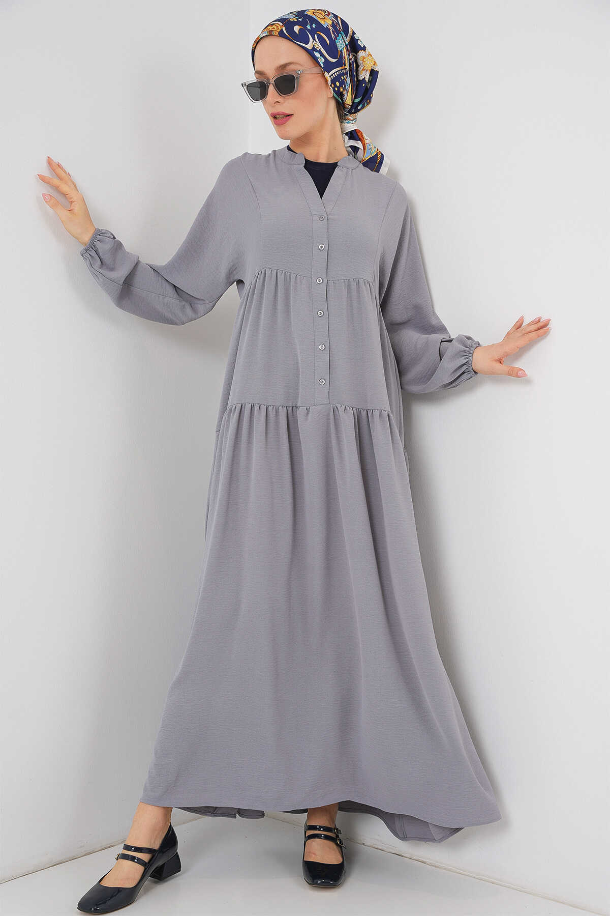 2527 Kadın Uzun Tesettür Elbise - Gri - Kombin