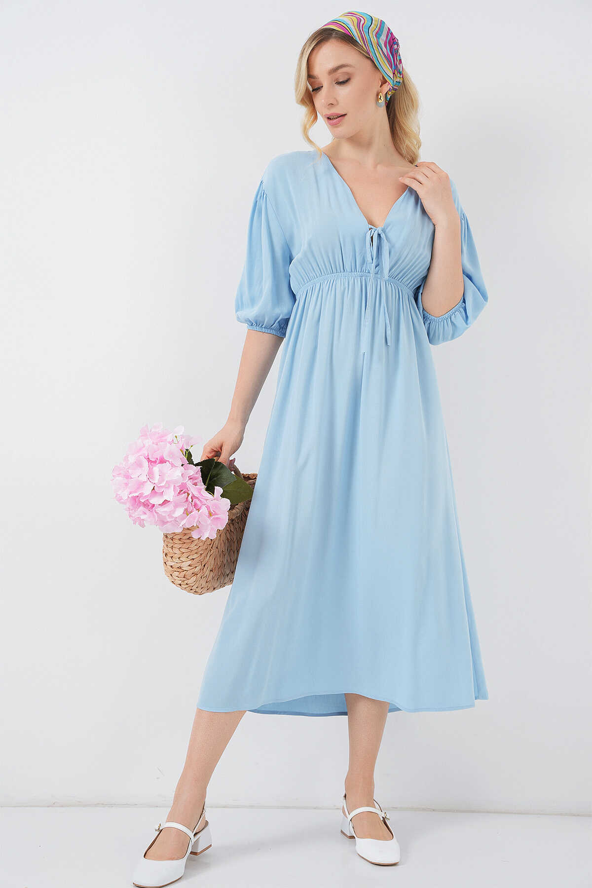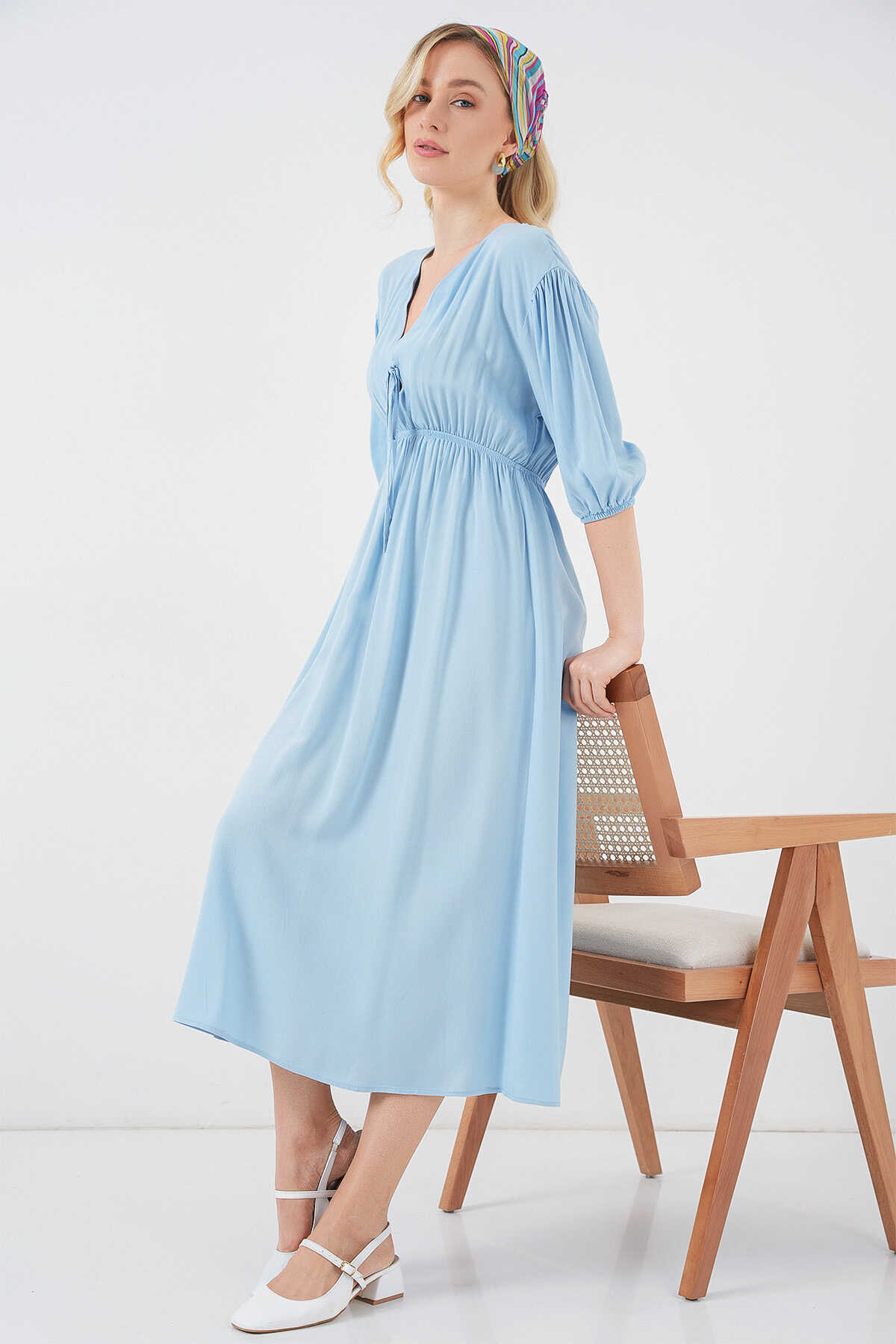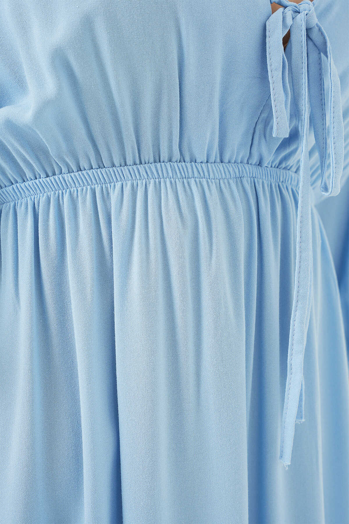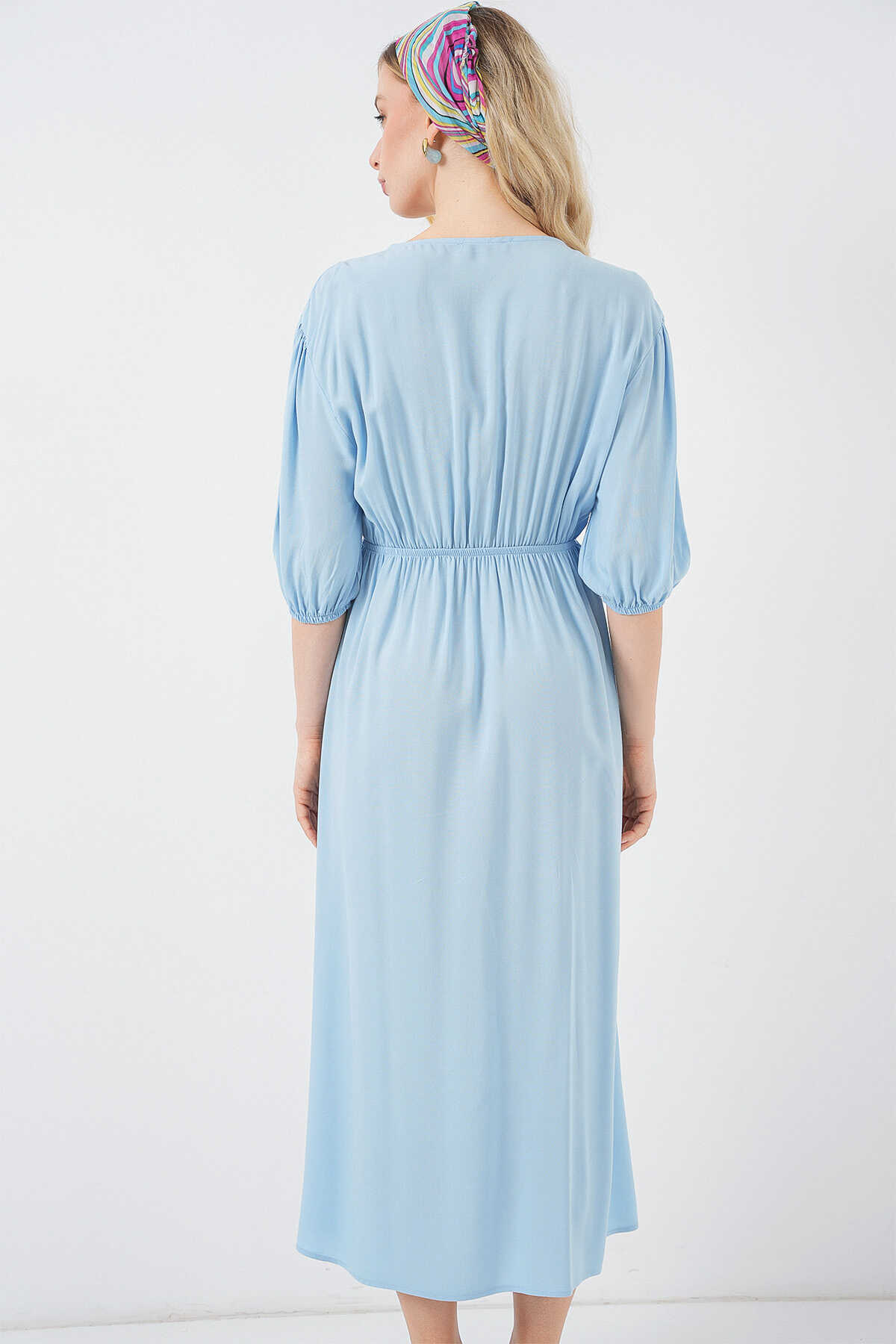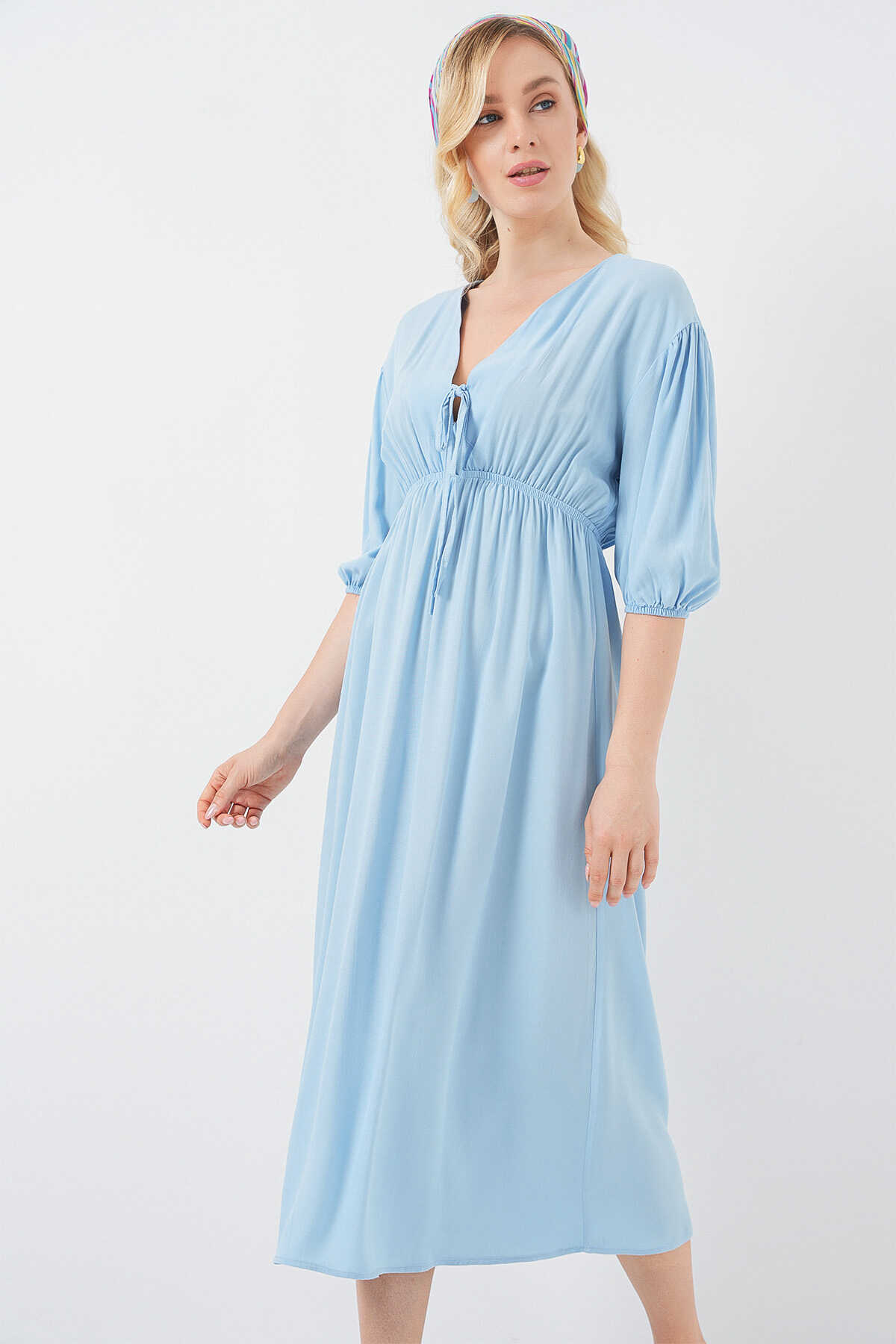 2570 Kadın Beli Büzgülü V Yaka Elbise - Mavi - Kombin