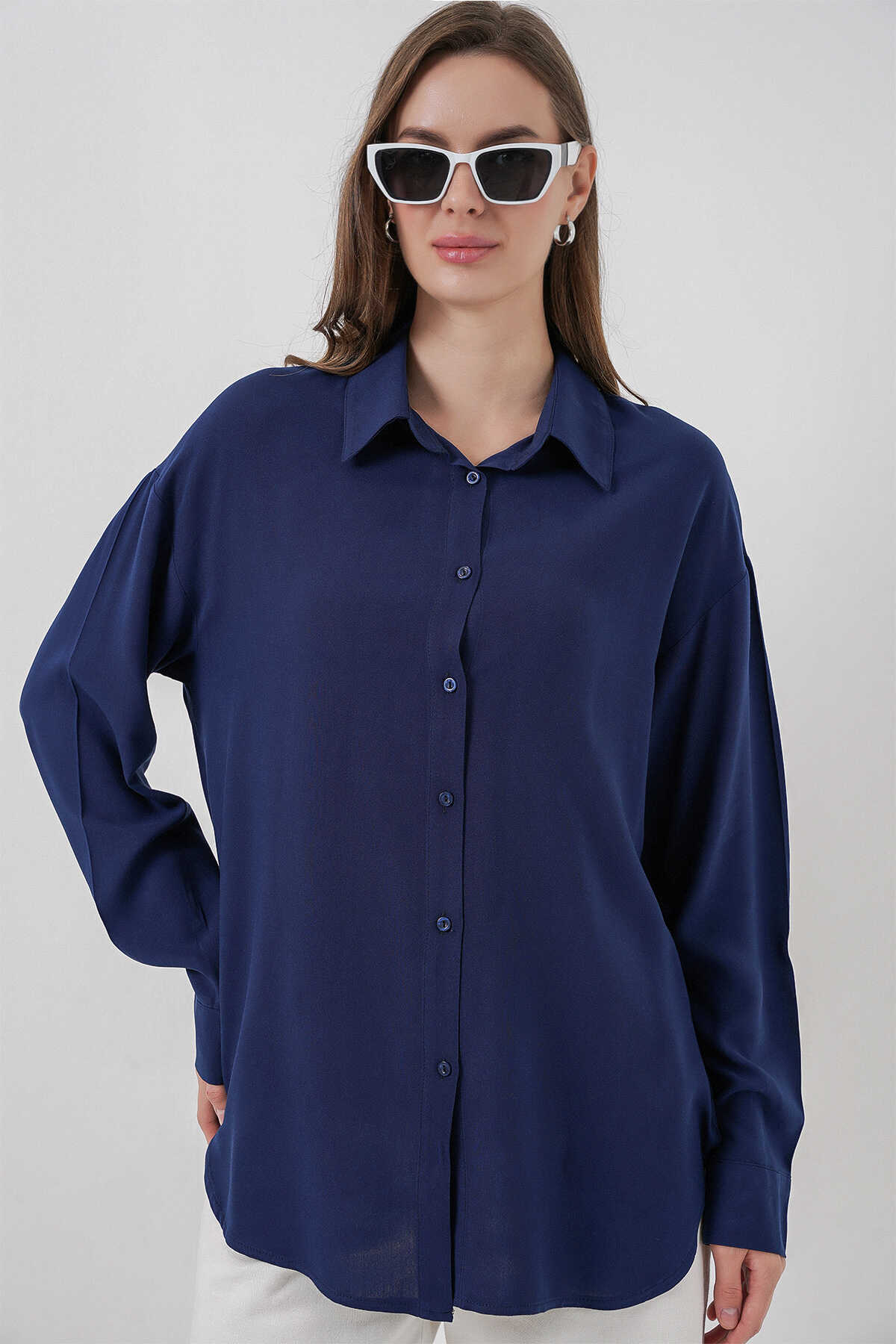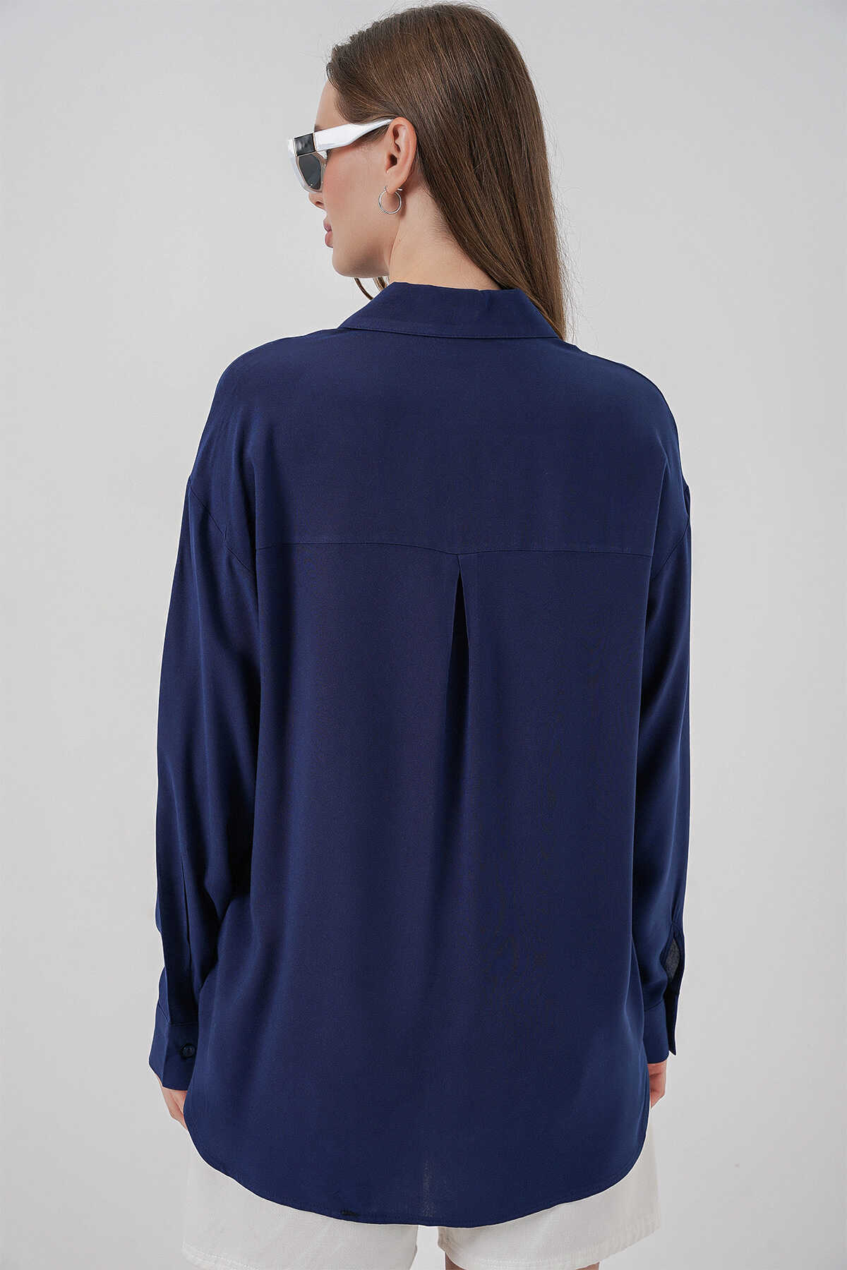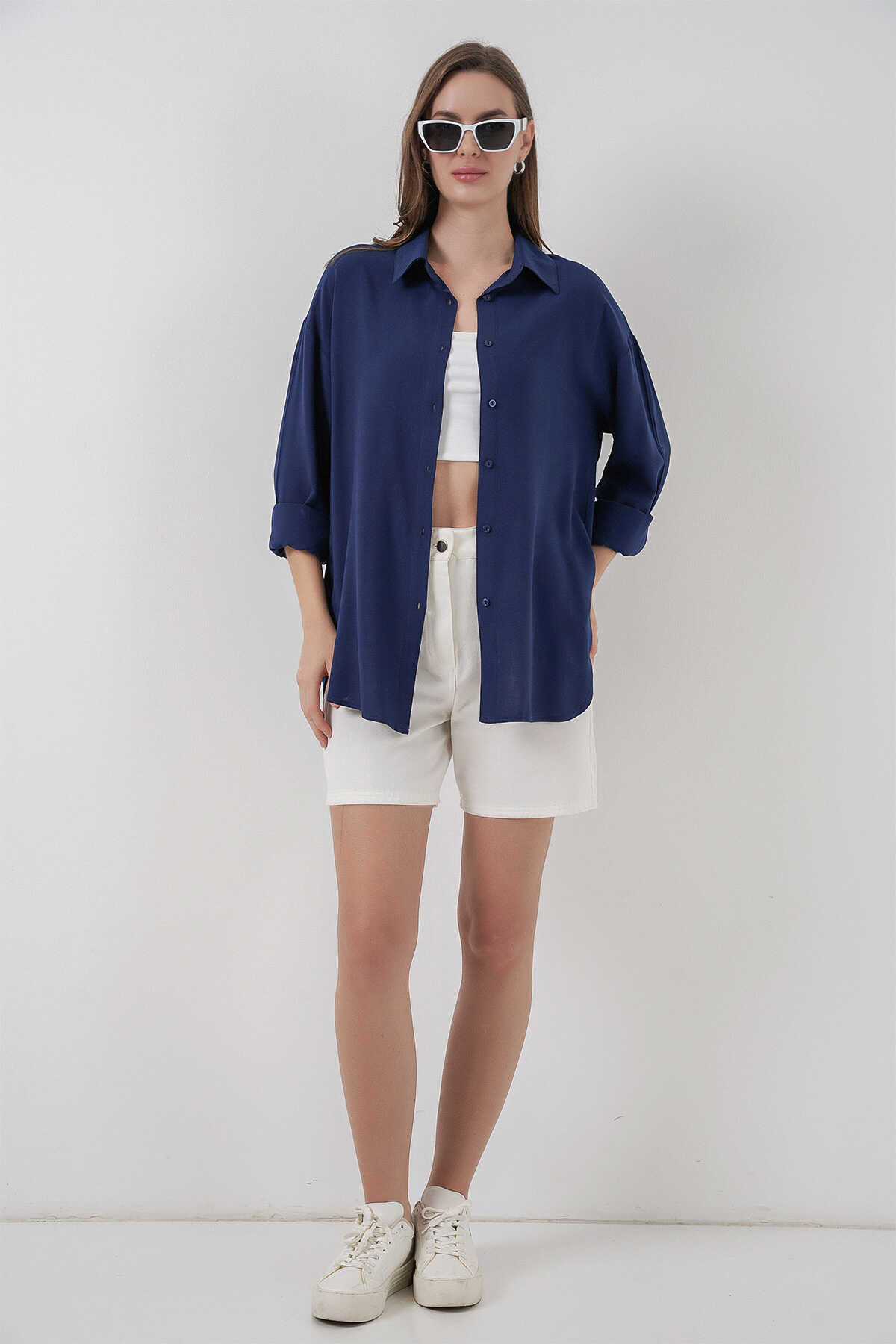 Kadın Oversize Viskon Gömlek 3785 - Lacivert - Kombin