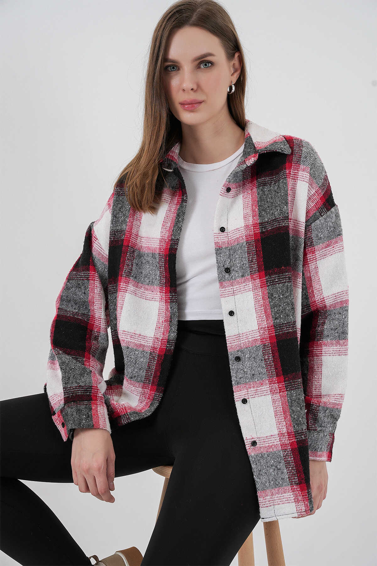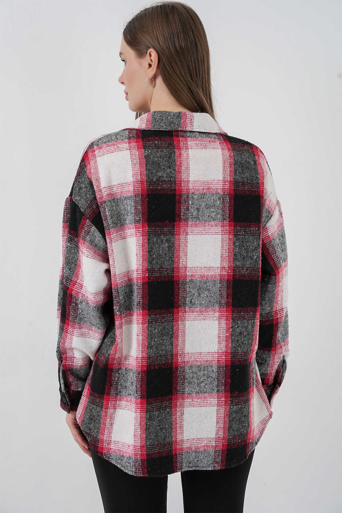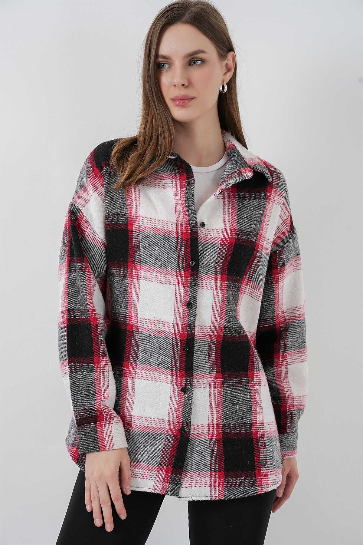 Kadin Ekose Desen Dügmeli Oversize Oduncu Gömlek