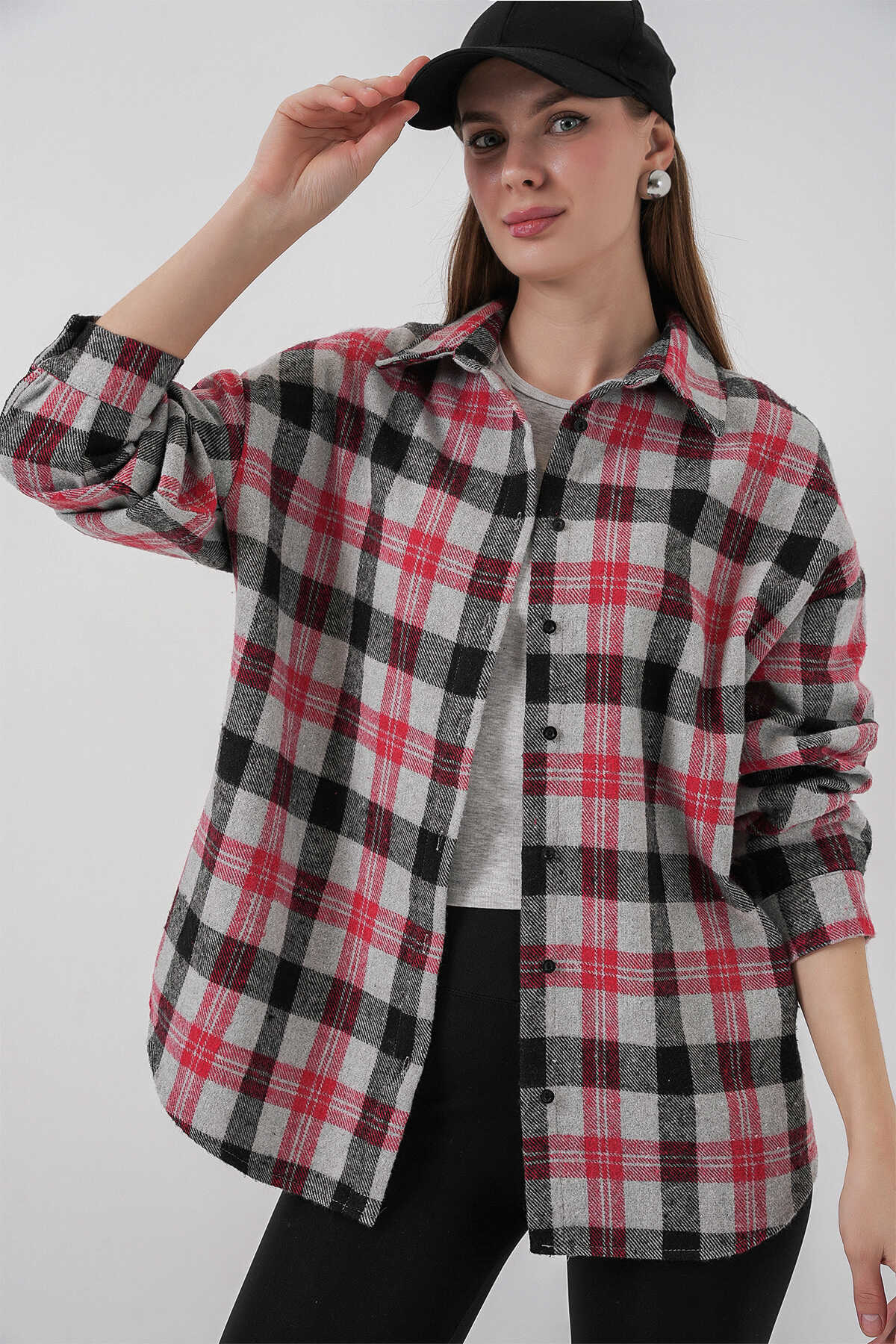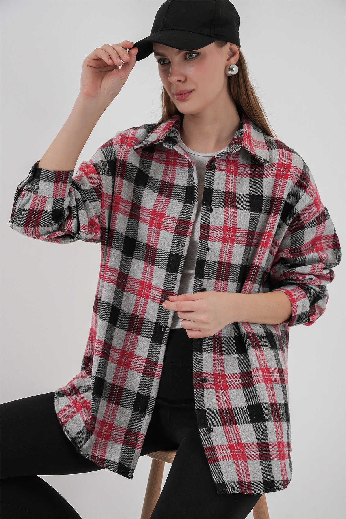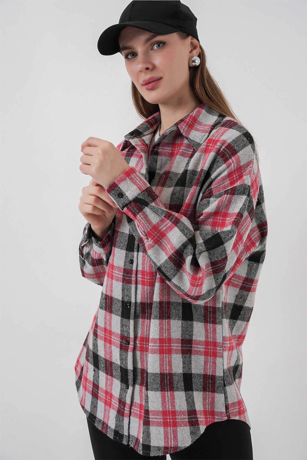 Kadin Ekose Desen Dügmeli Oversize Oduncu Gömlek