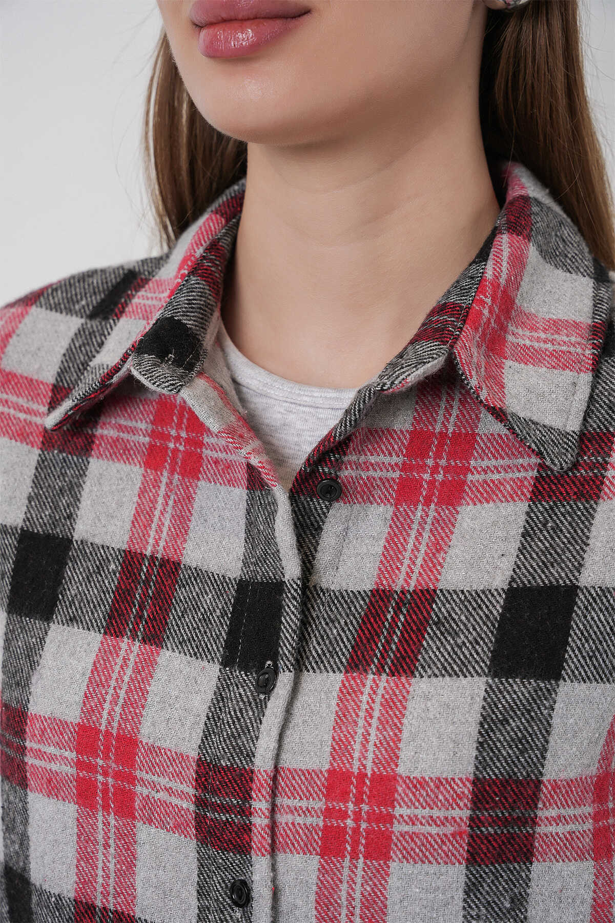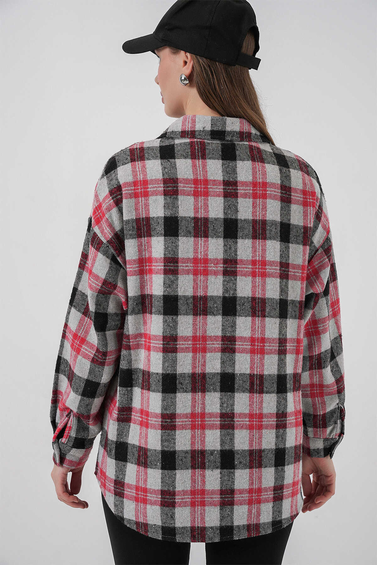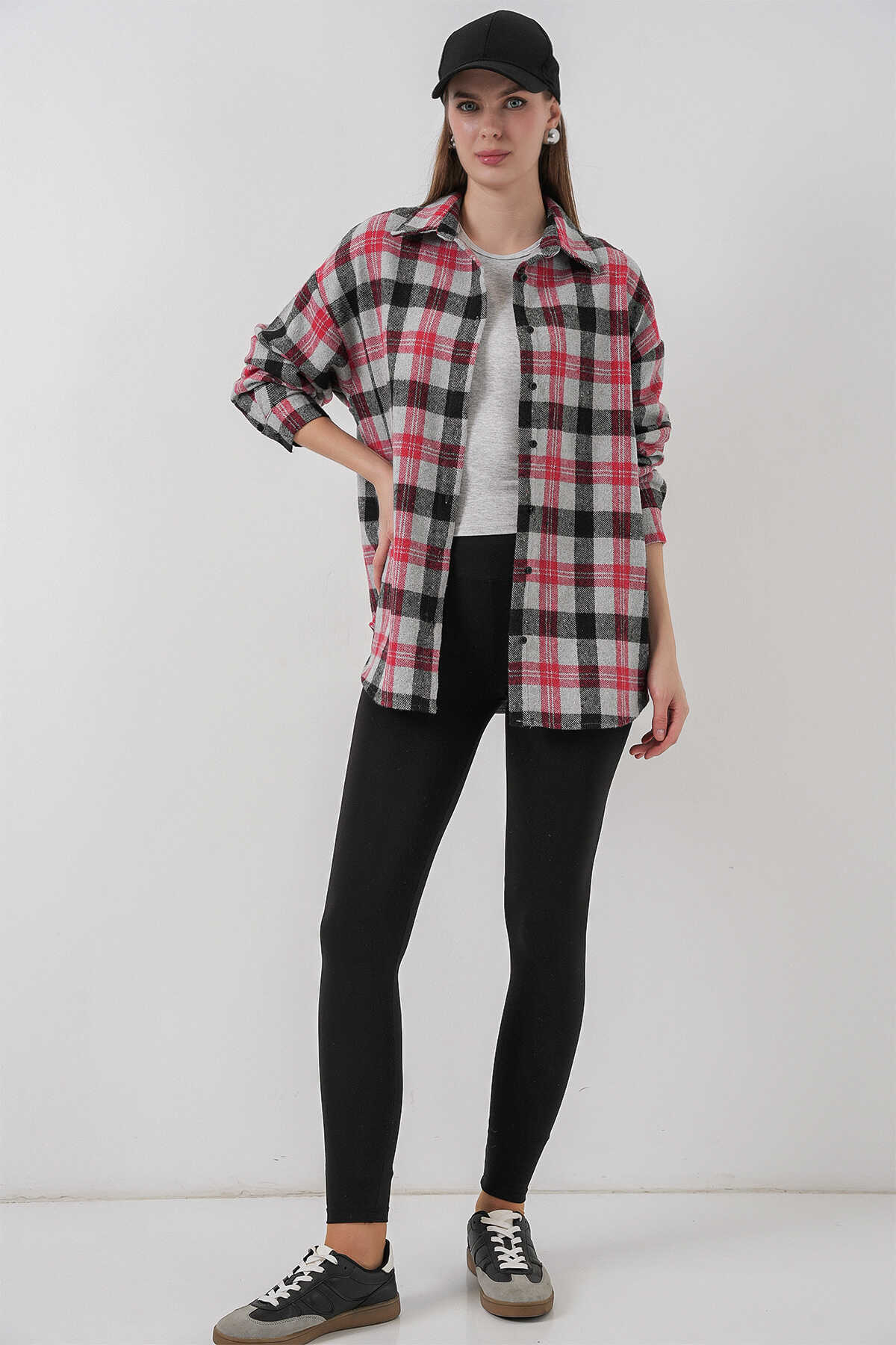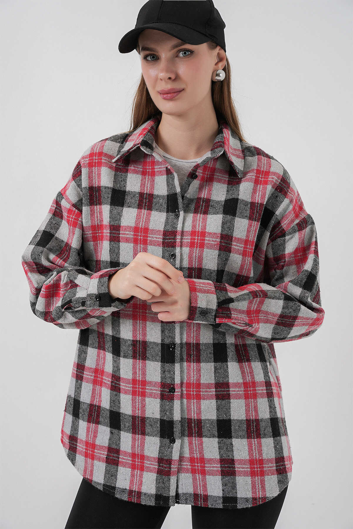 Kadin Ekose Desen Dügmeli Oversize Oduncu Gömlek