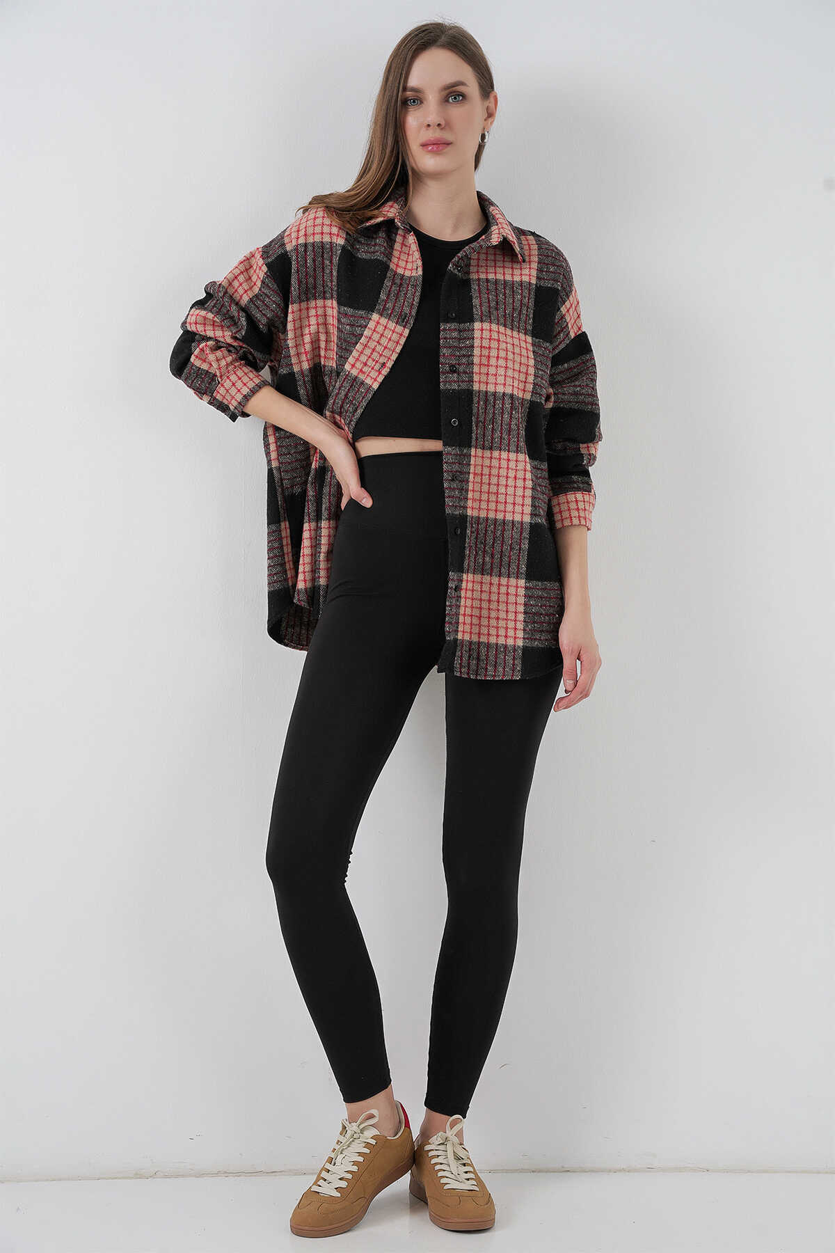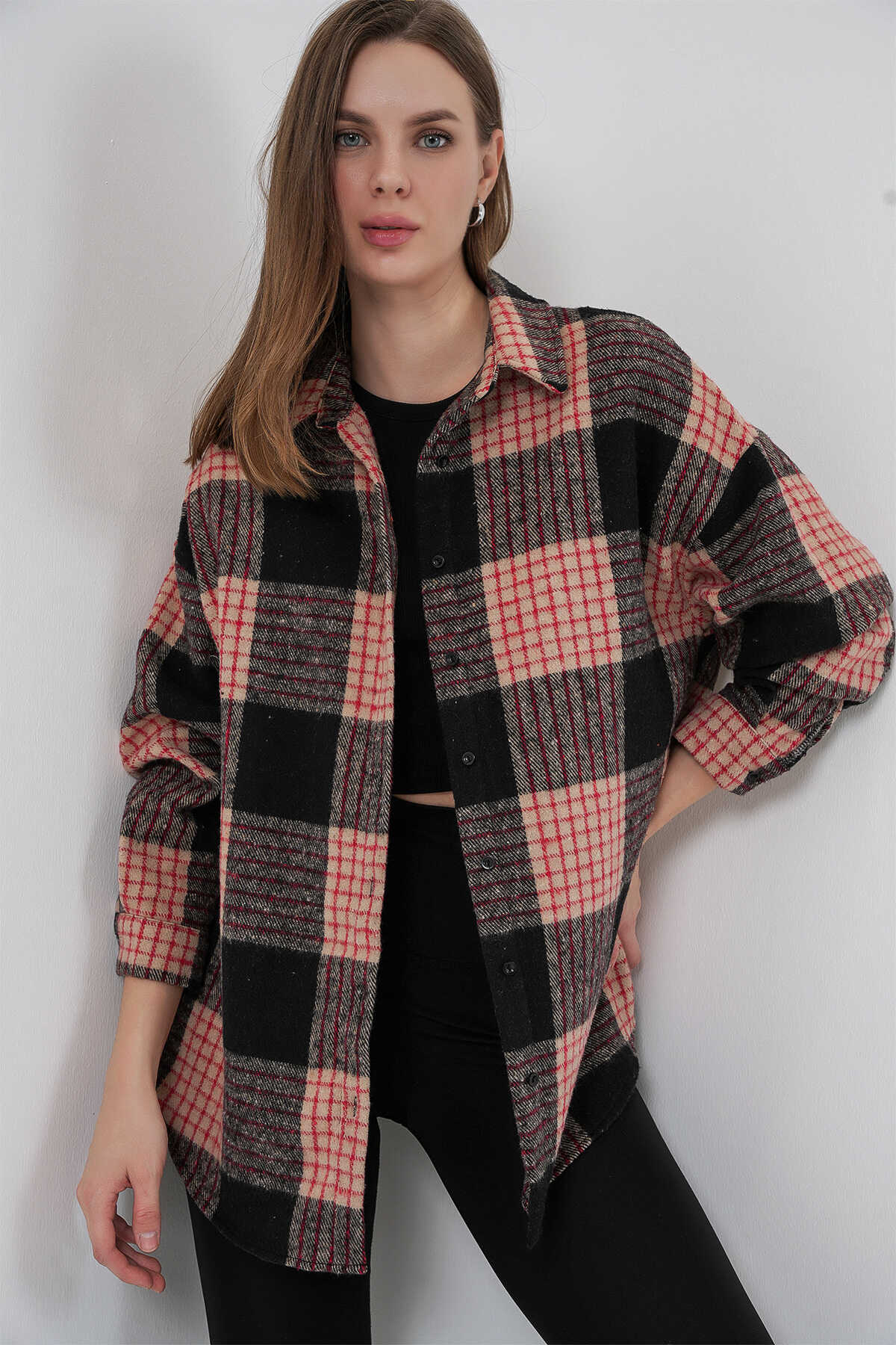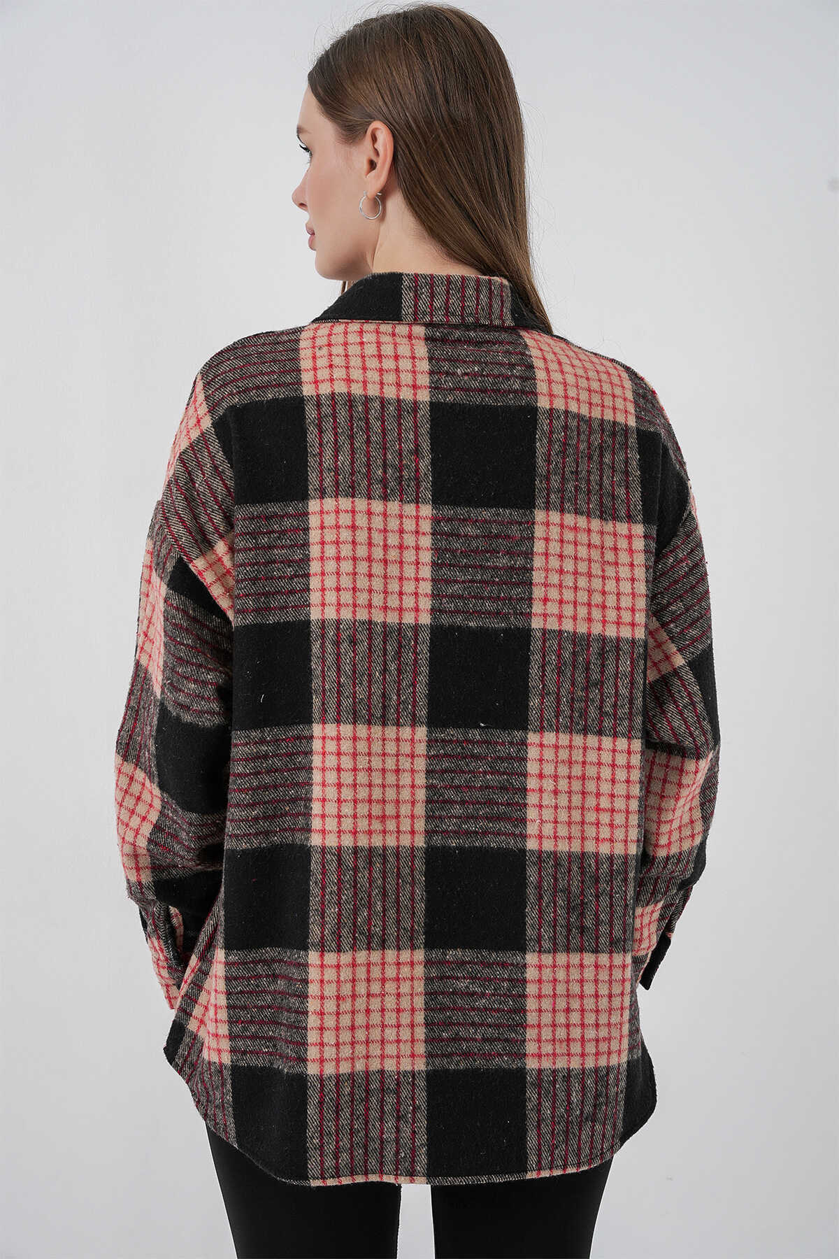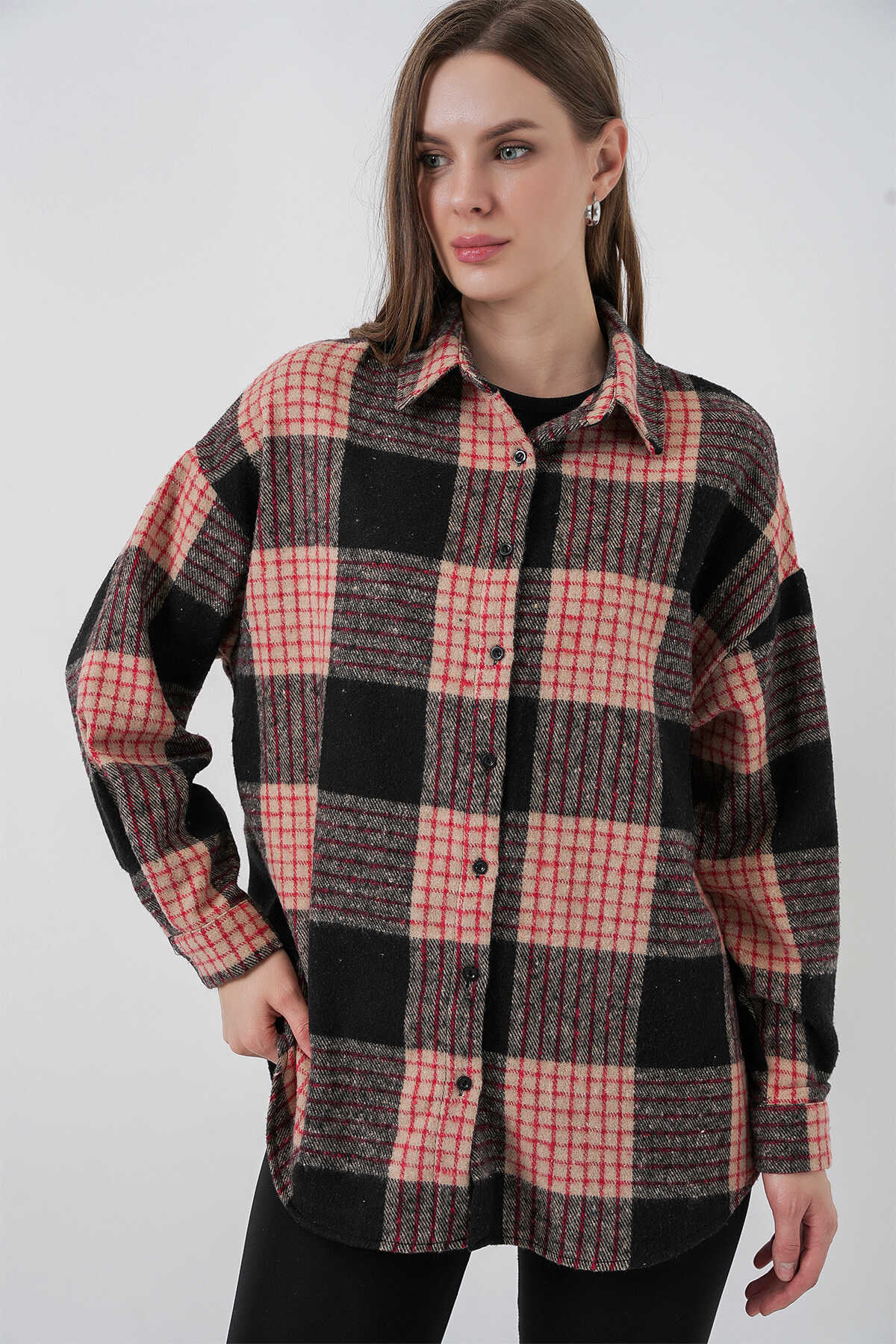 Kadin Ekose Desen Dügmeli Oversize Oduncu Gömlek