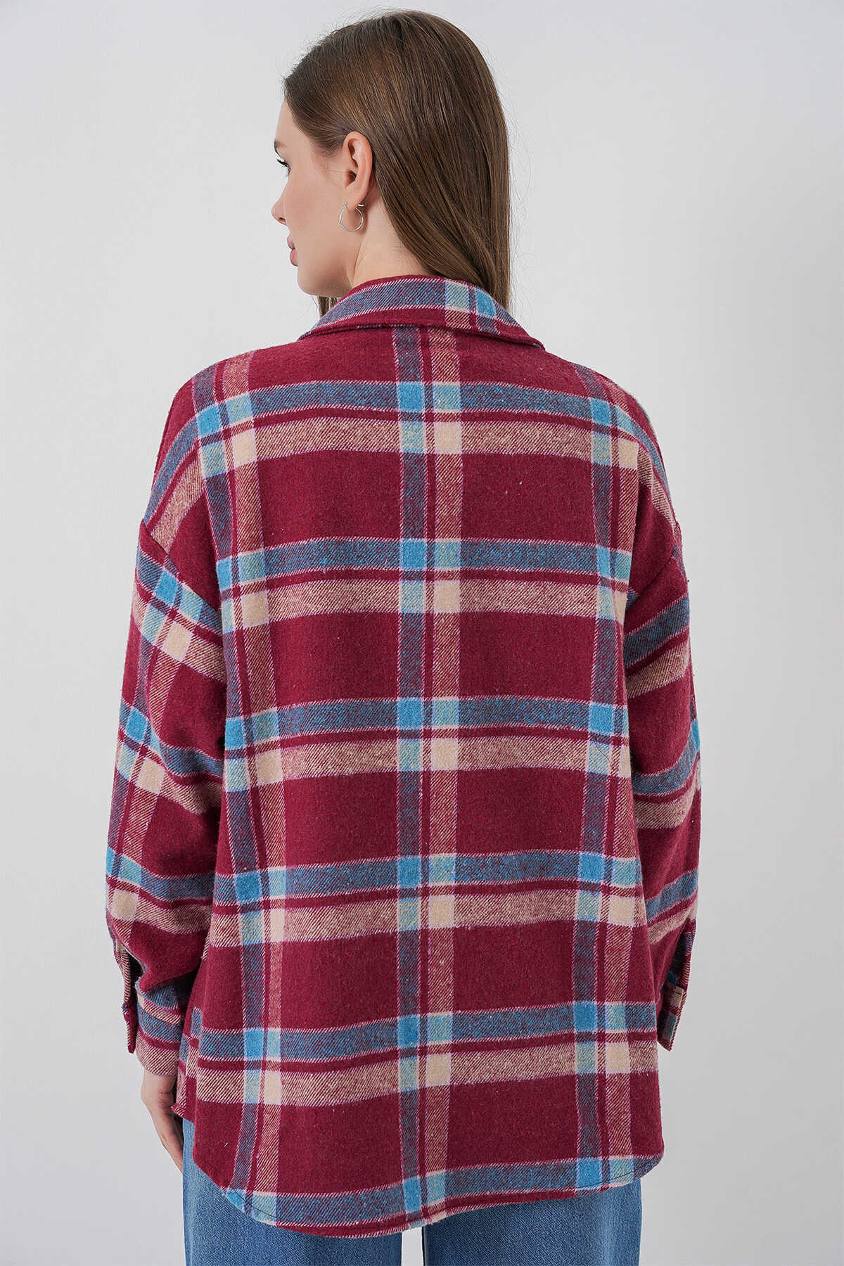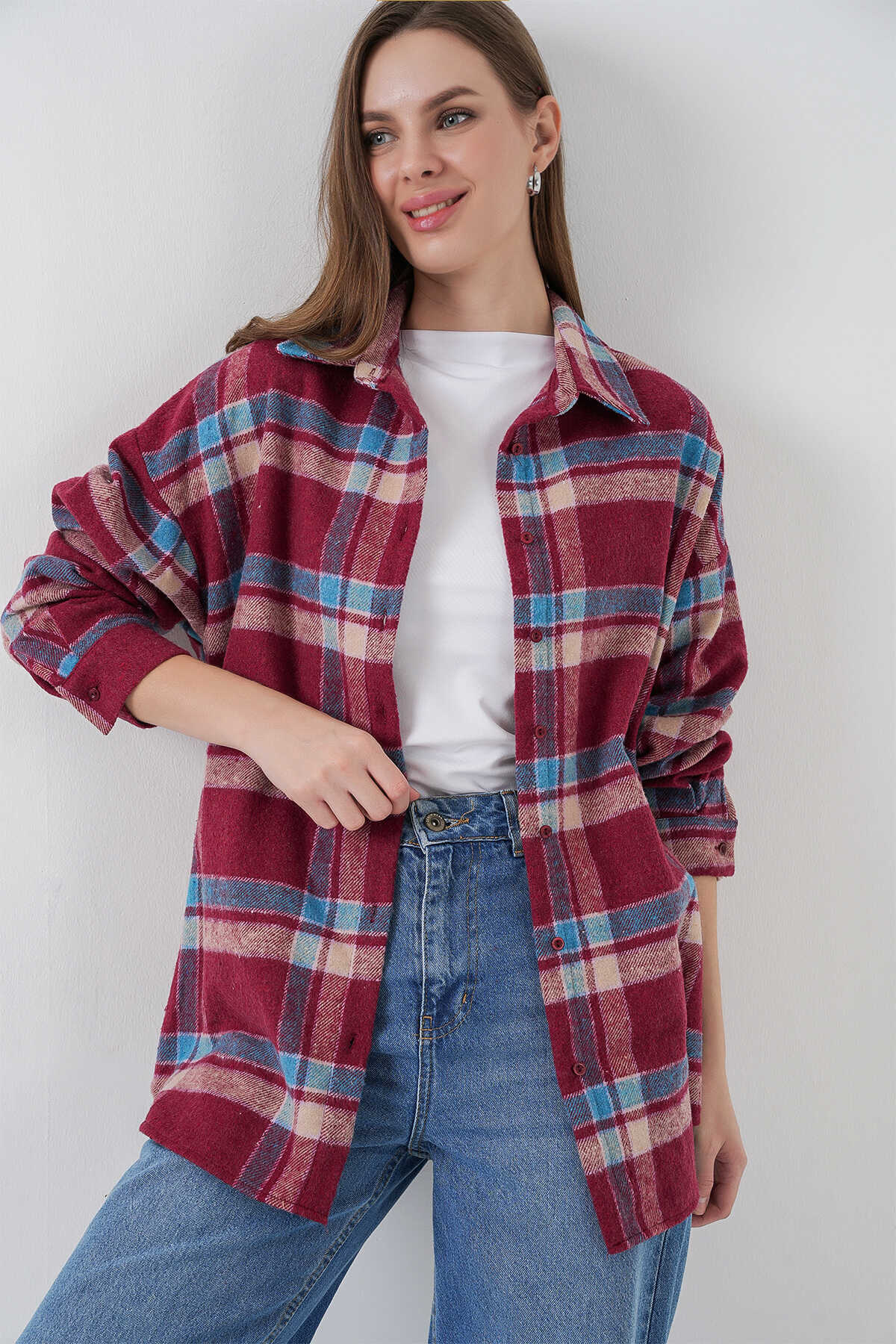 Kadin Ekose Desen Dügmeli Oversize Oduncu Gömlek