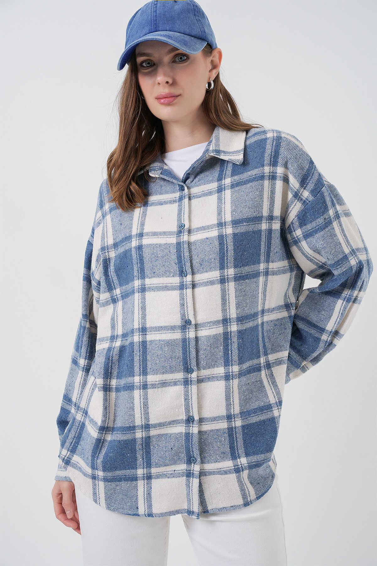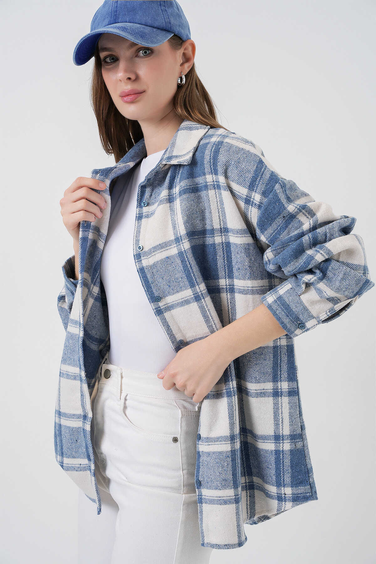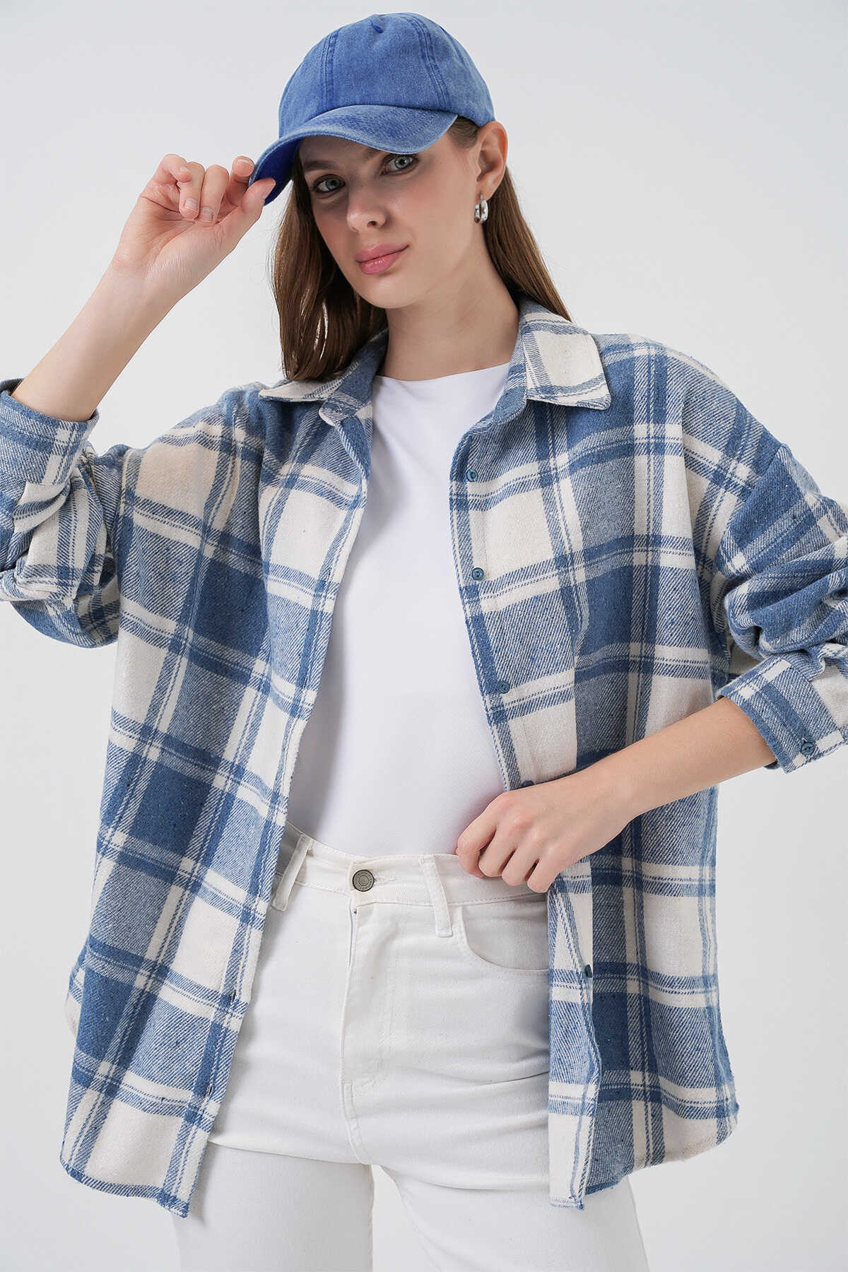 Kadin Ekose Desen Dügmeli Oversize Oduncu Gömlek