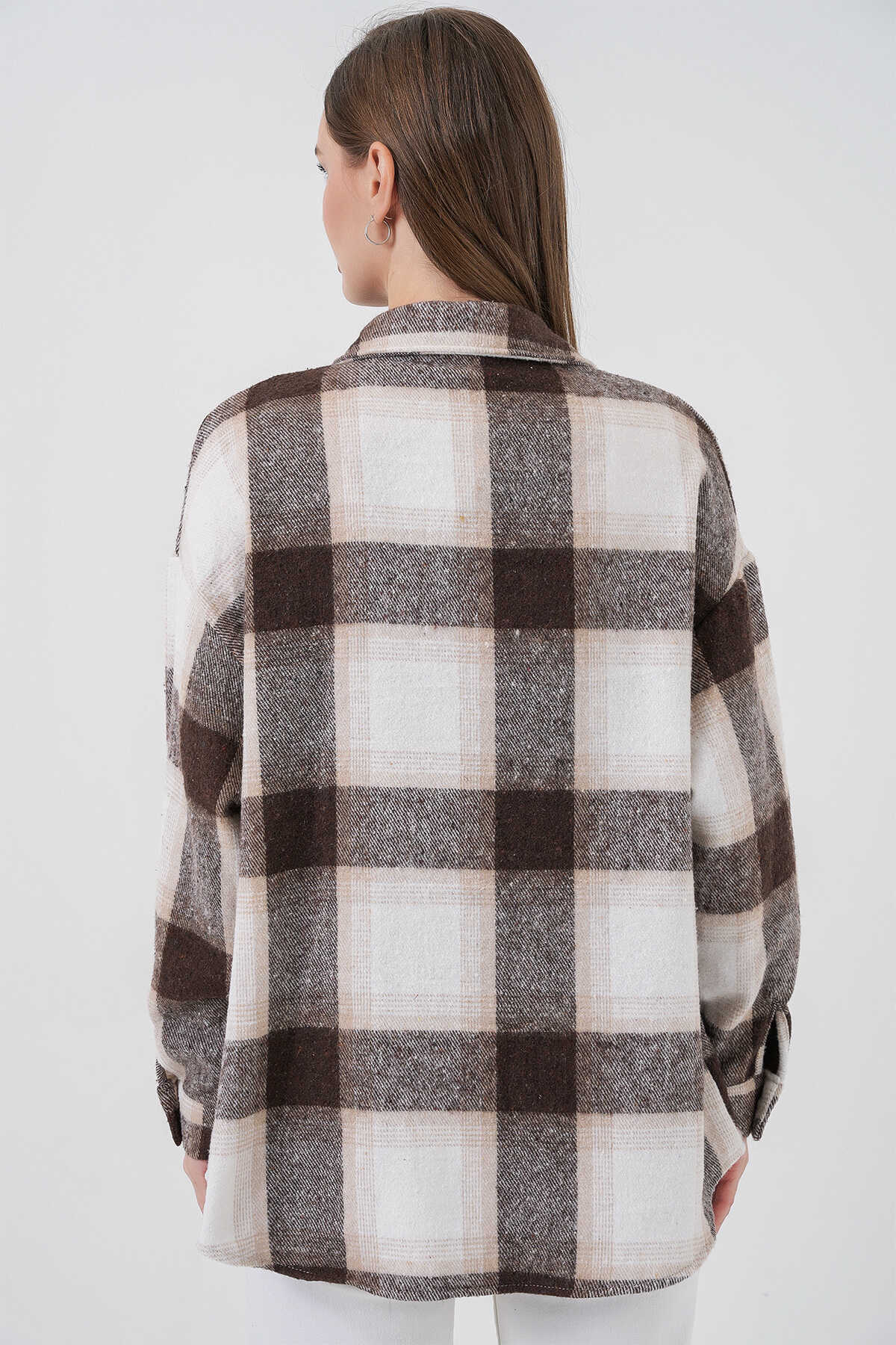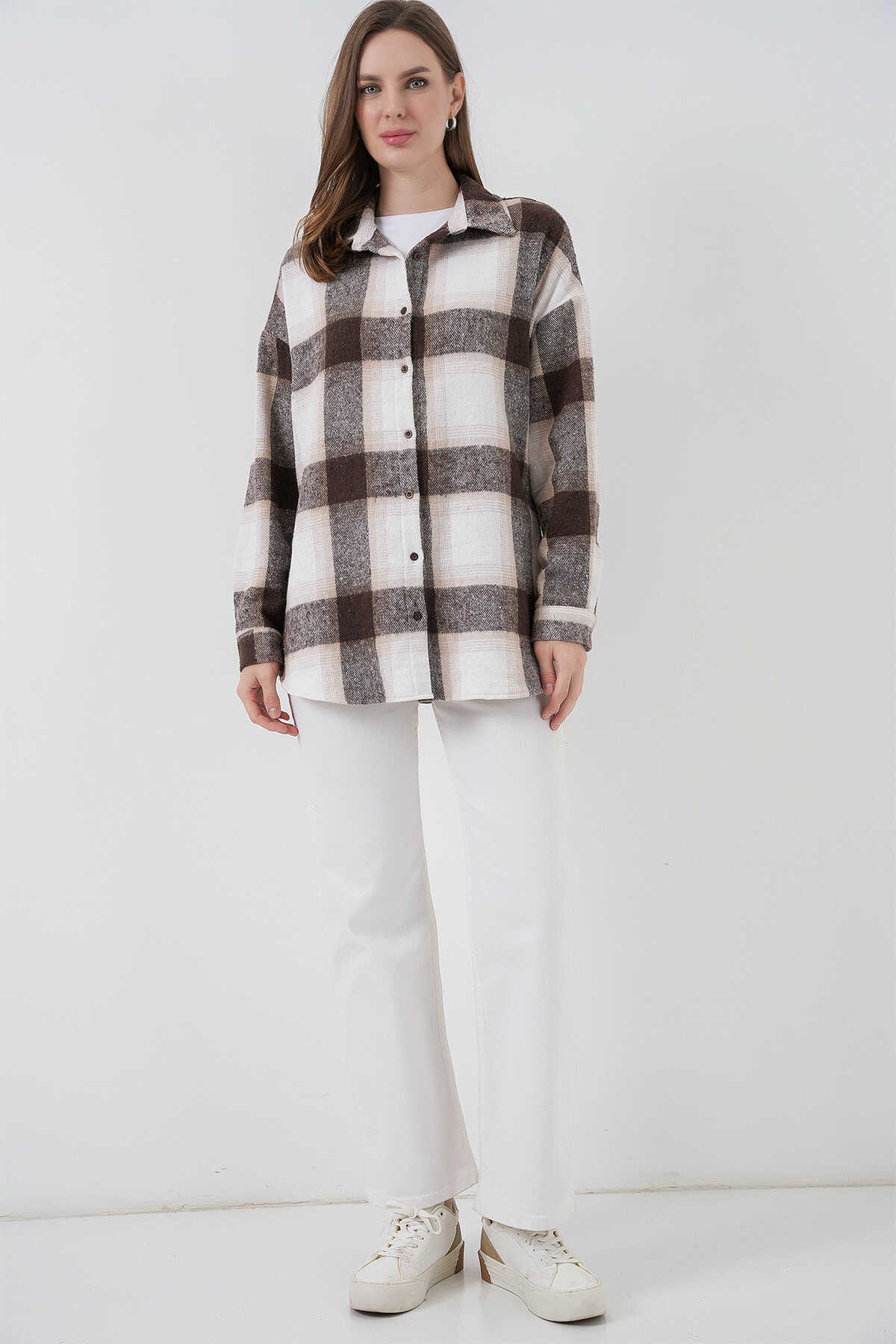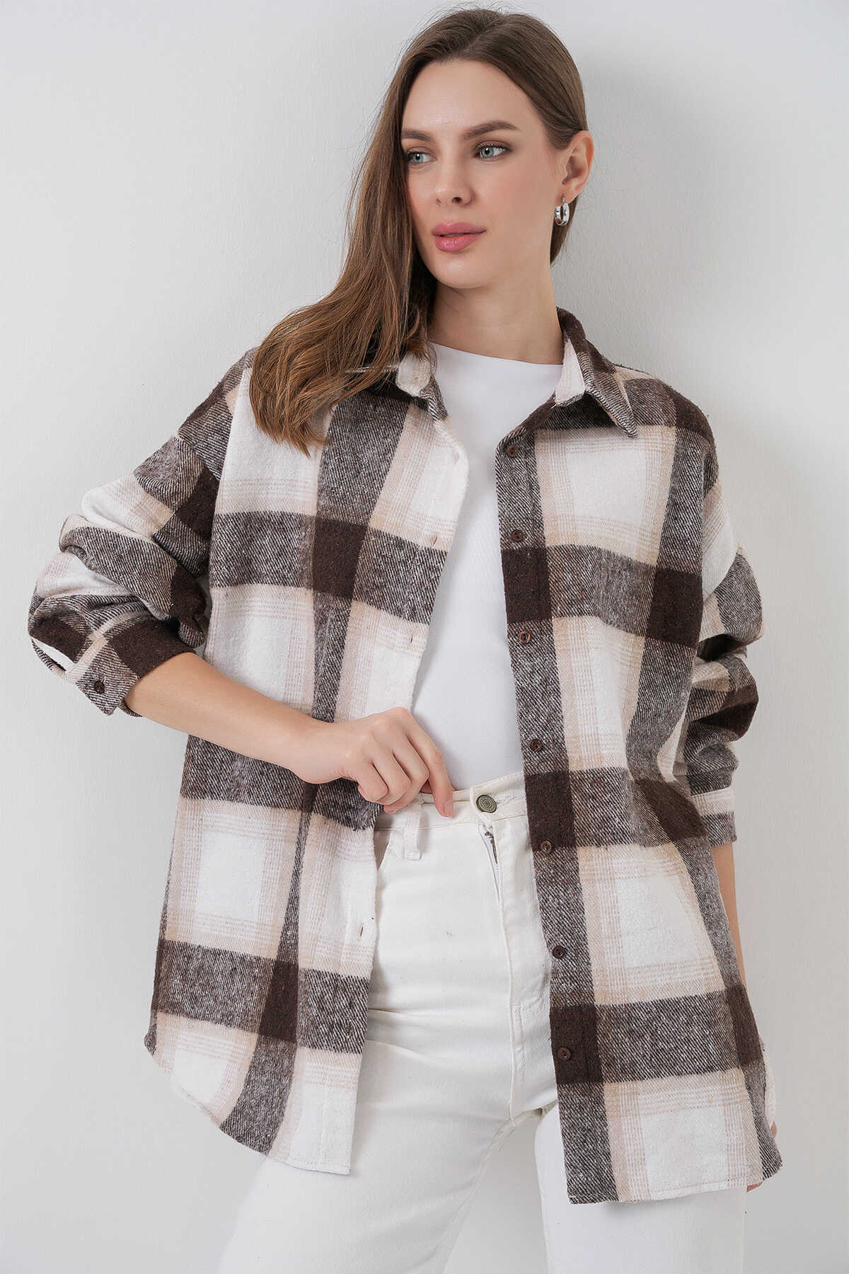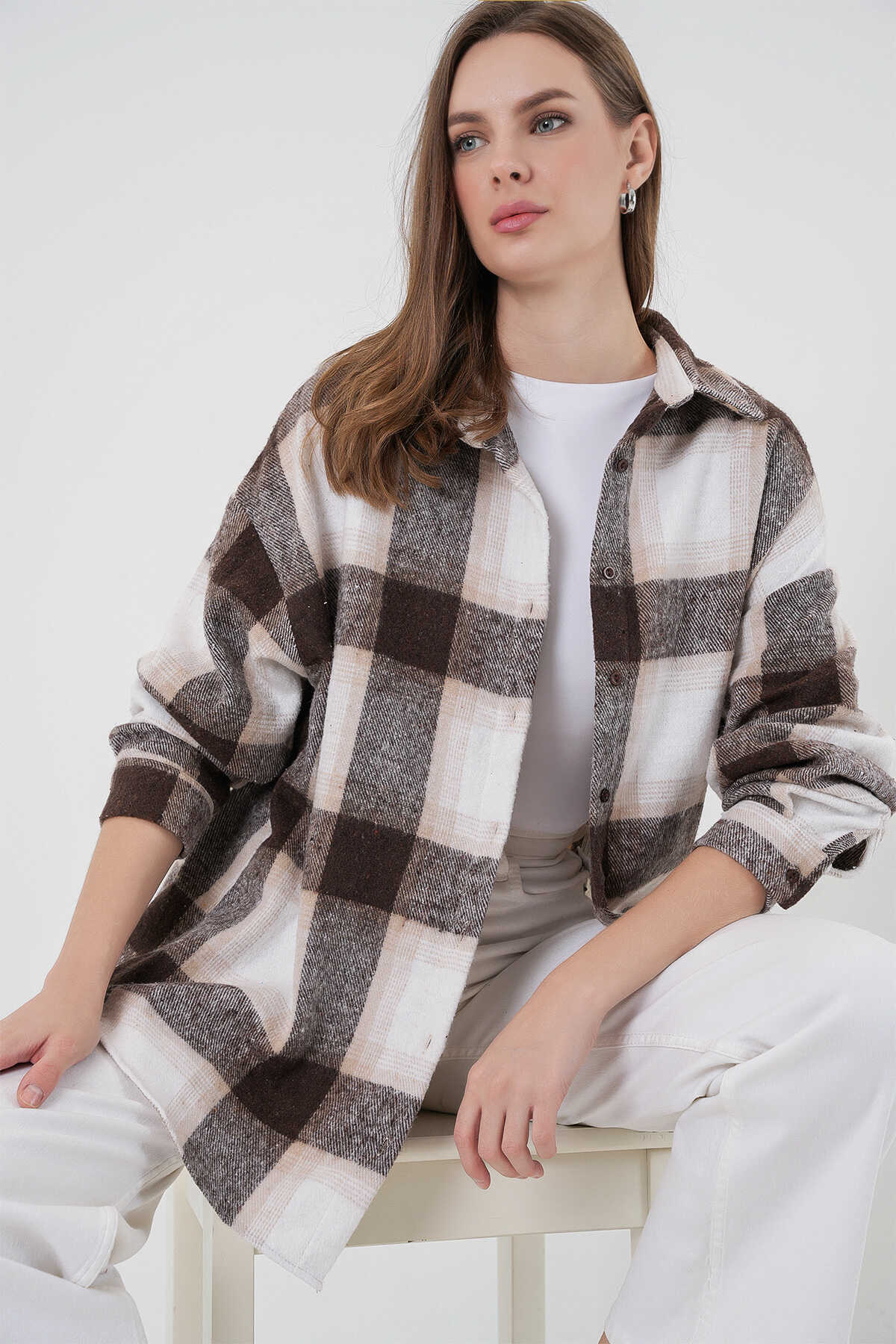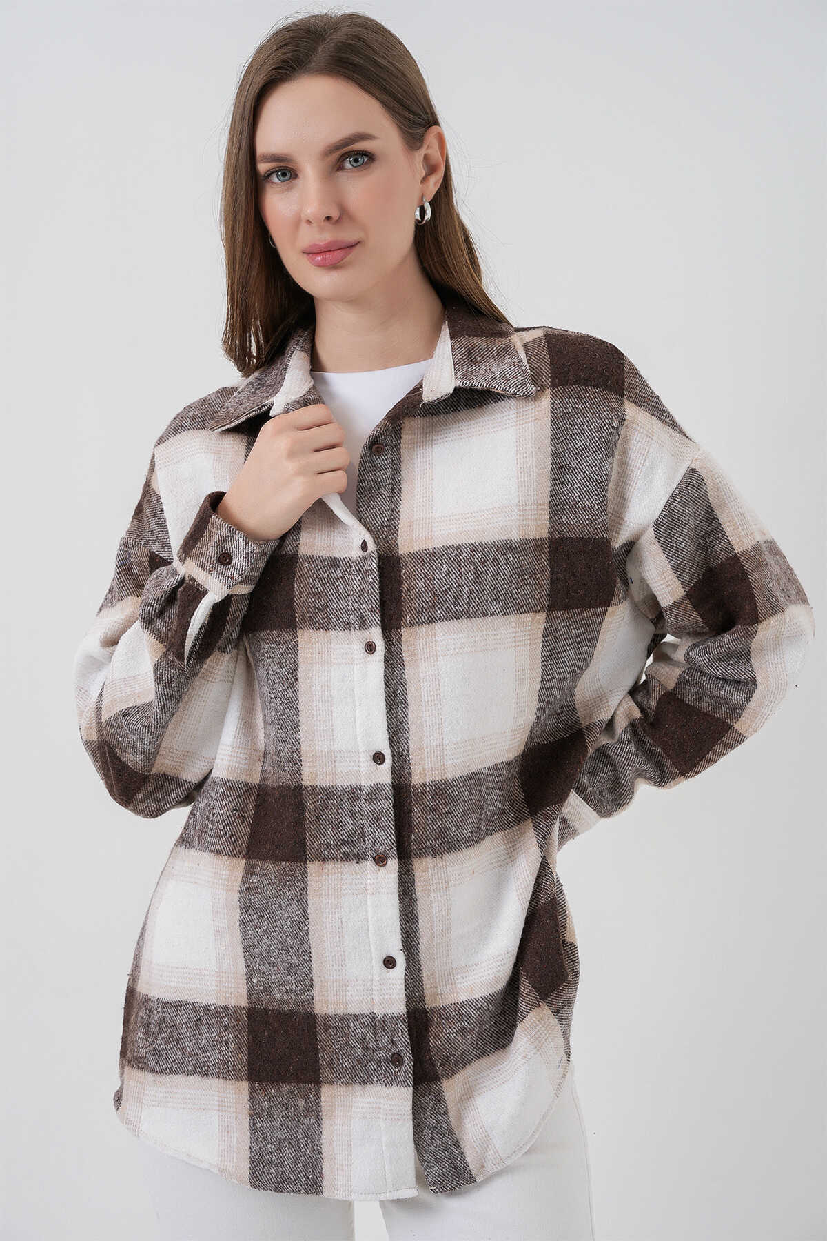 Kadin Ekose Desen Dügmeli Oversize Oduncu Gömlek
