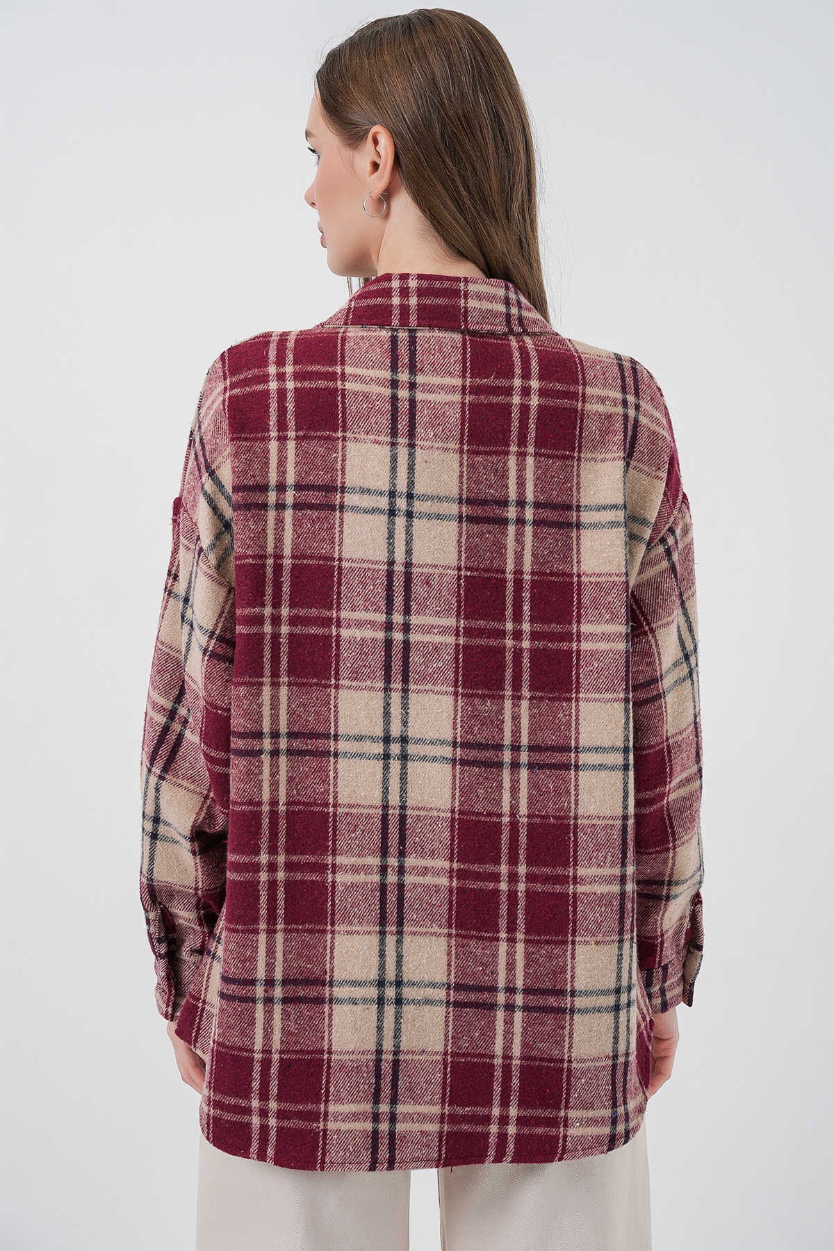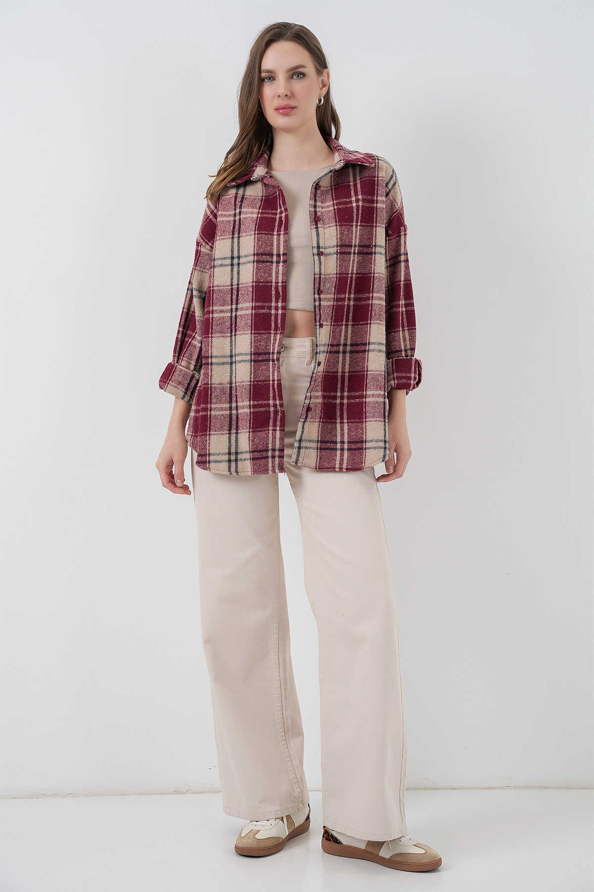 Kadin Ekose Desen Dügmeli Oversize Oduncu Gömlek