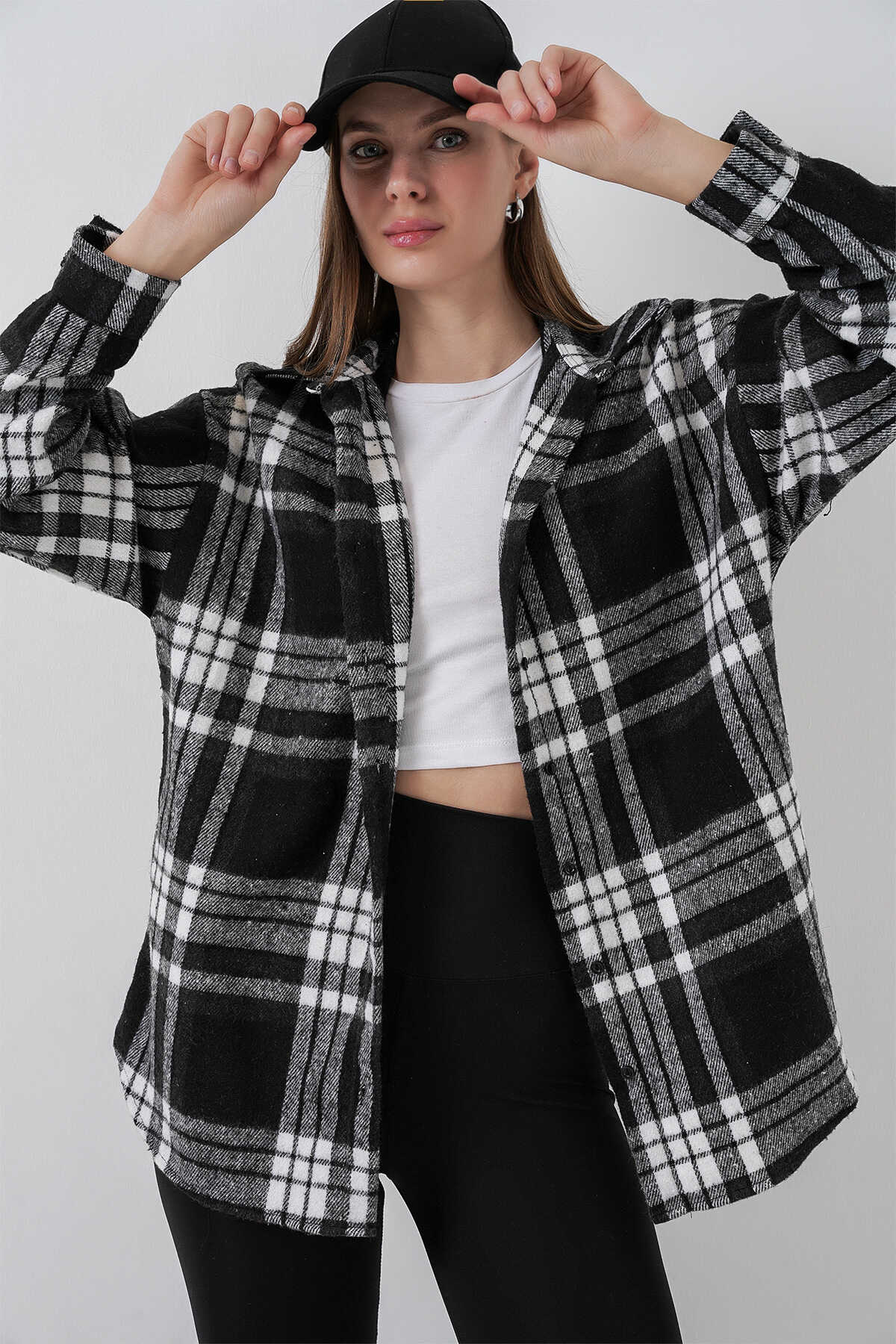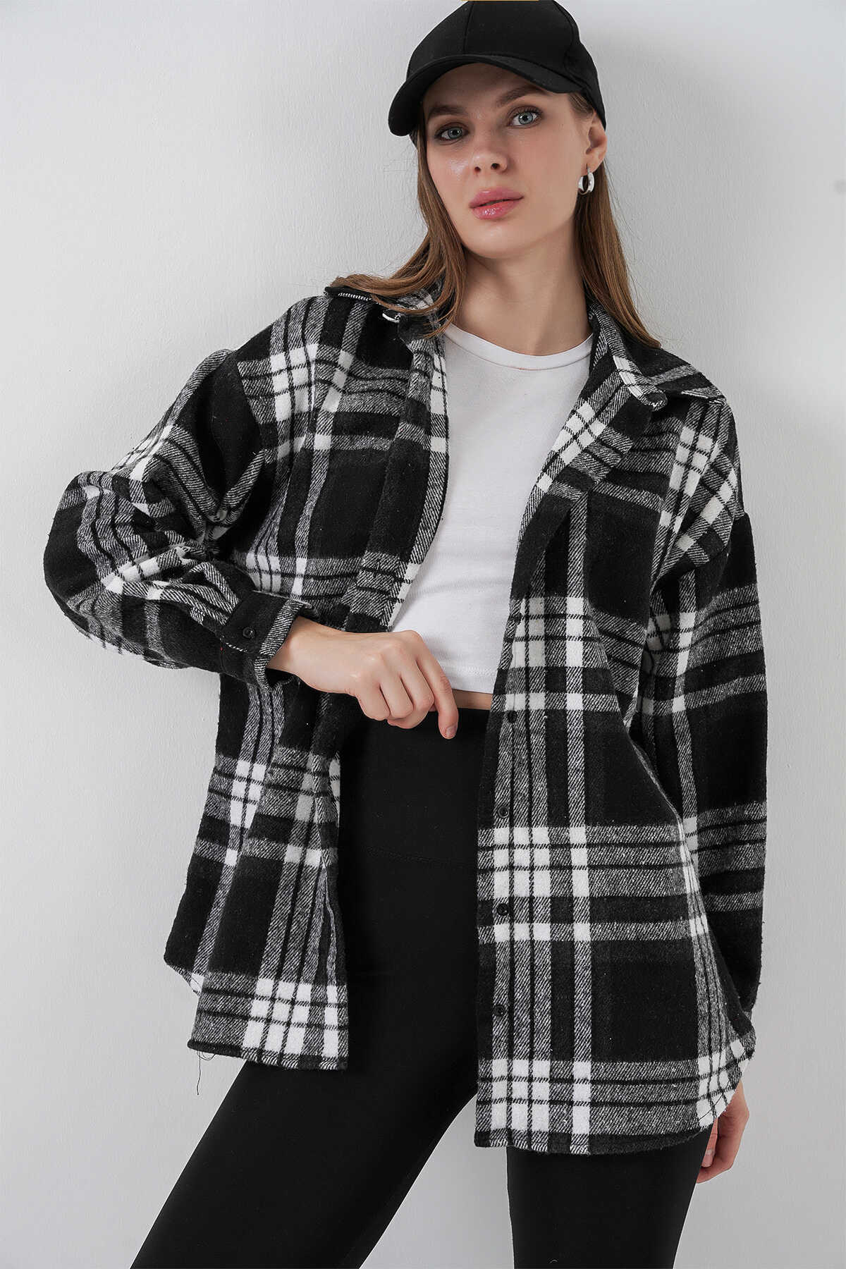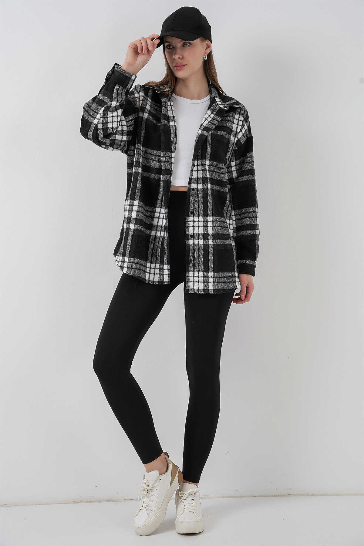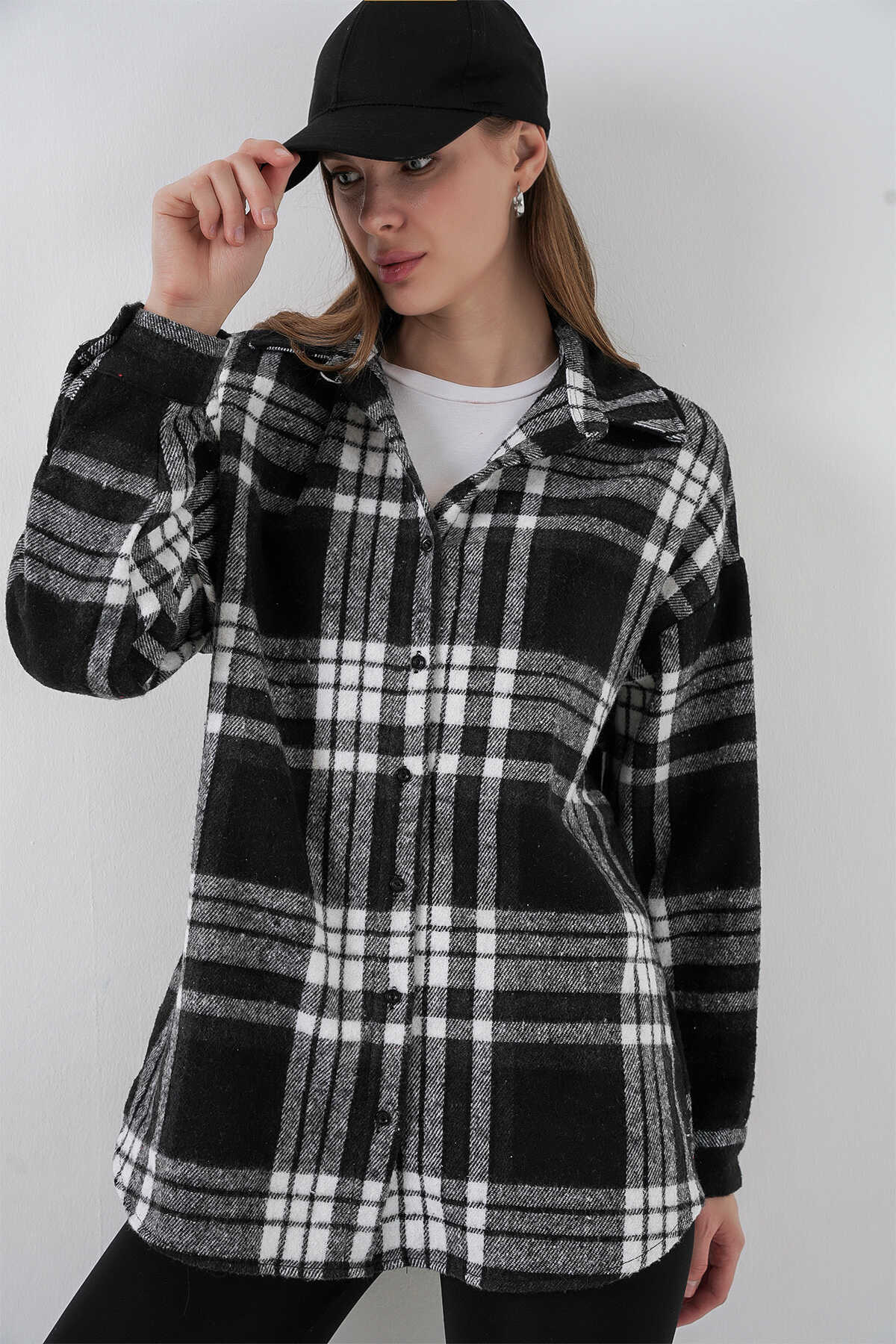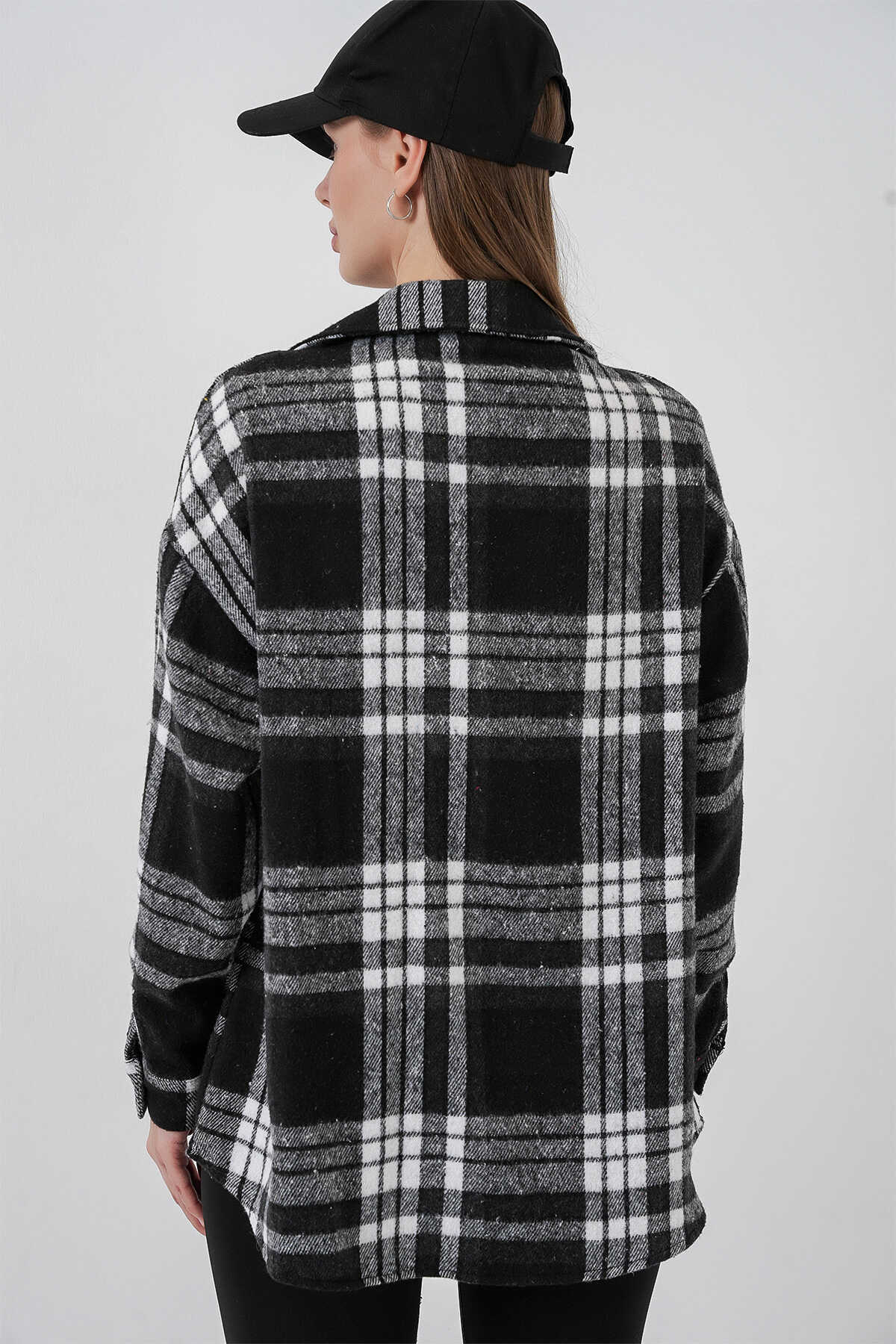 Kadın Ekose Desen Oversize Oduncu Gömlek 3854 D. Siyah - Kombin