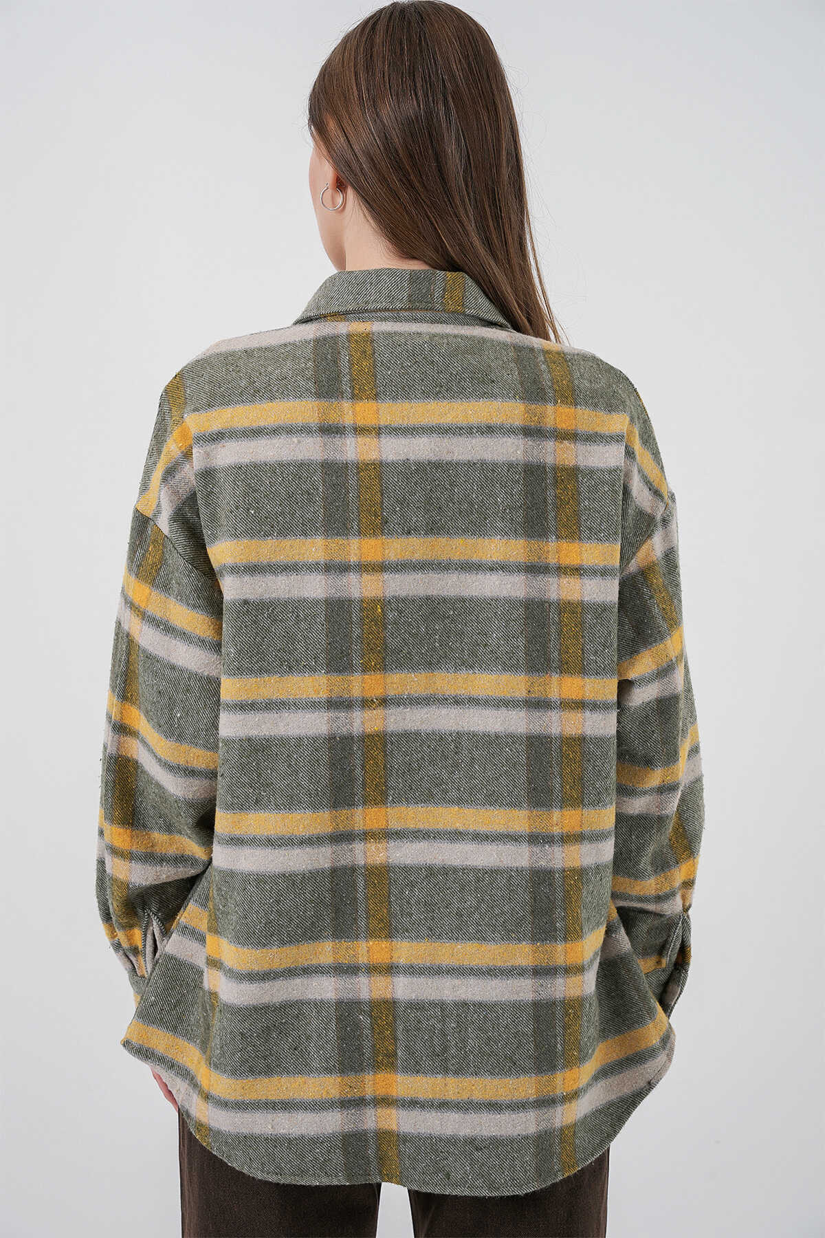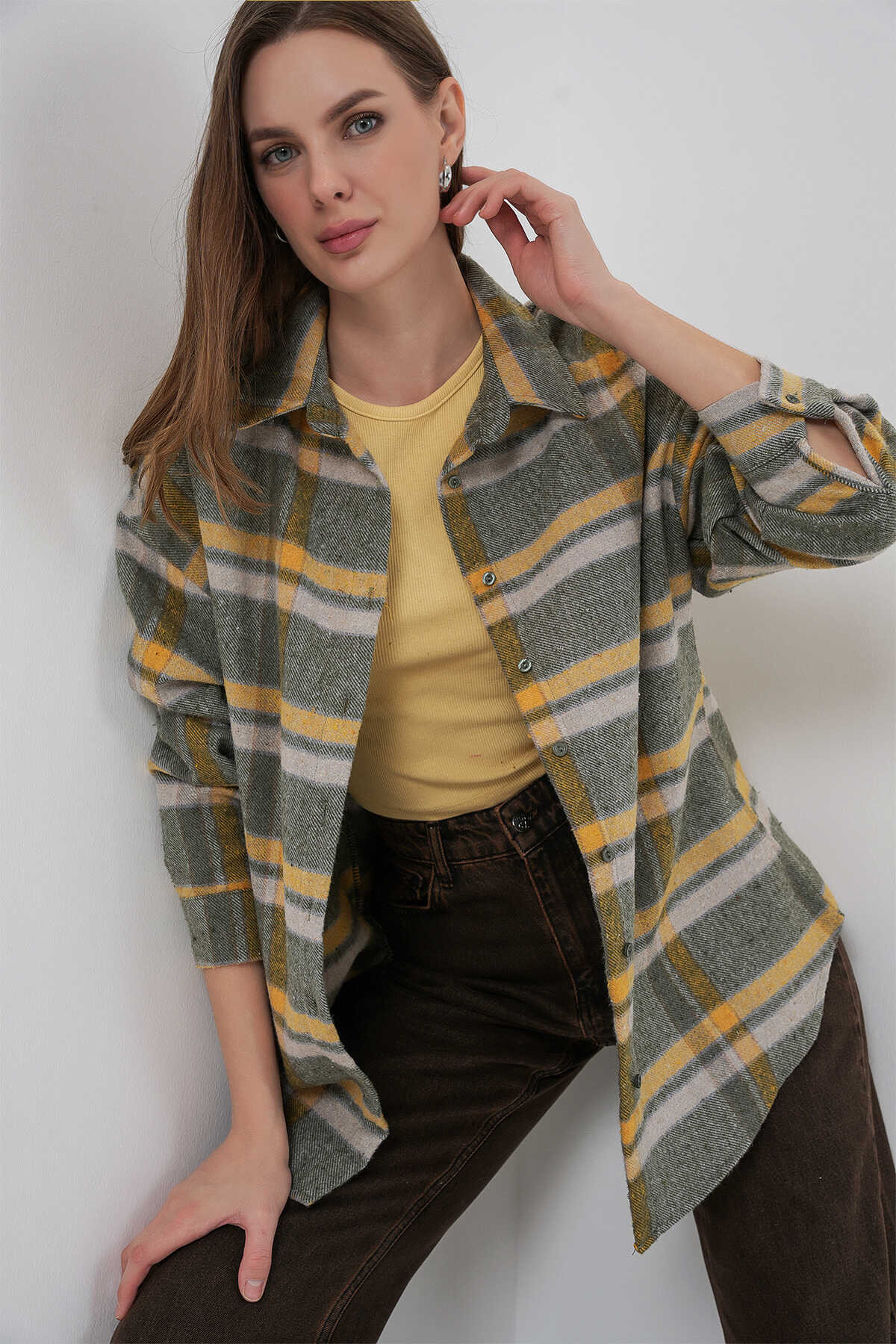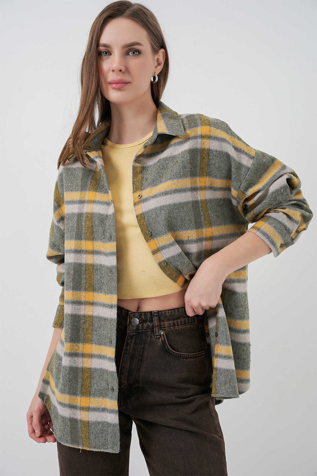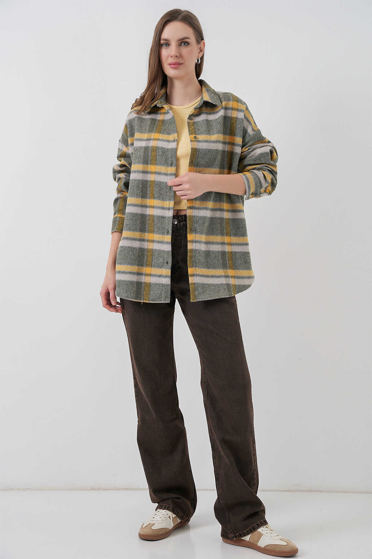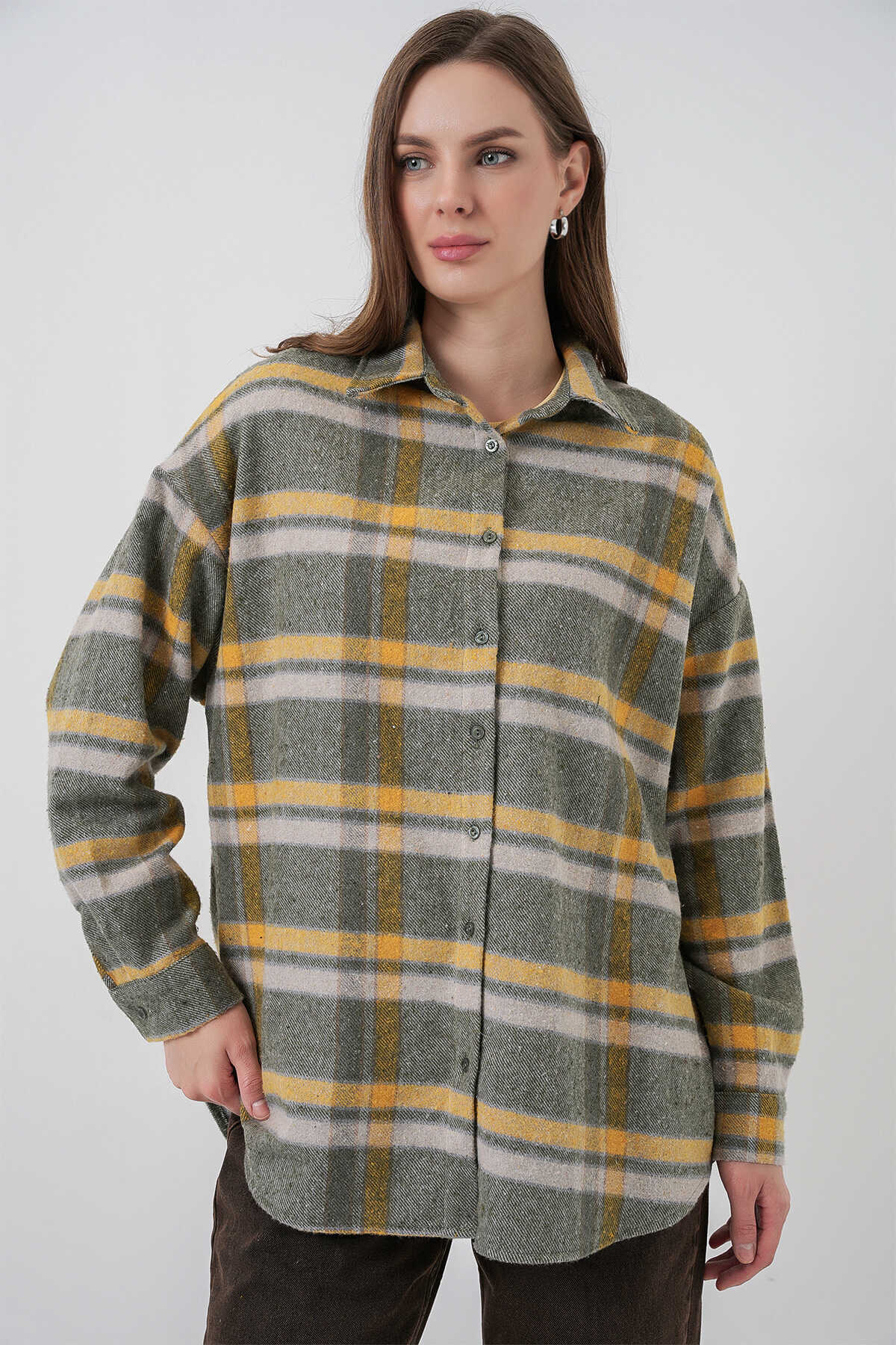 Kadin Ekose Desen Dügmeli Oversize Oduncu Gömlek