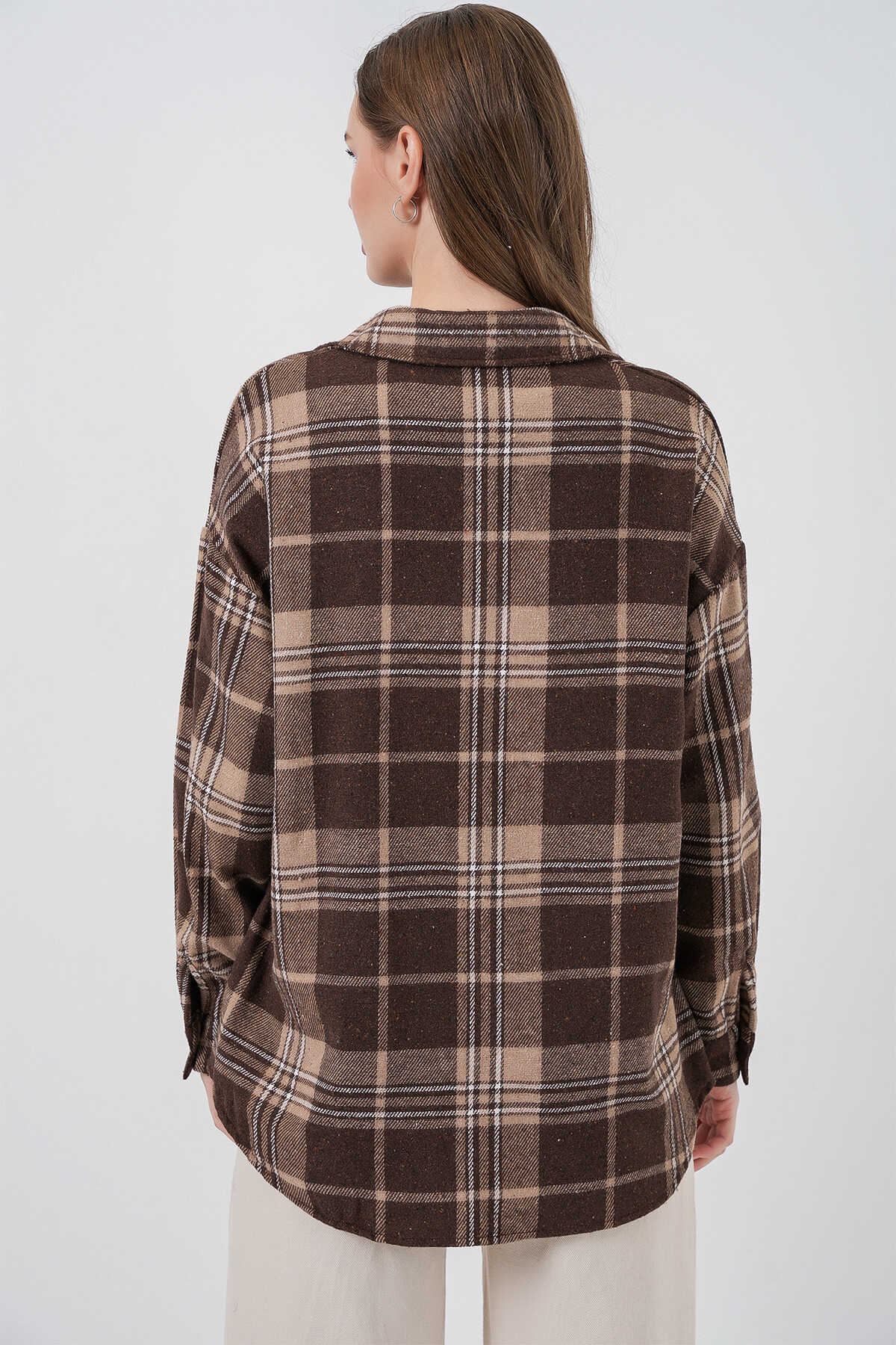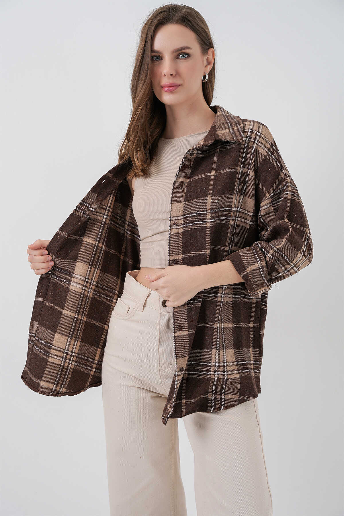 Kadin Ekose Desen Dügmeli Oversize Oduncu Gömlek