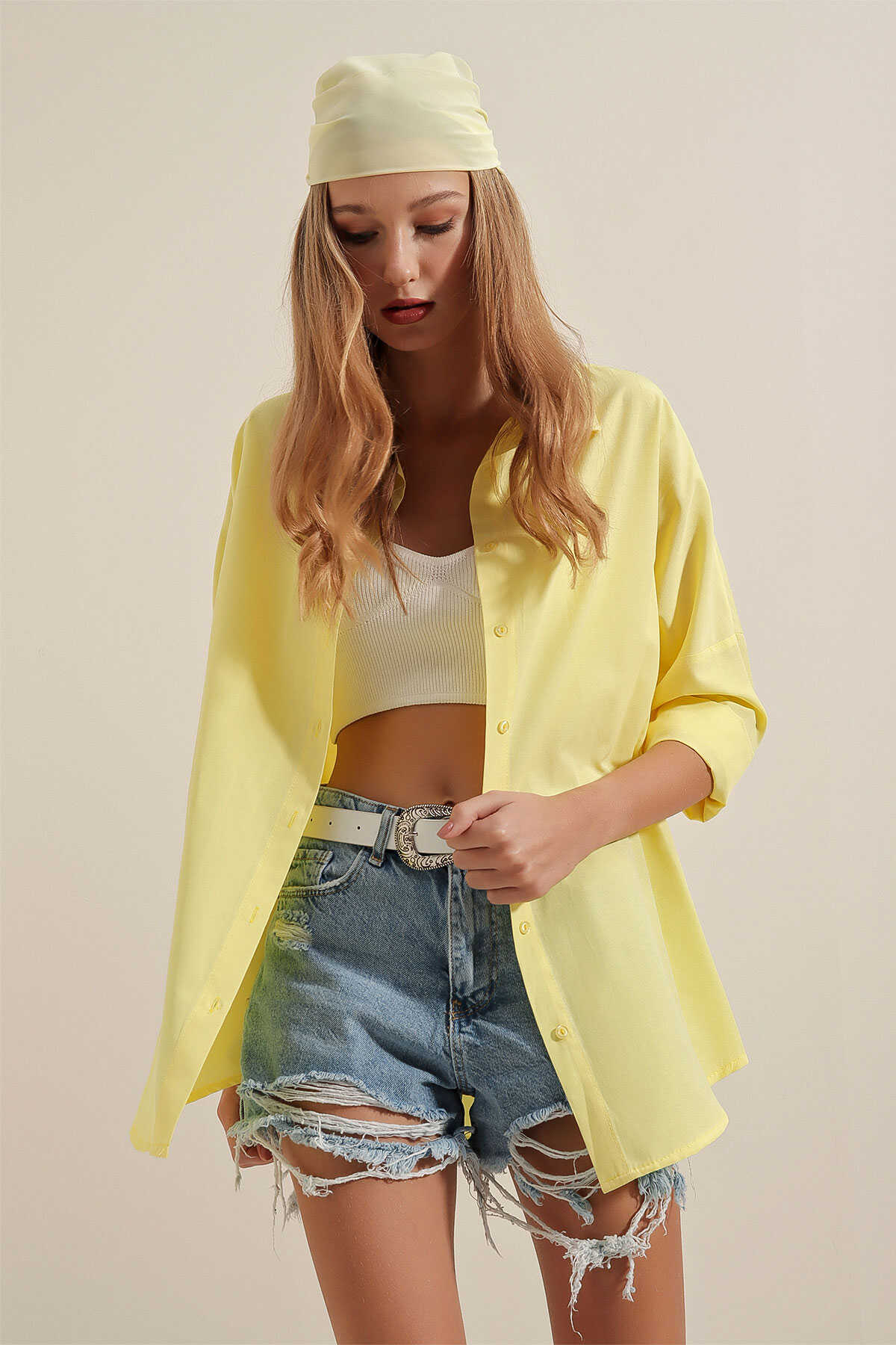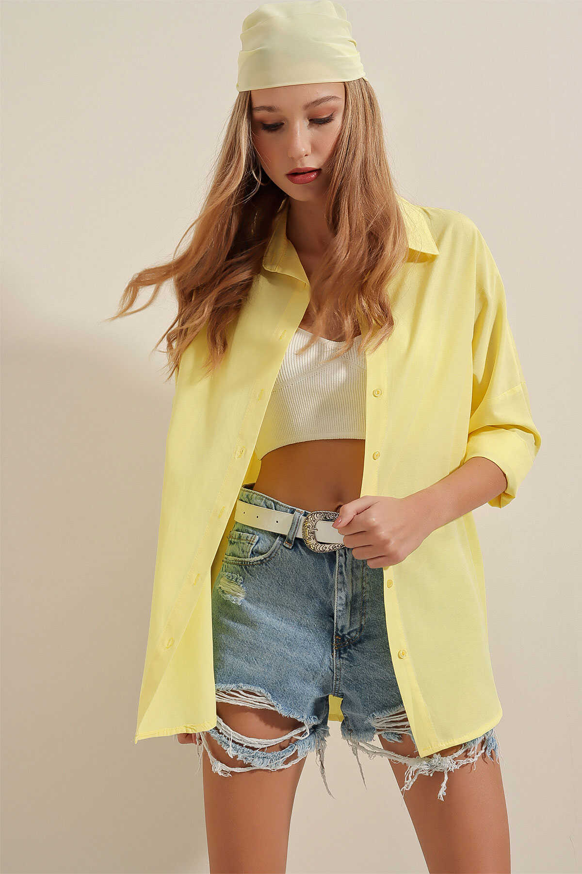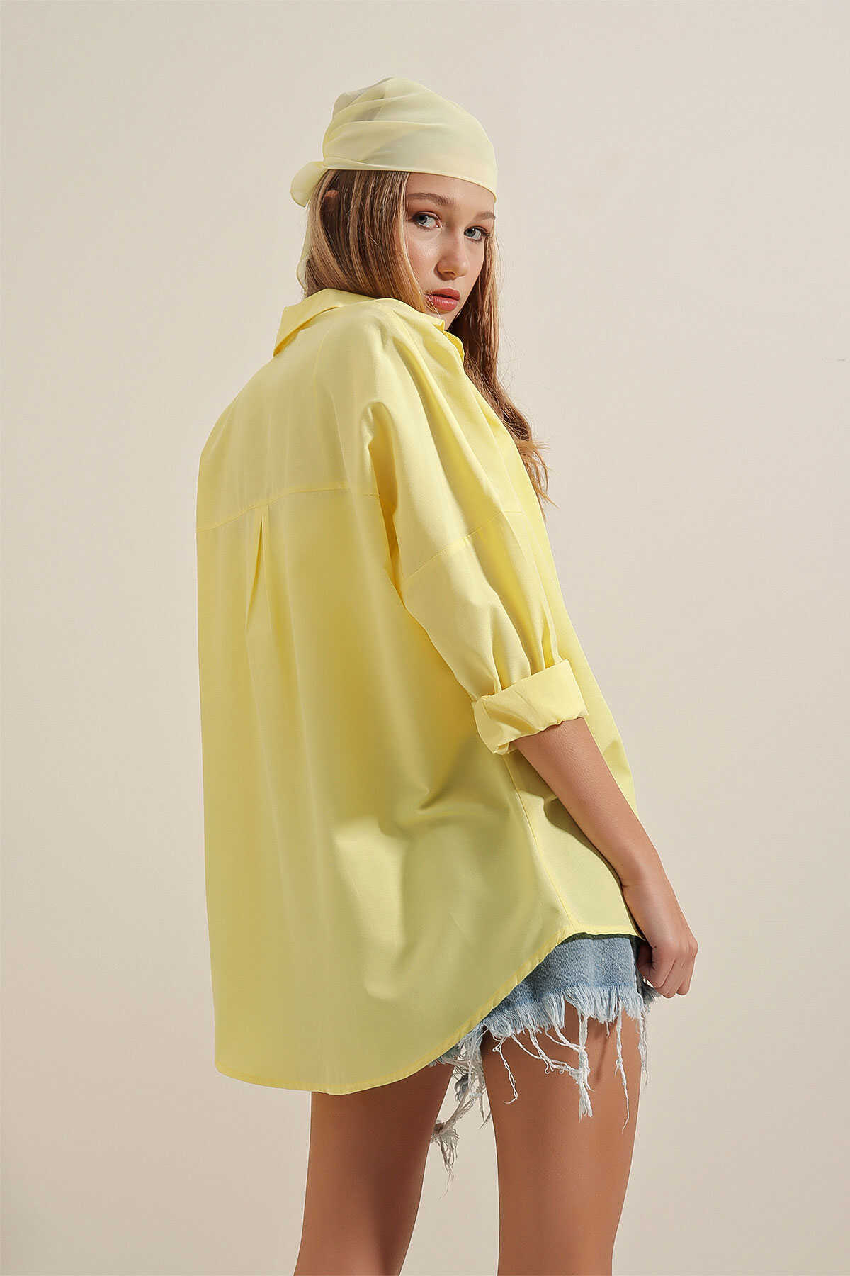3900 Oversize Uzun Basic Gömlek - Sarı - Kombin