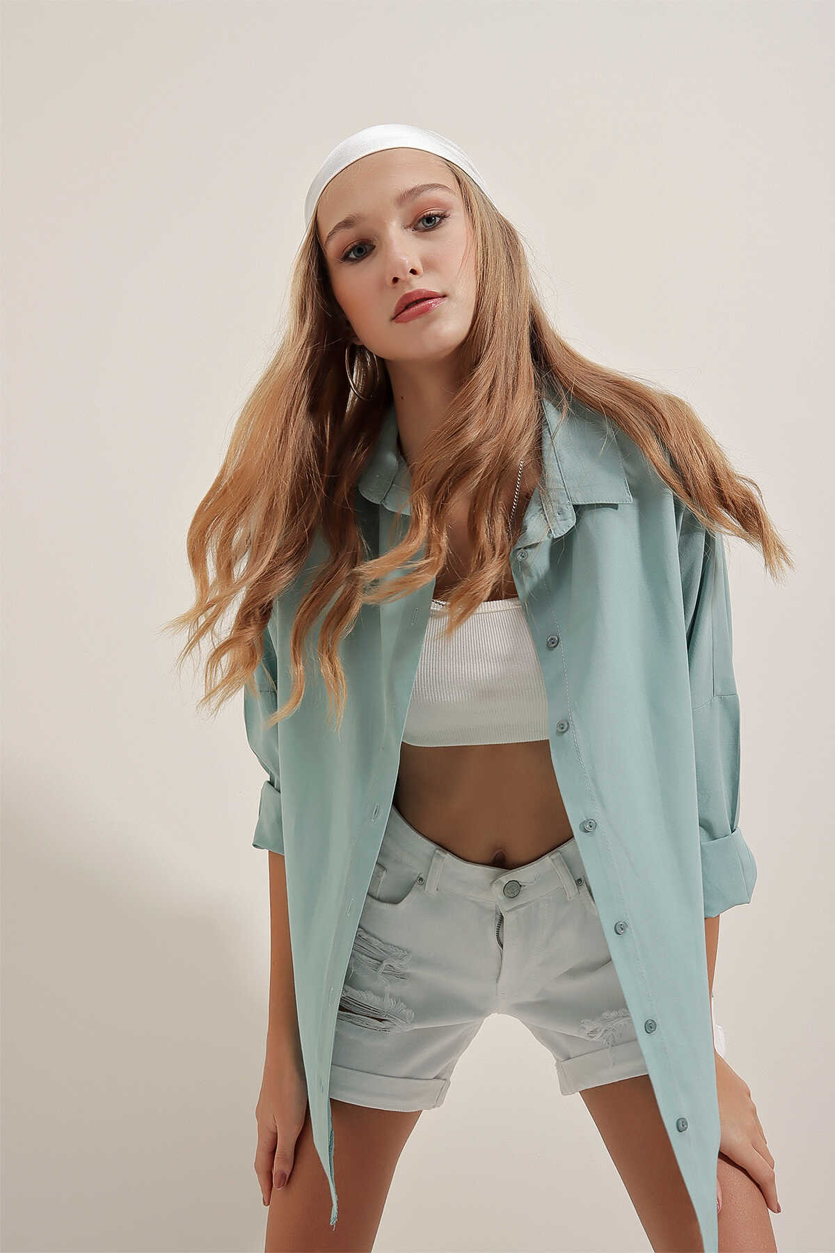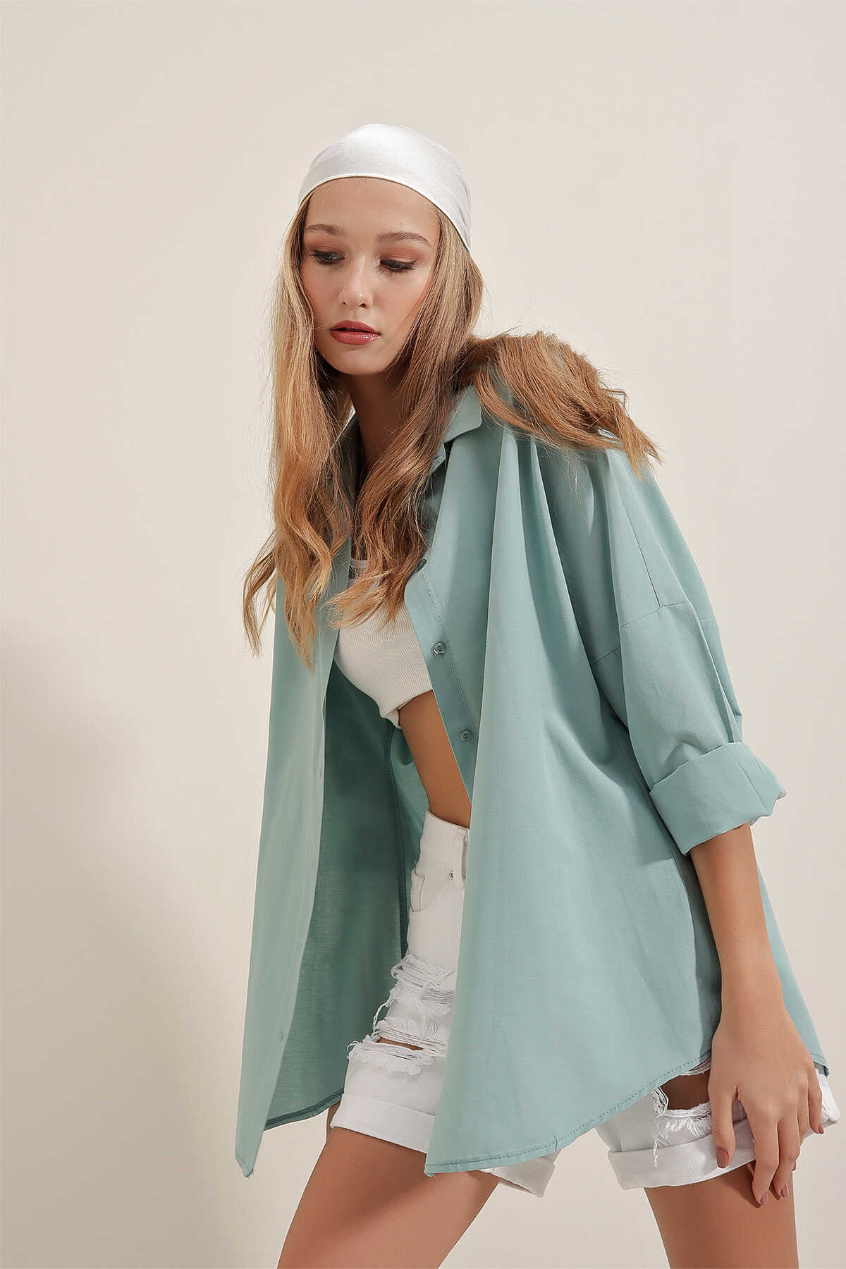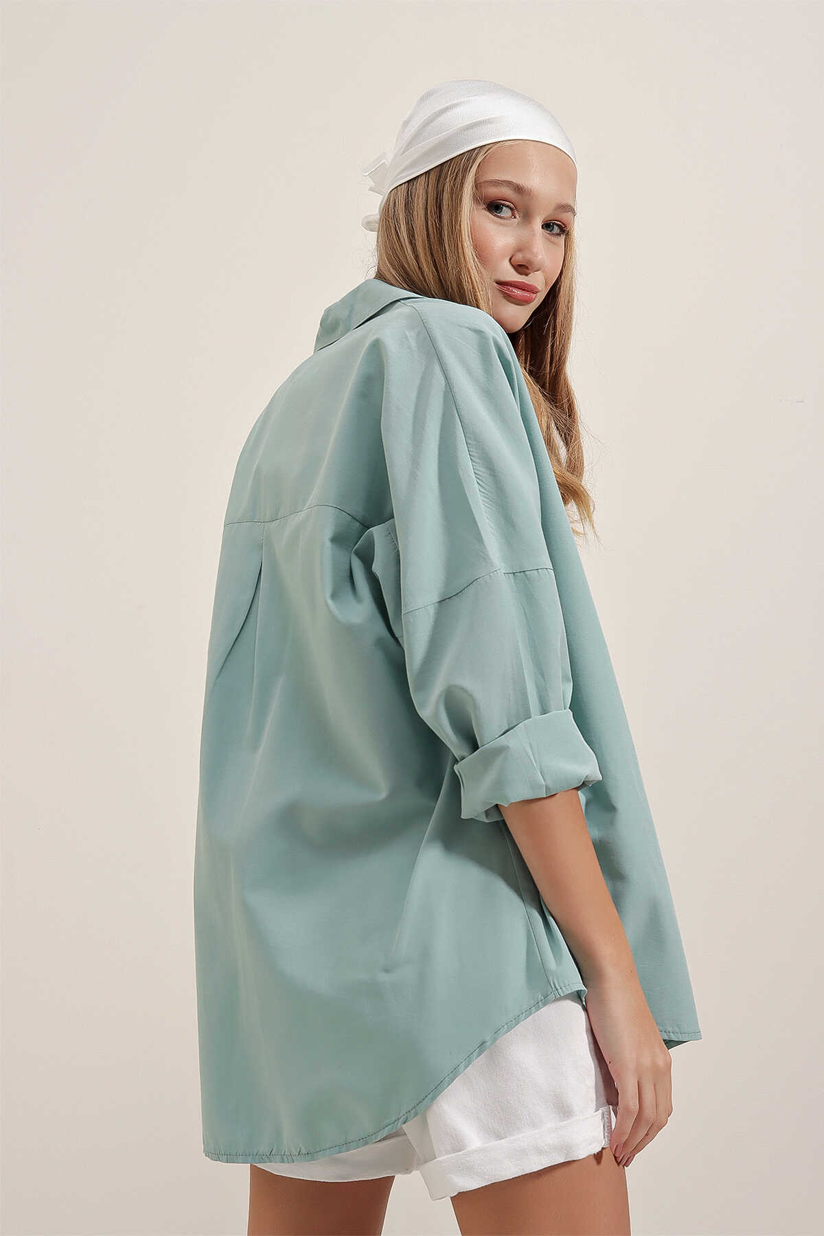 3900 Oversize Uzun Basic Gömlek - Su Yeşili - Kombin