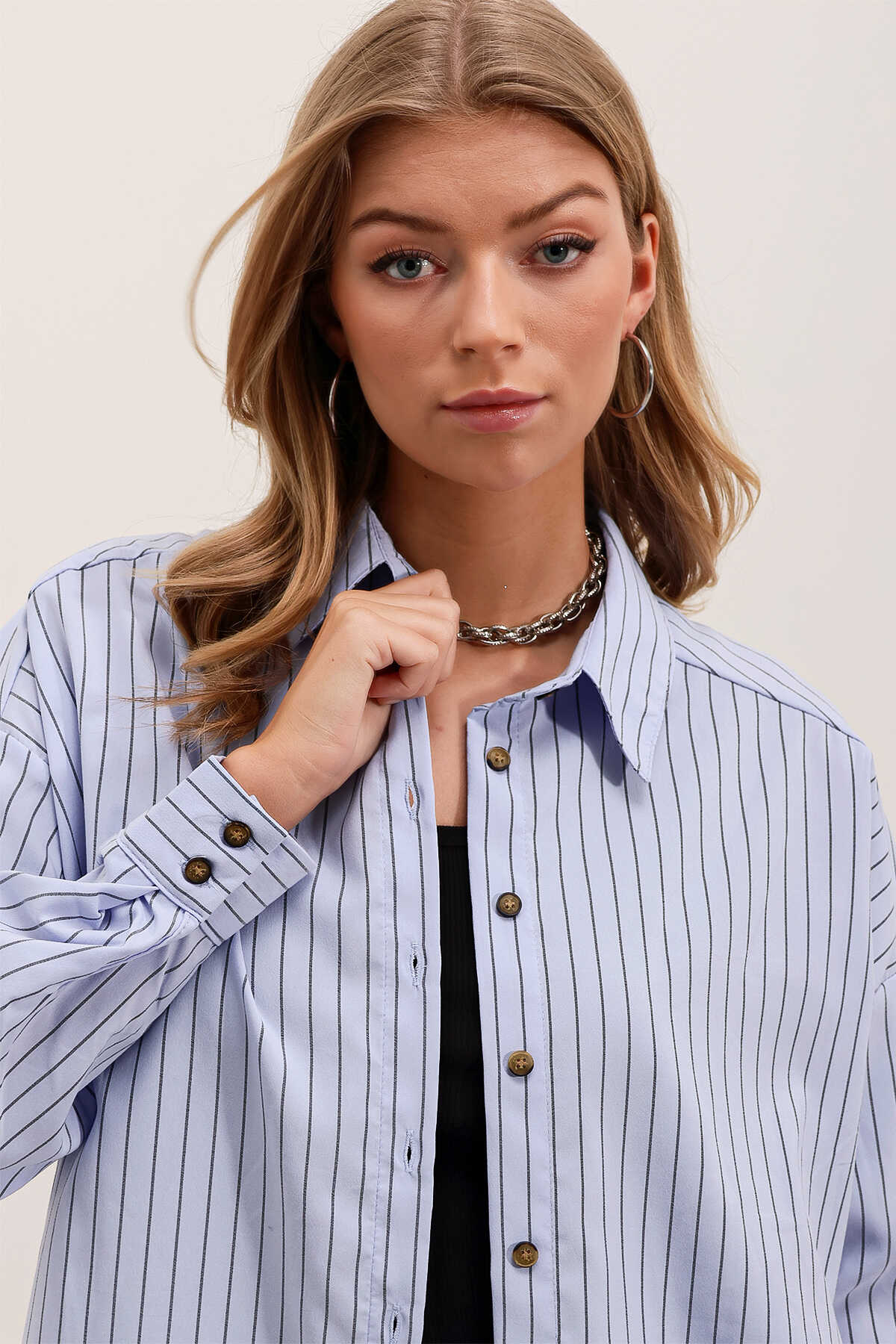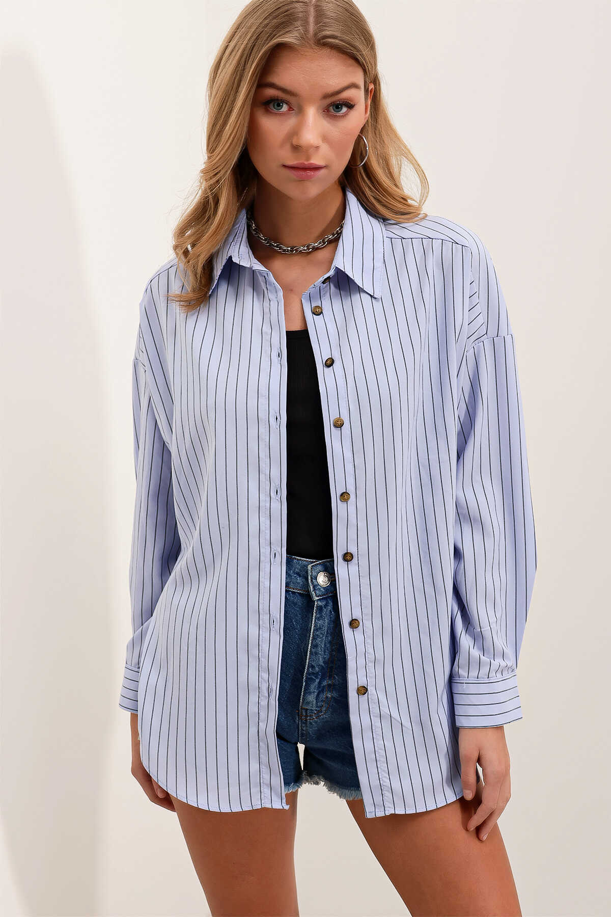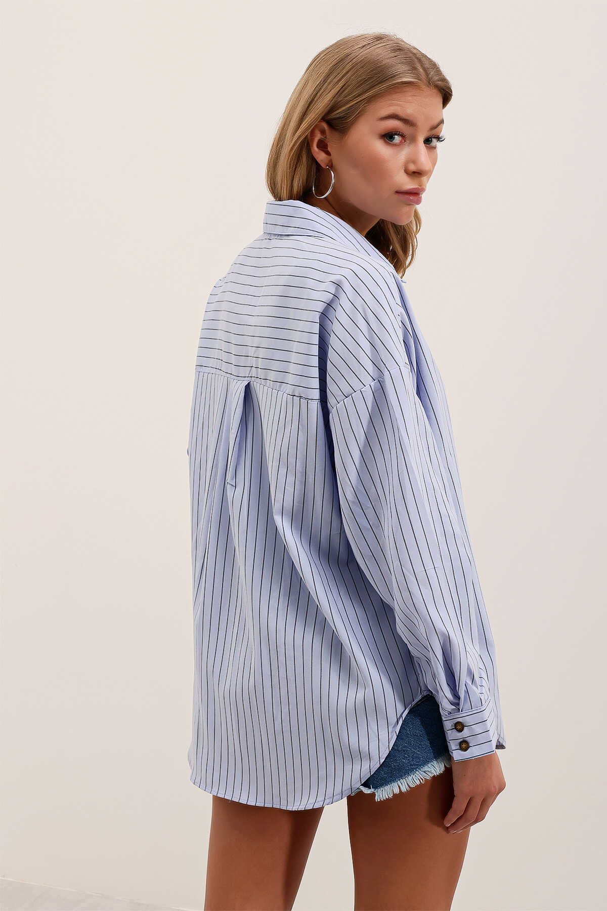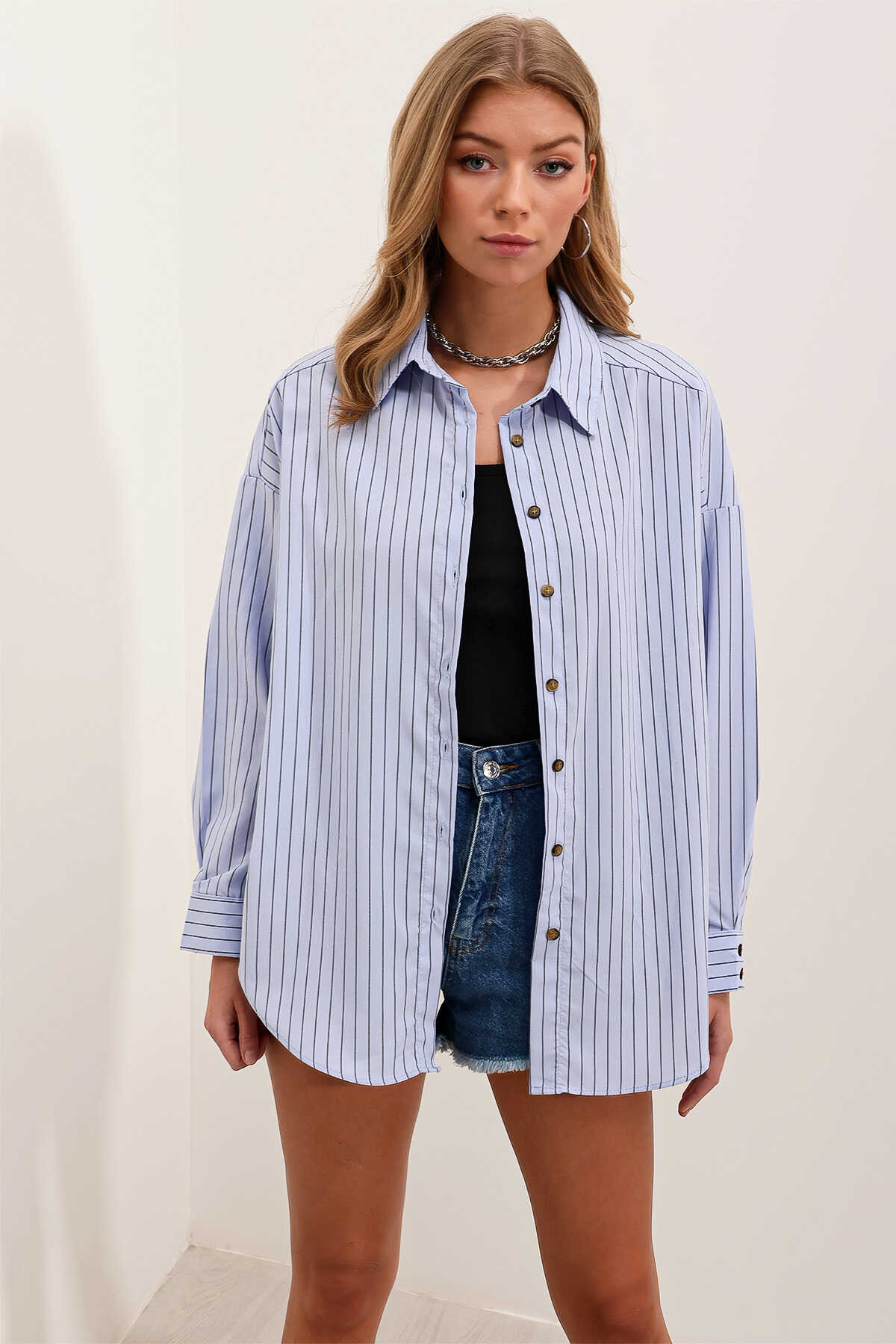 Kadın Bebe Mavi Siyah Çizgili Oversize Uzun Basic Gömlek 3900 - Kombin