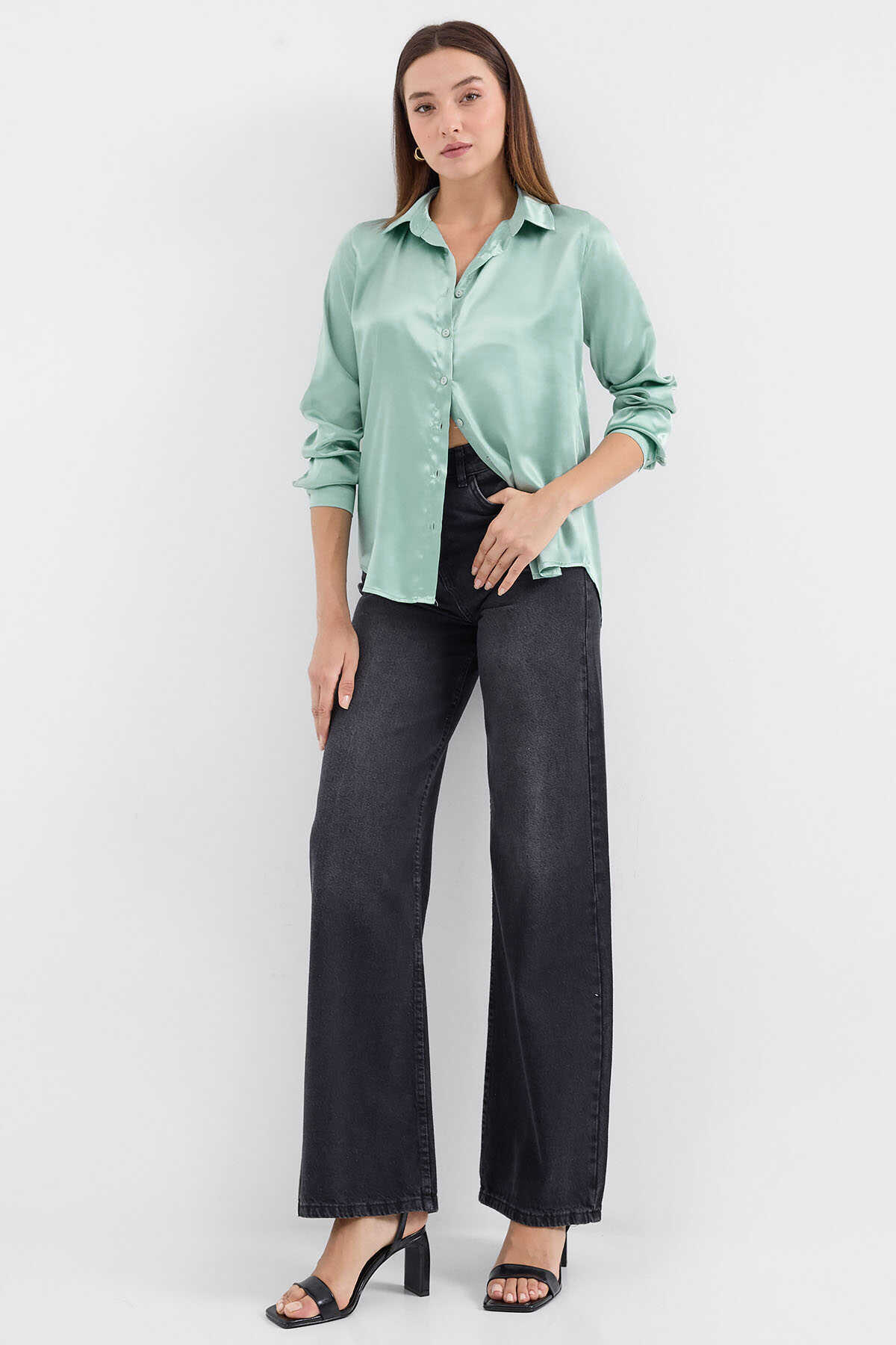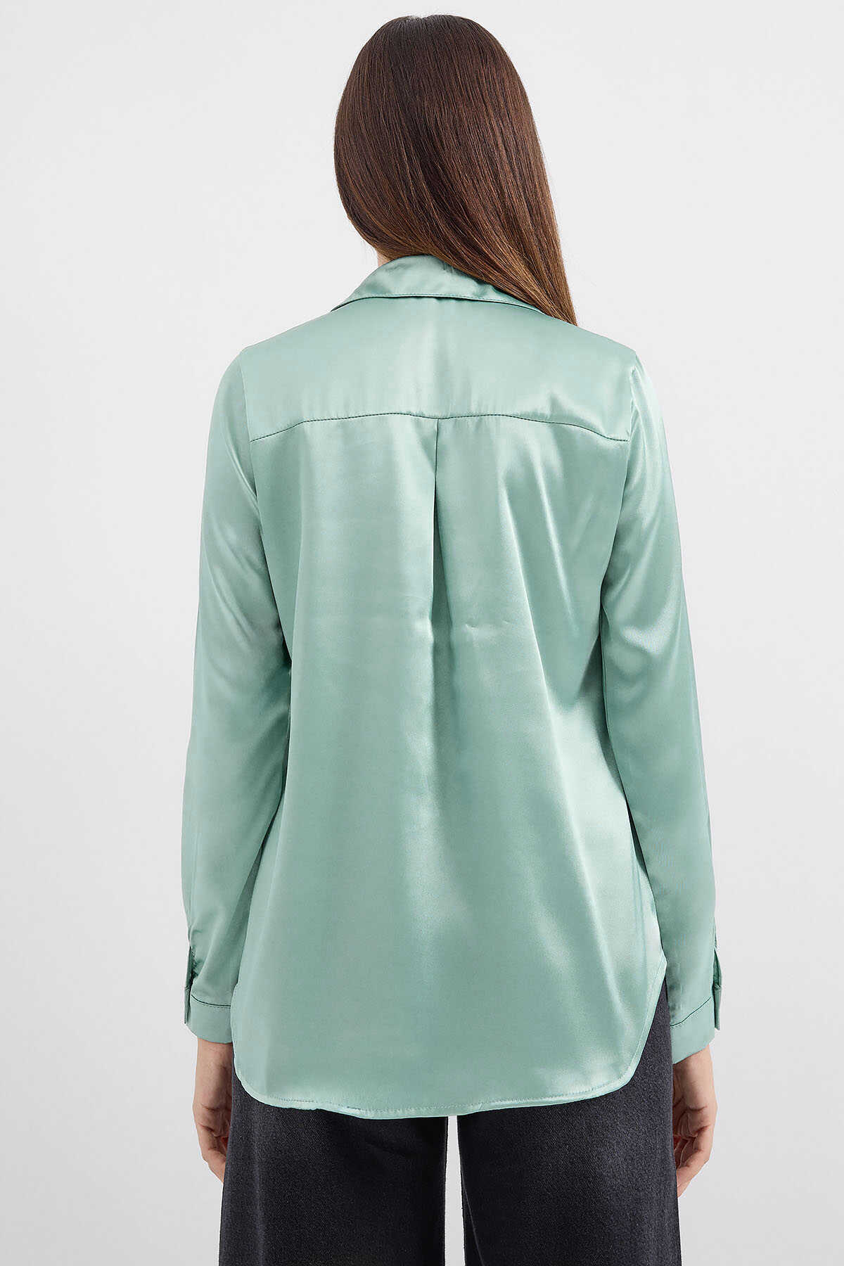 3964 Hafif Dökümlü Saten Gömlek - Çağla
