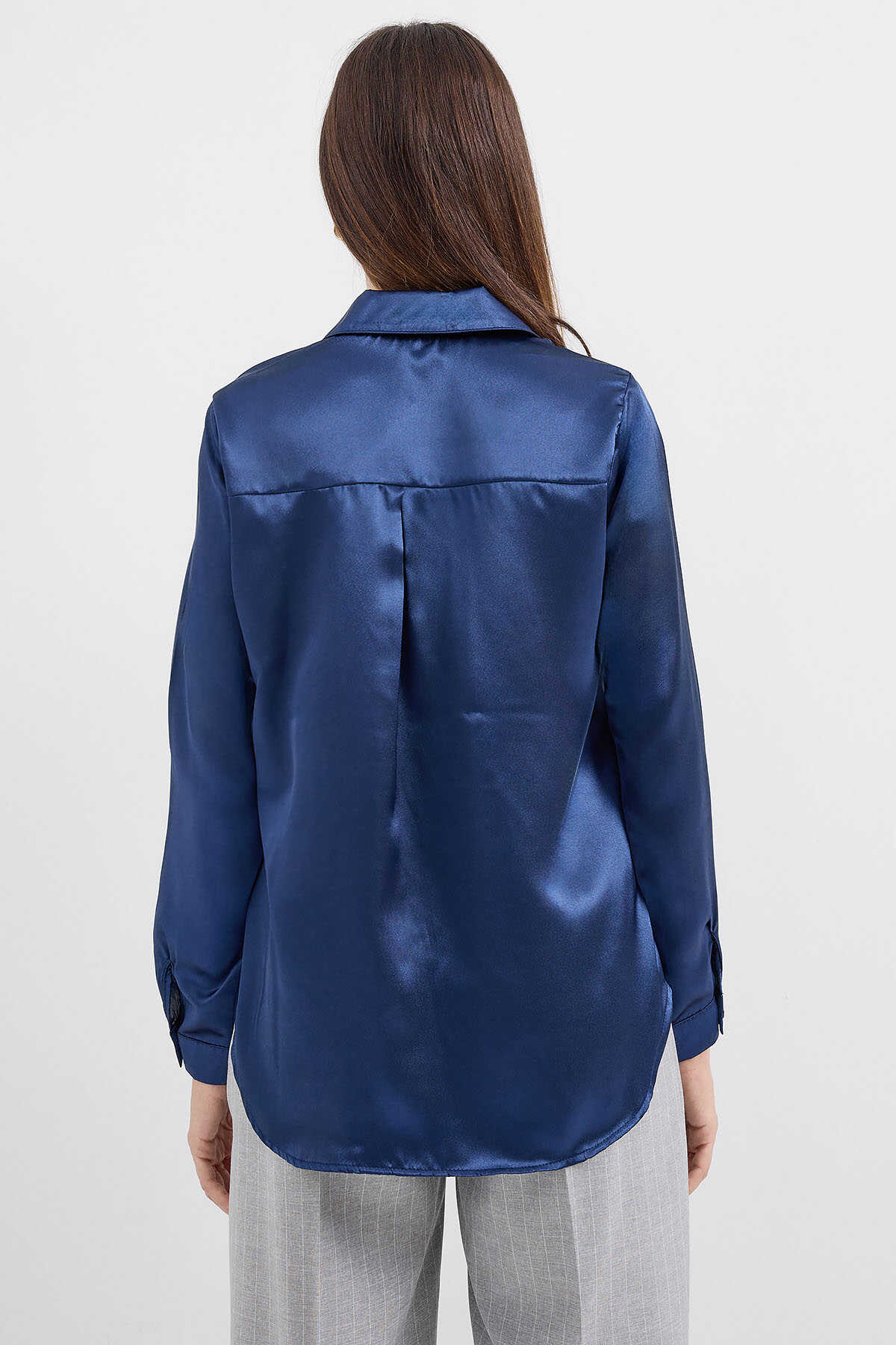 3964 Hafif Dökümlü Saten Gömlek - Lacivert - Kombin