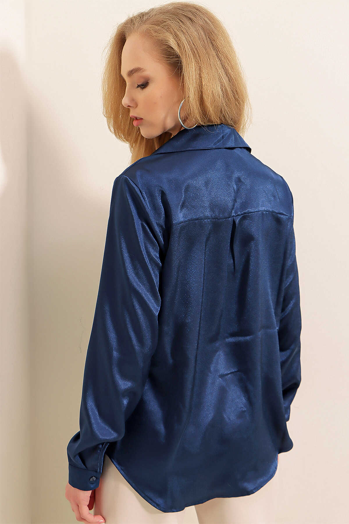3964 Hafif Dökümlü Saten Gömlek - Lacivert