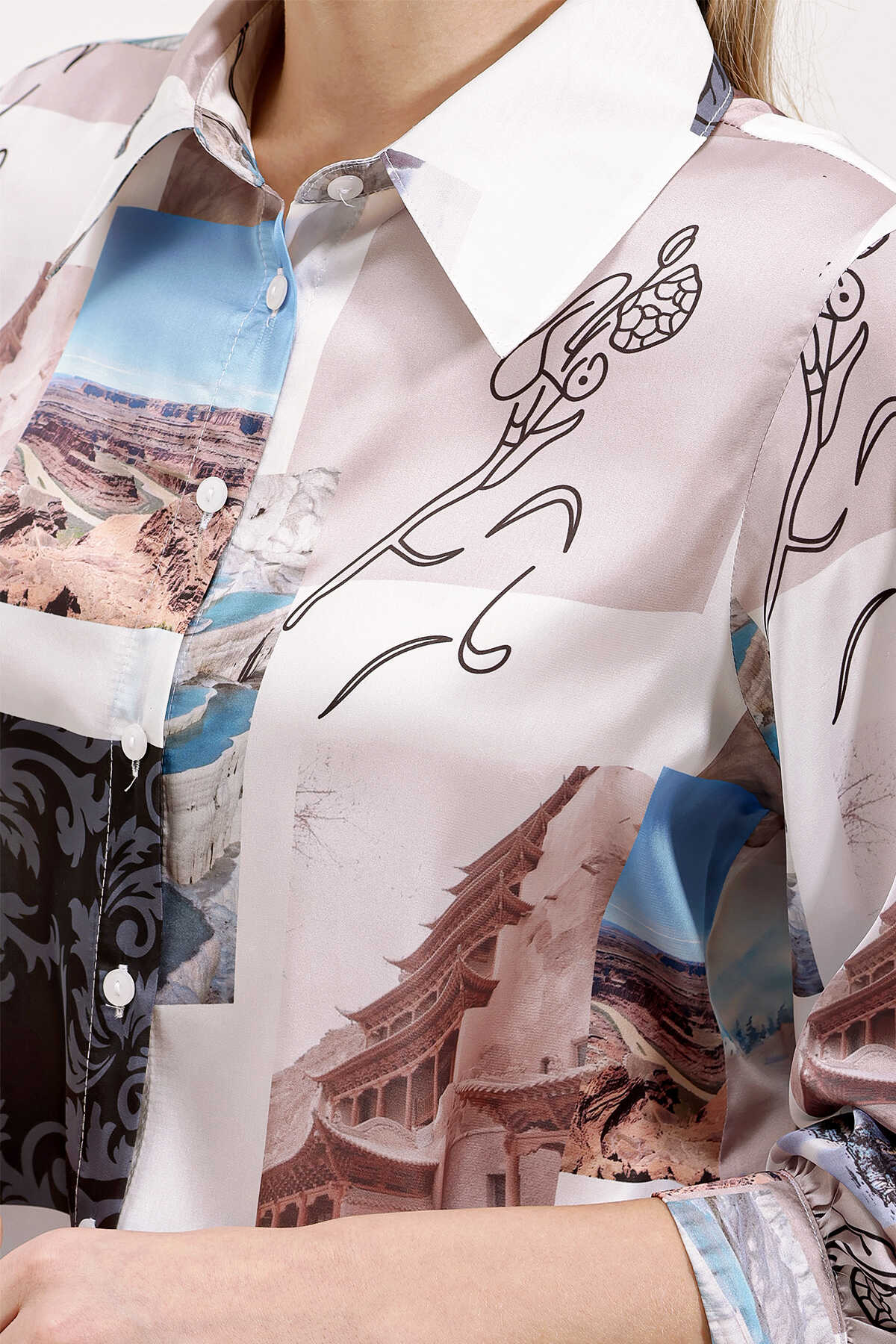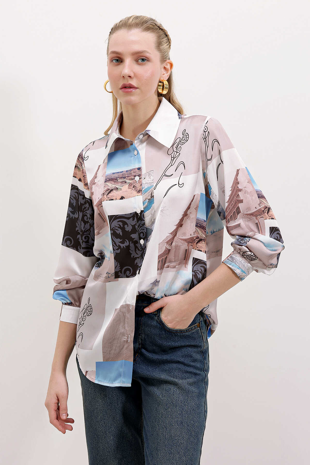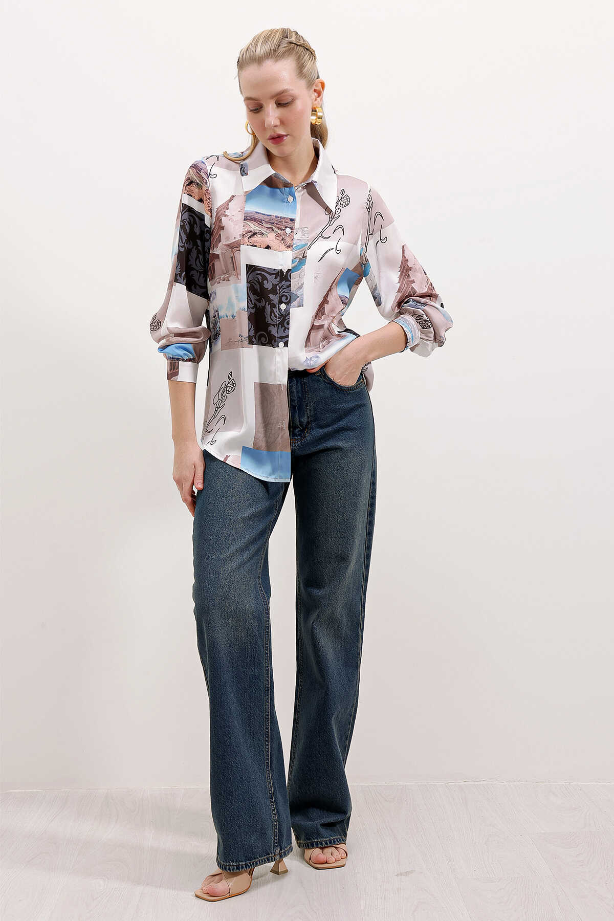 3964 Hafif Dökümlü Saten Gömlek - A.Bej - Kombin