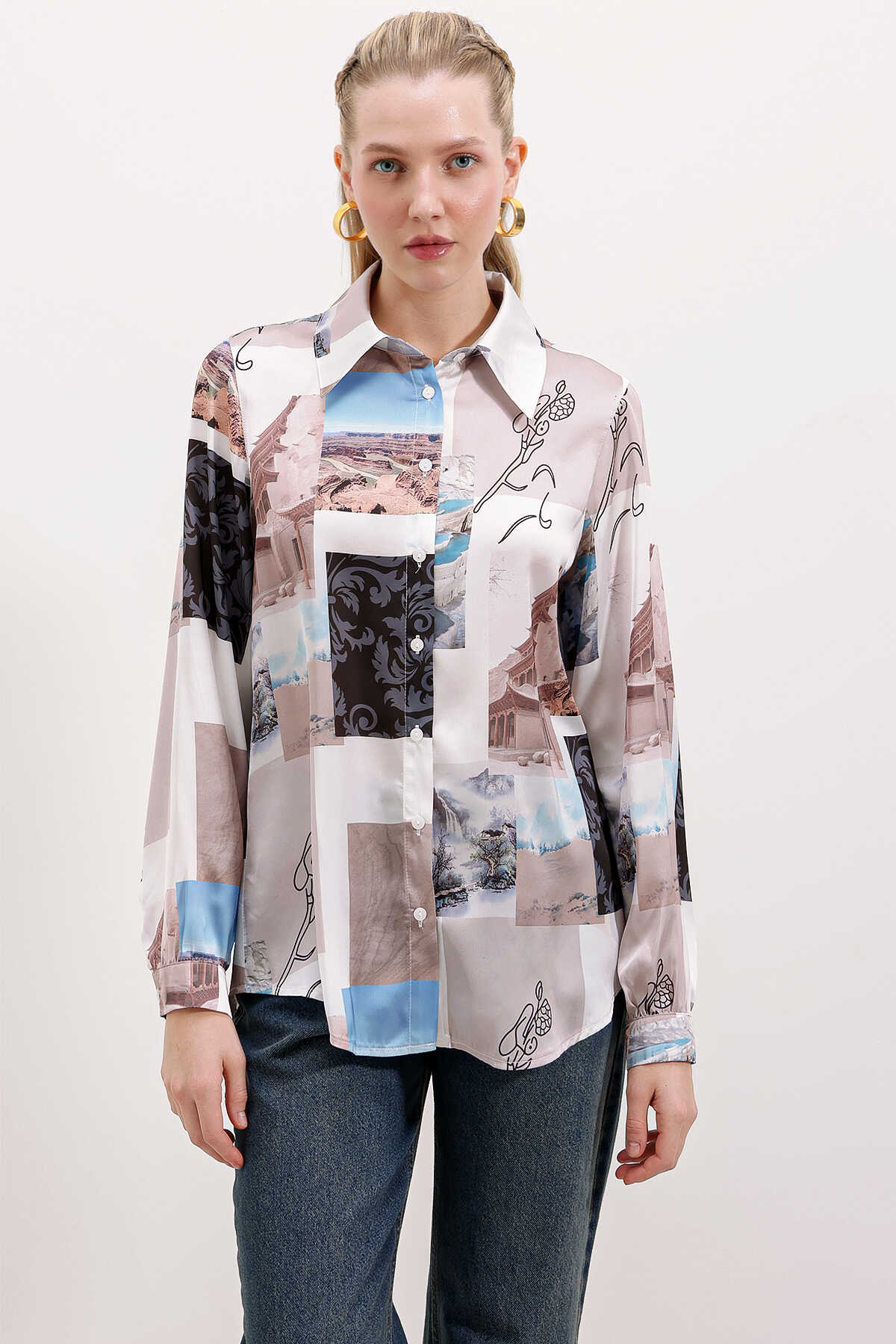 3964 Hafif Dökümlü Saten Gömlek - A.Bej