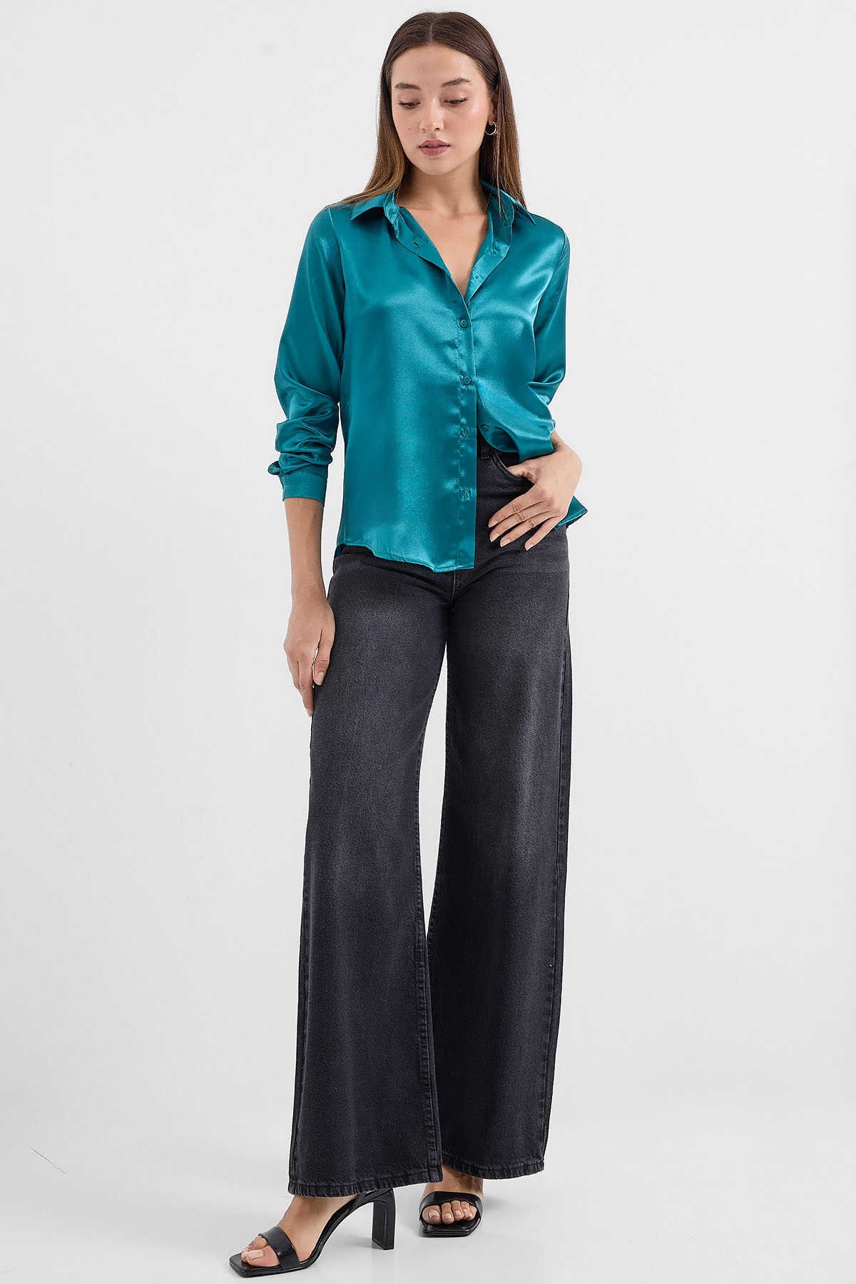 3964 Hafif Dökümlü Saten Gömlek - A.Yeşil - Kombin
