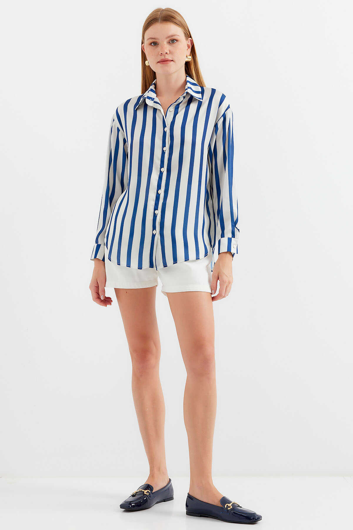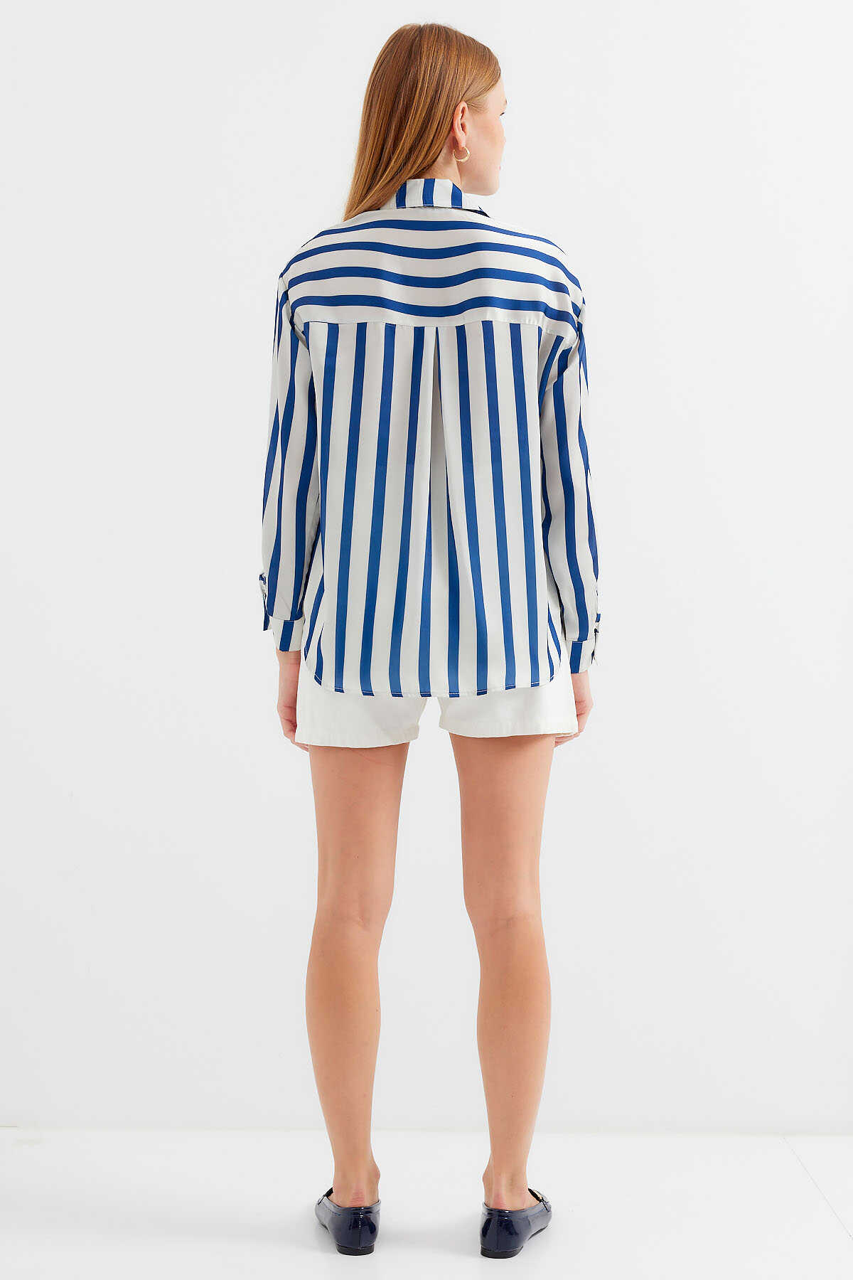 3964 Hafif Dökümlü Saten Gömlek - B.Lacivert - Kombin