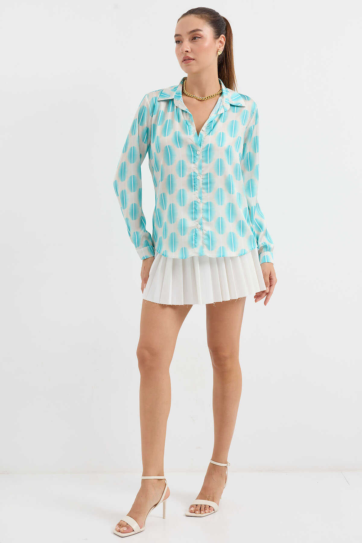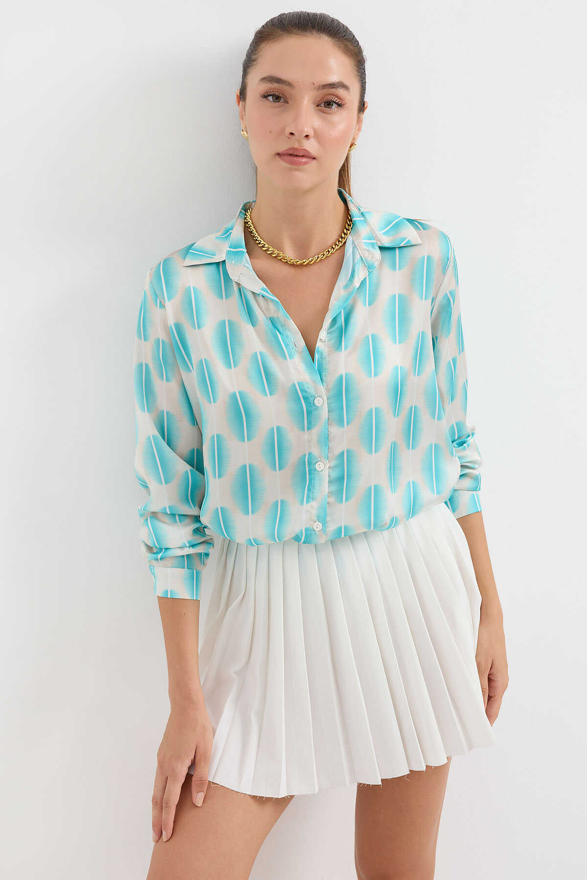 3964 Hafif Dökümlü Saten Gömlek - B.Turkuaz - Kombin