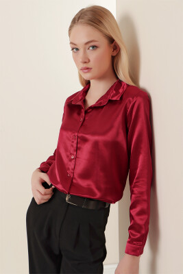 3964 Hafif Dökümlü Saten Gömlek - Mürdüm - Kombin