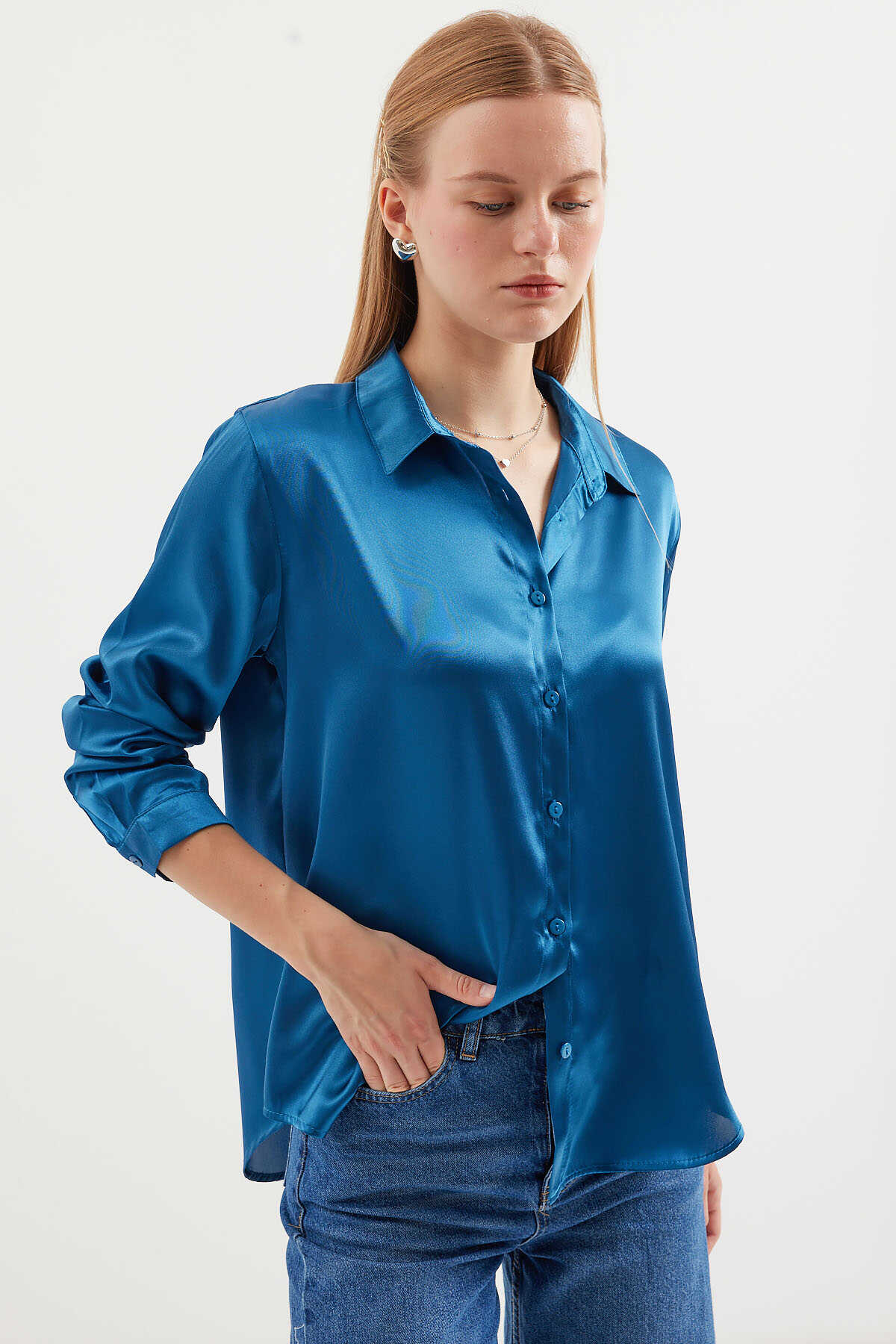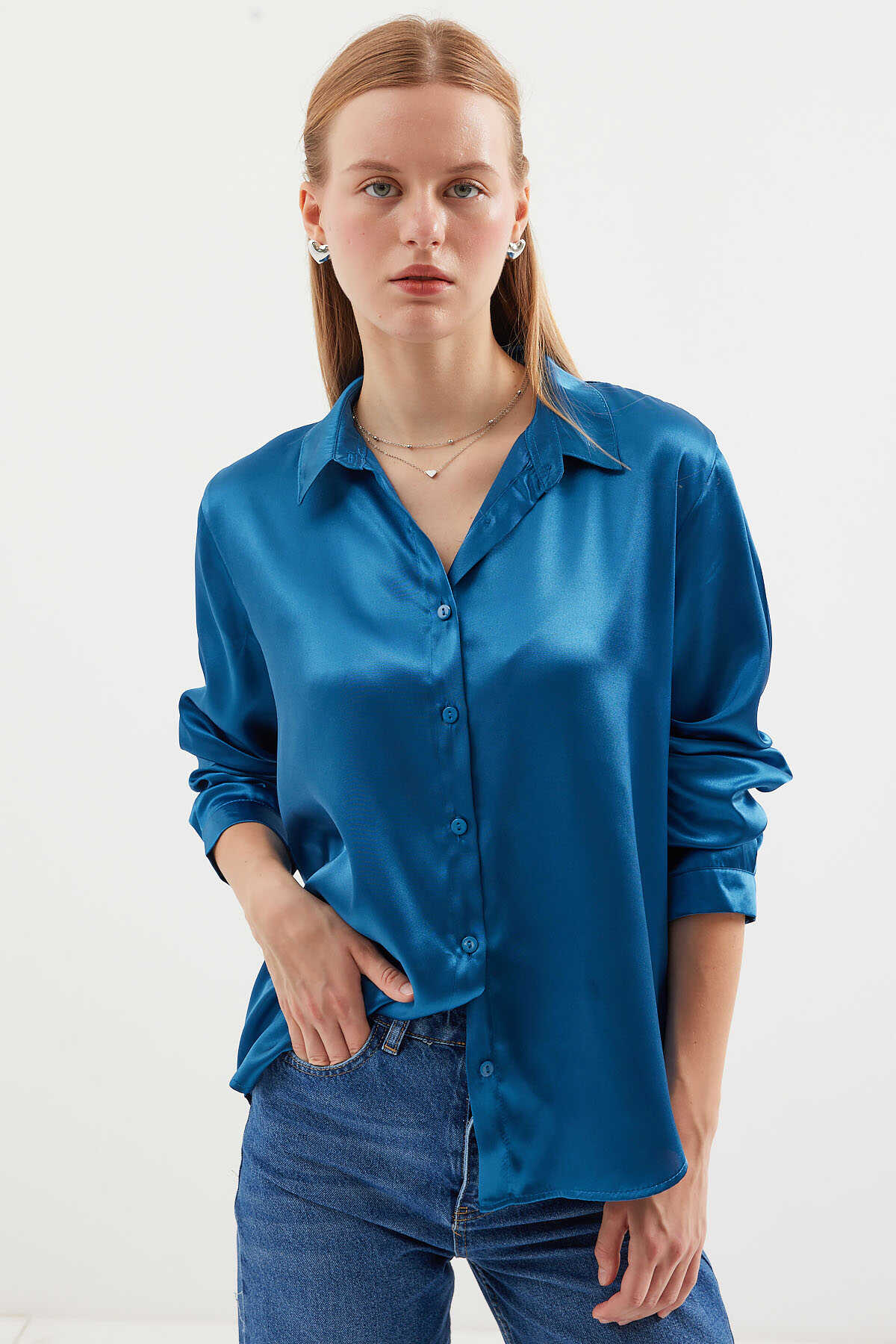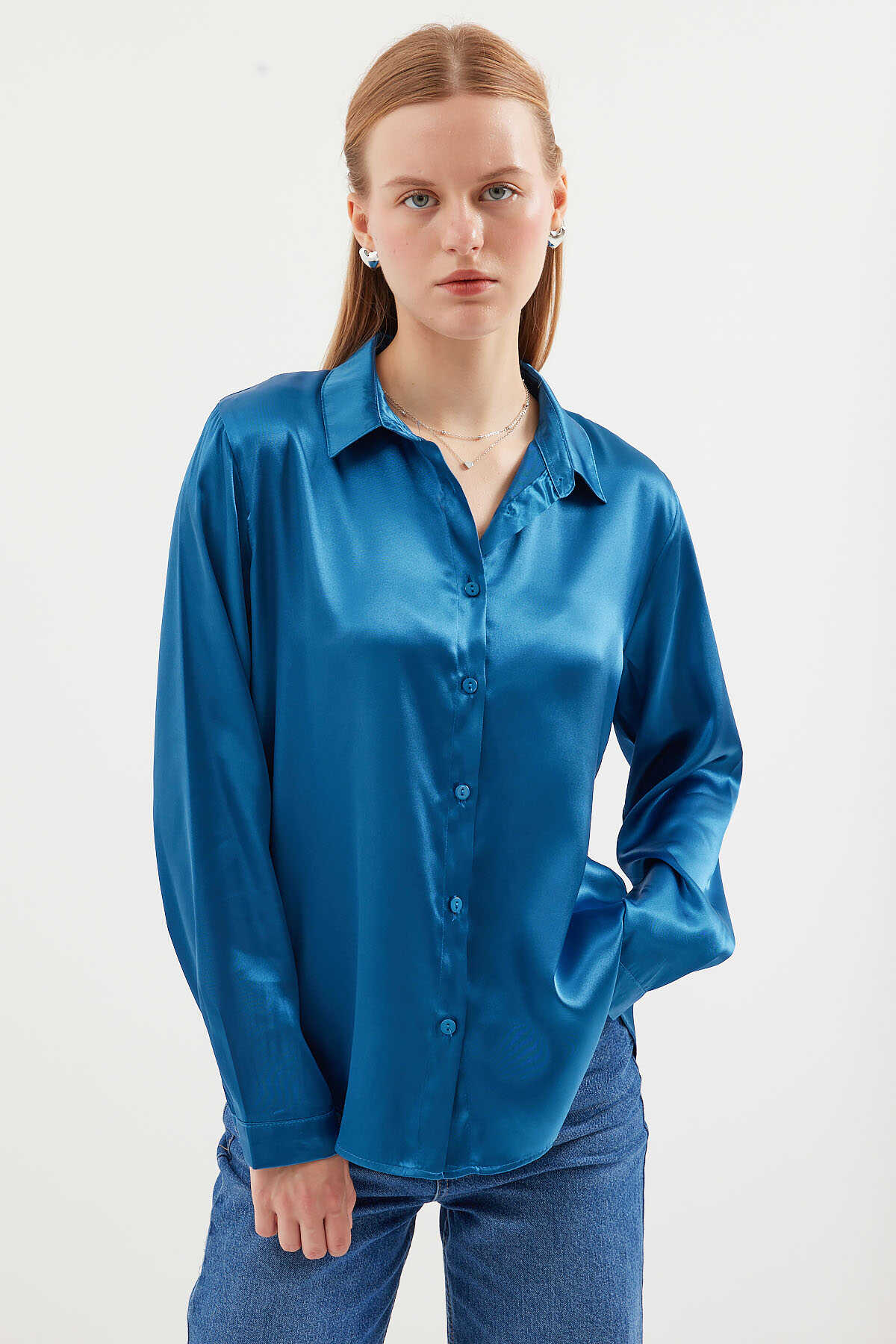 3964 Hafif Dökümlü Saten Gömlek - Petrol - Kombin