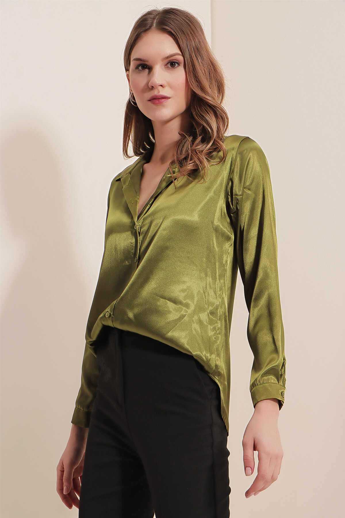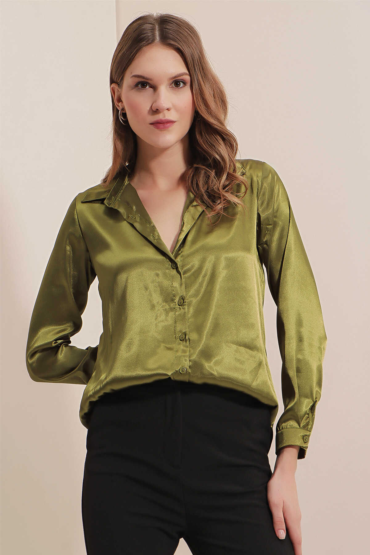 3964 Hafif Dökümlü Saten Gömlek - Y.Haki - Kombin