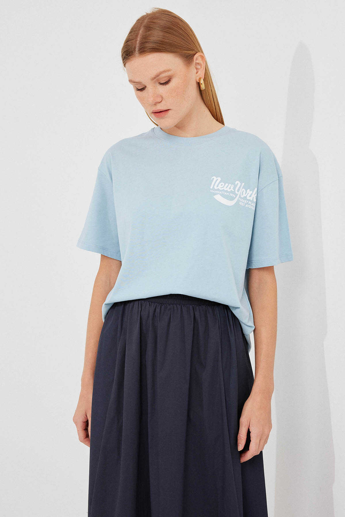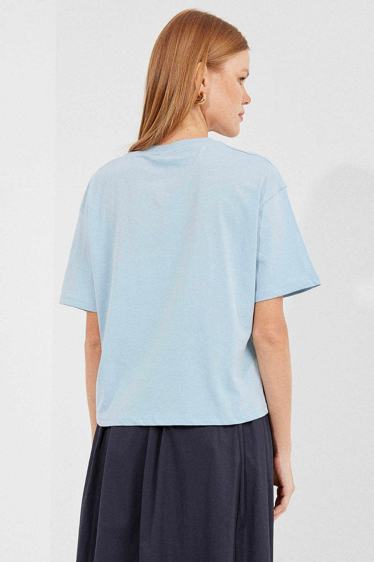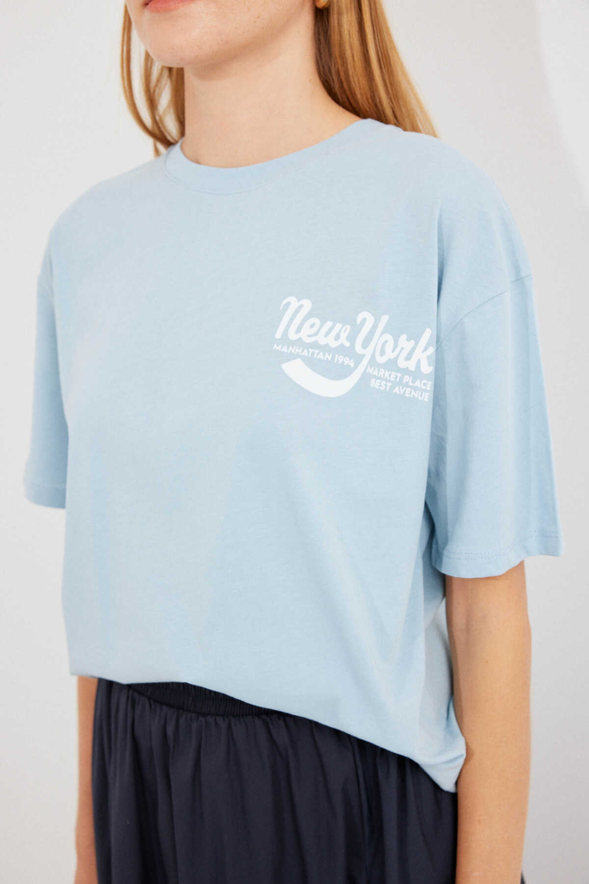 4318 Baskılı Basic Tişört - Mavi - Kombin