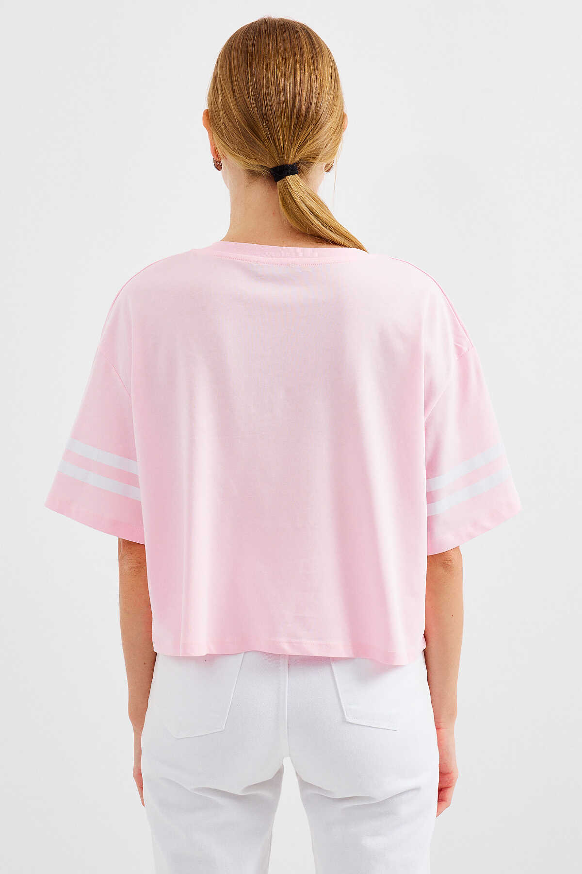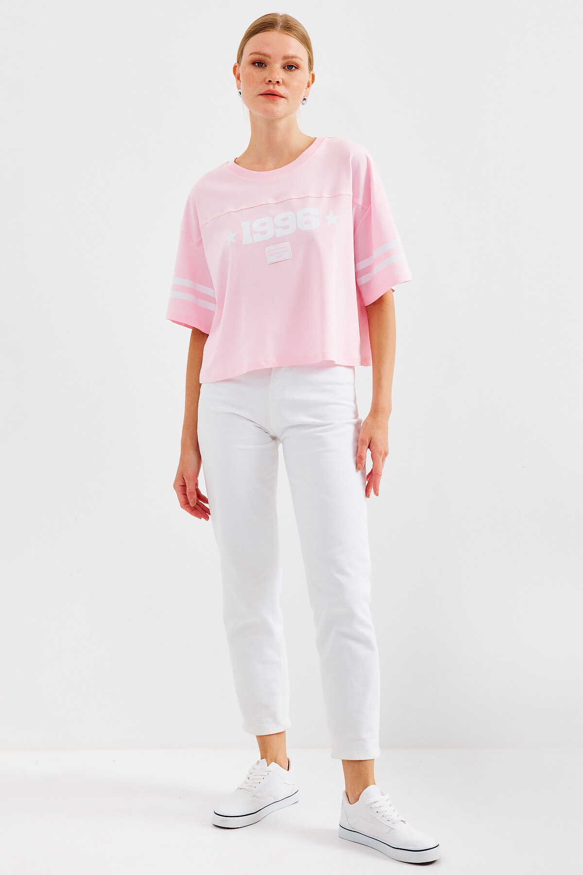 4322 Baskılı Oversize Basic Tişört - Pembe - Kombin