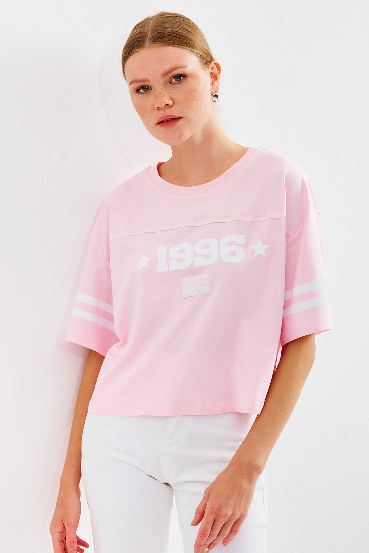 4322 Baskılı Oversize Basic Tişört - Pembe