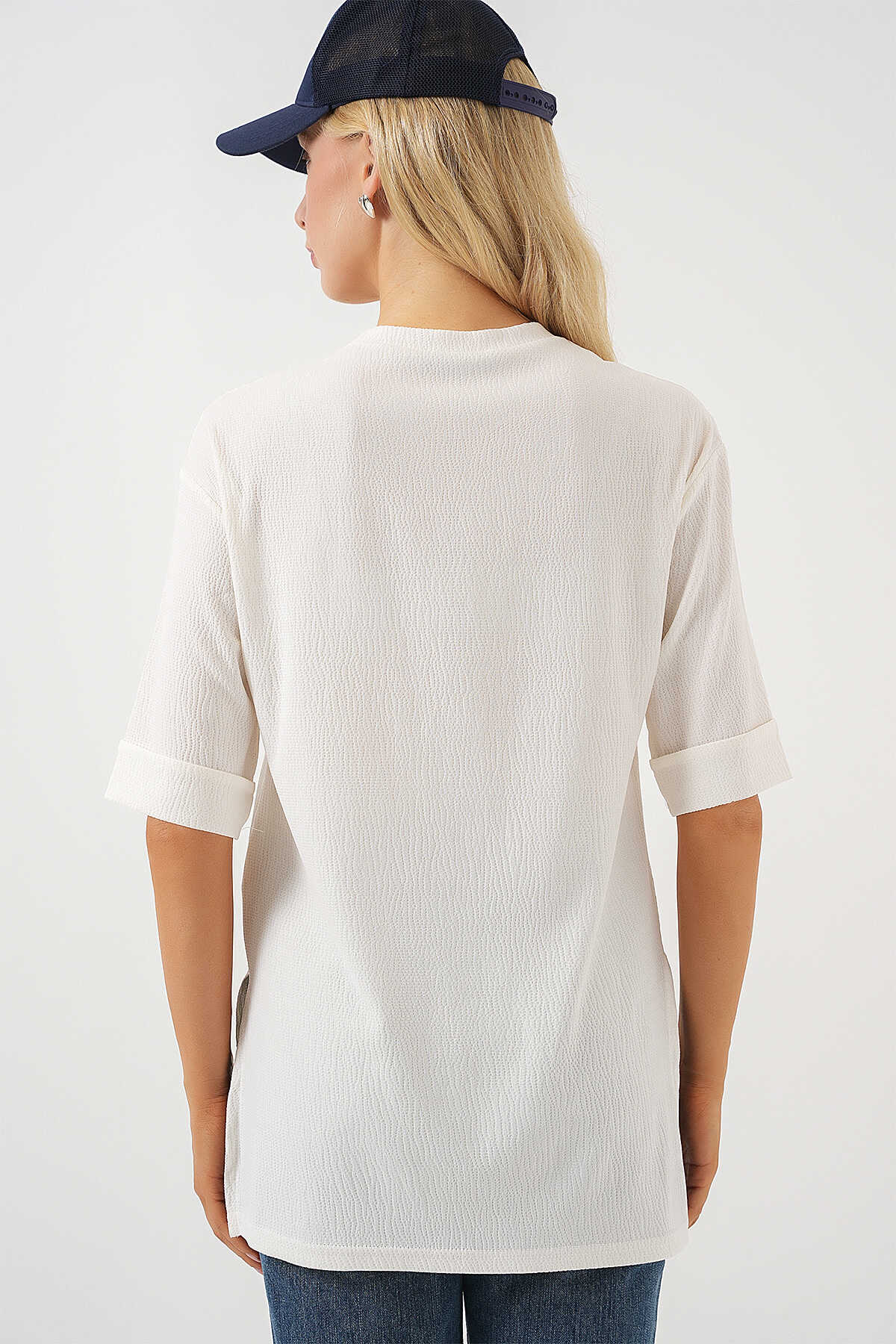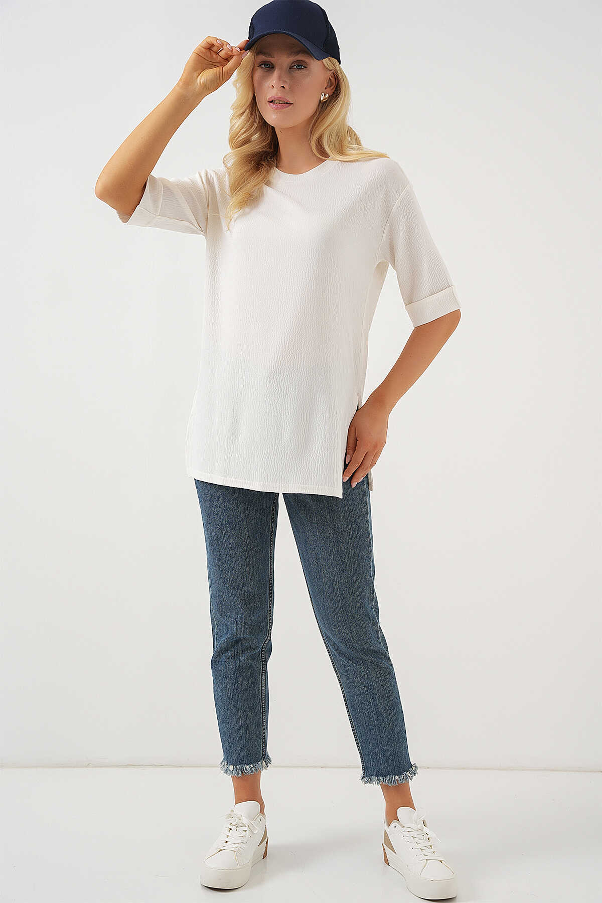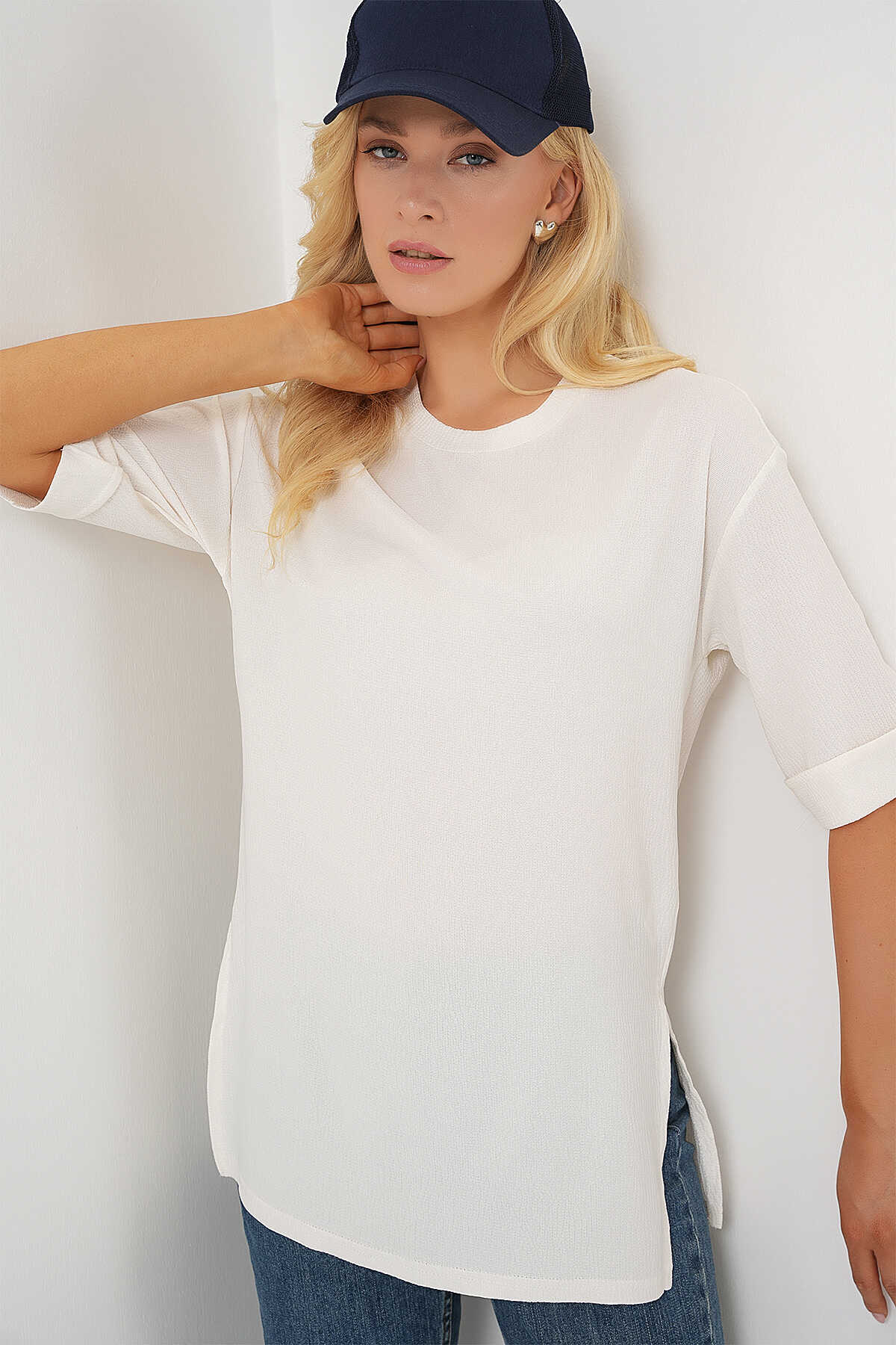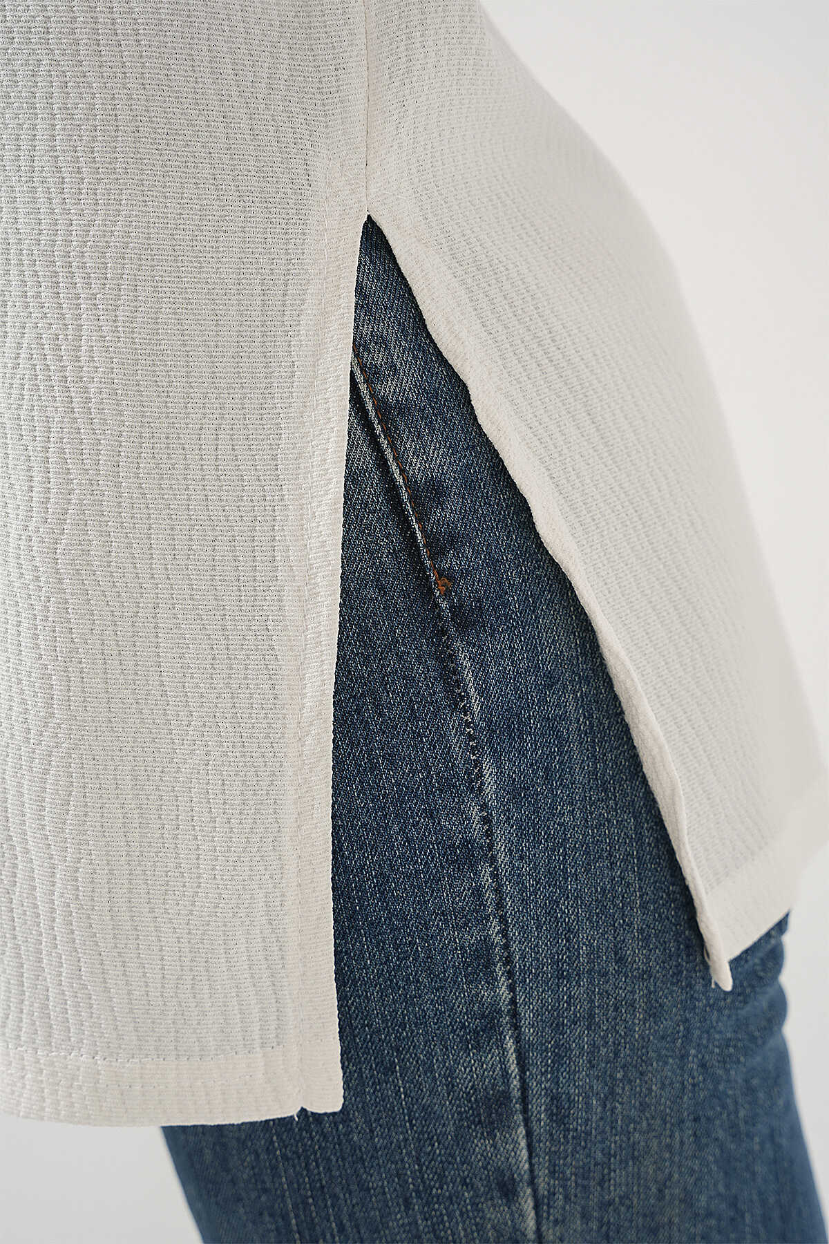 4332 Yanı Yırtmaçlı Örme Tişört - Beyaz - Kombin