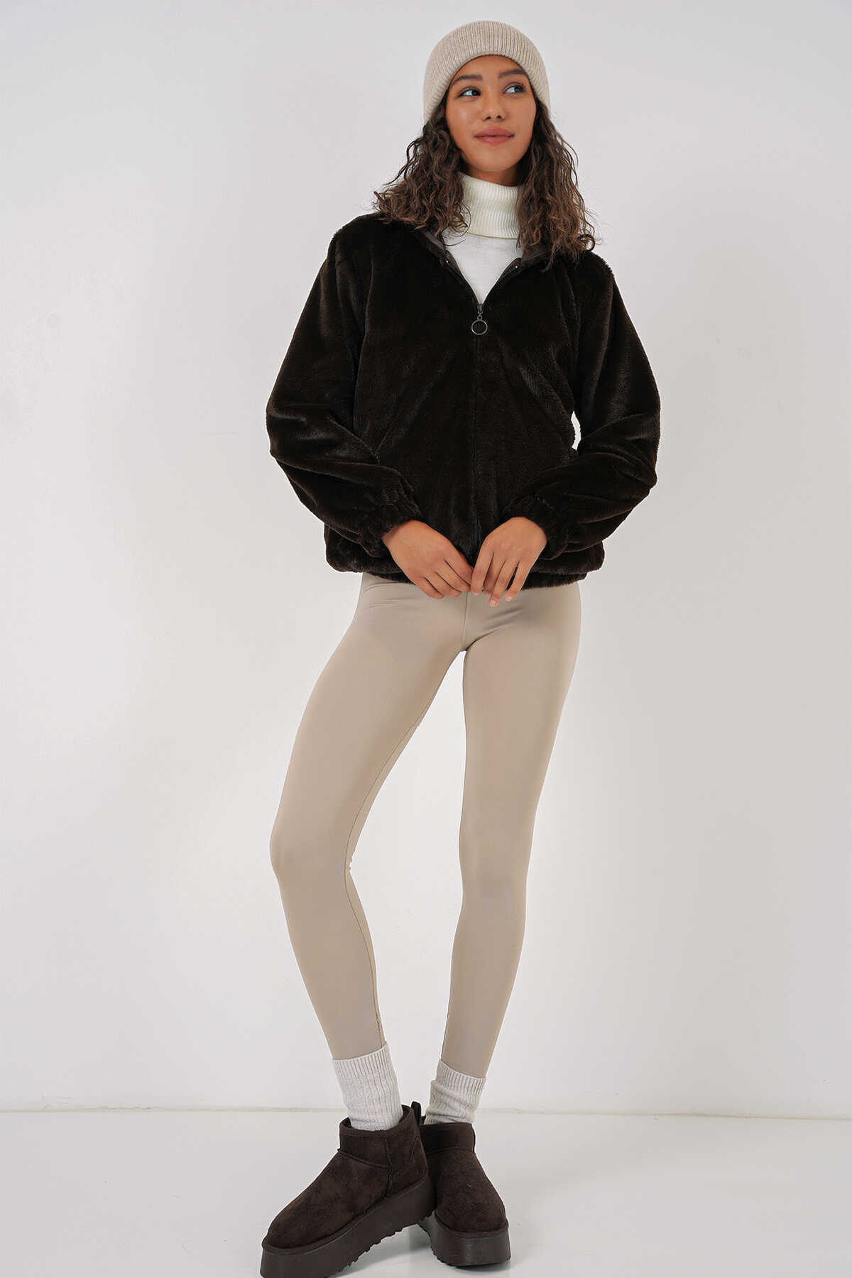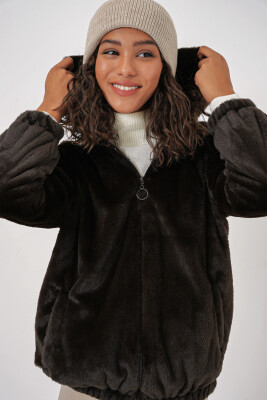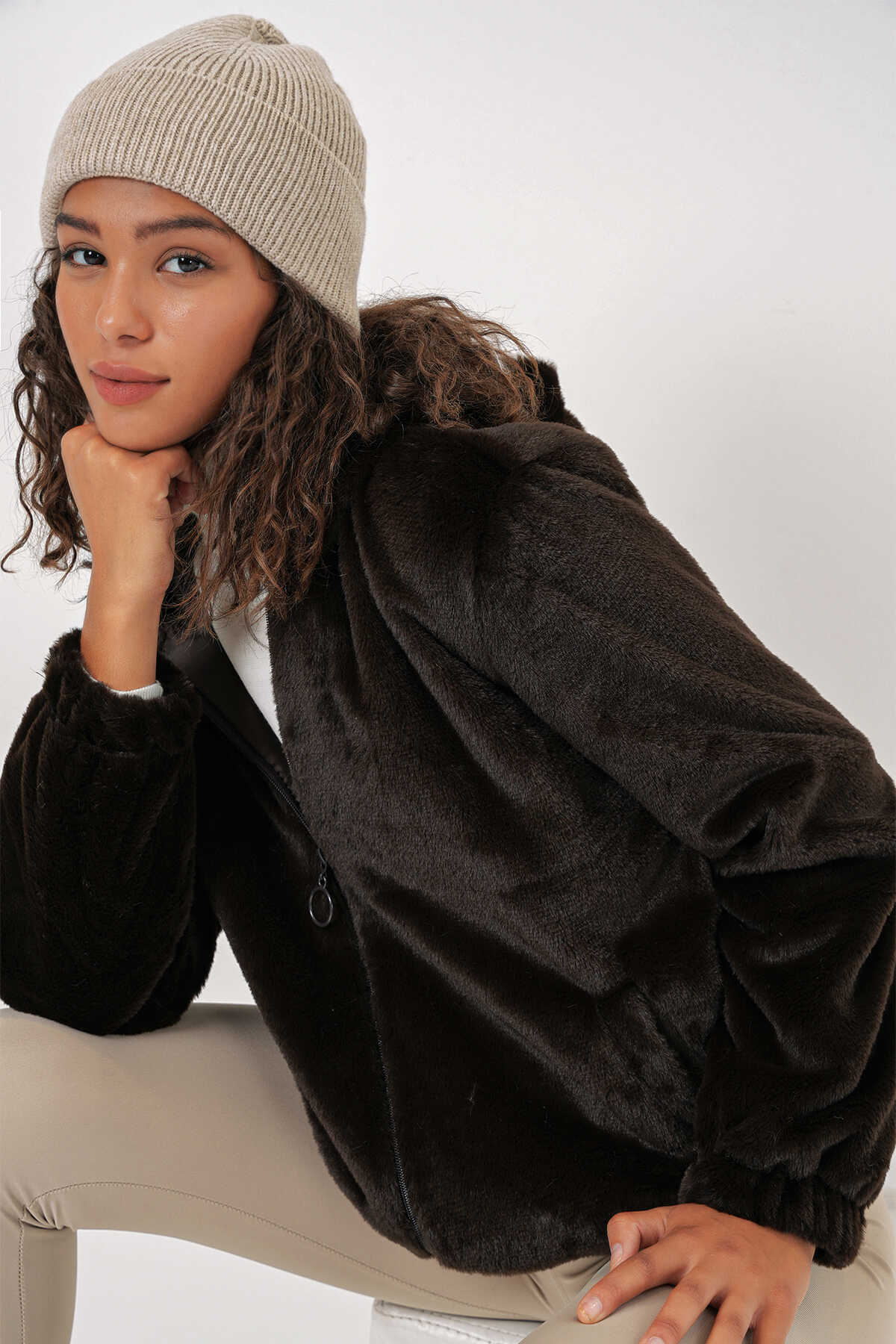 5091 Kapşonlu Kürklü İçi Astarlı Mont - Kahverengi - Kombin