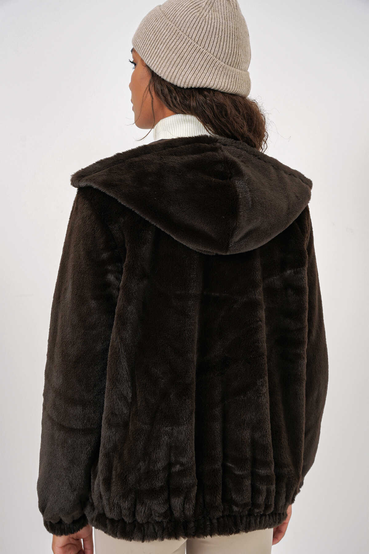 5091 Kapşonlu Kürklü İçi Astarlı Mont - Kahverengi