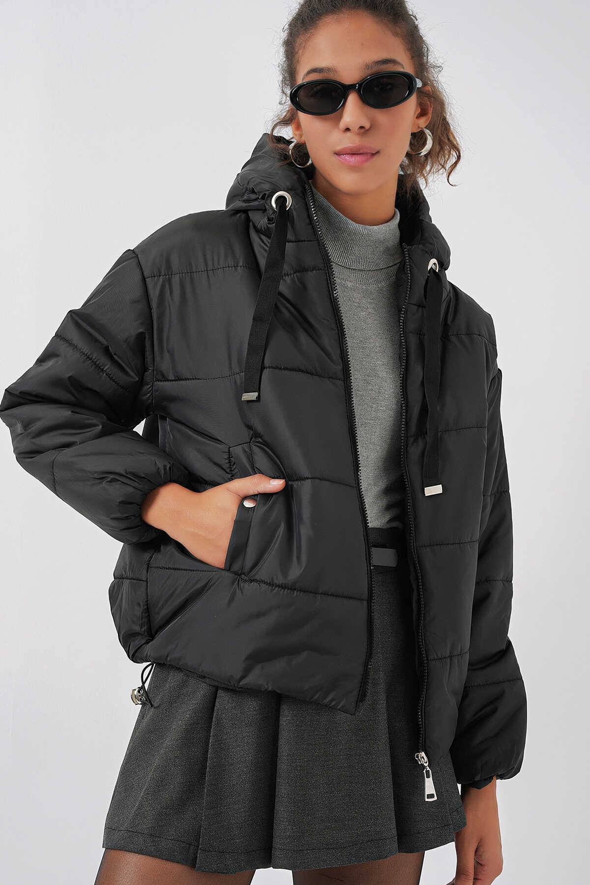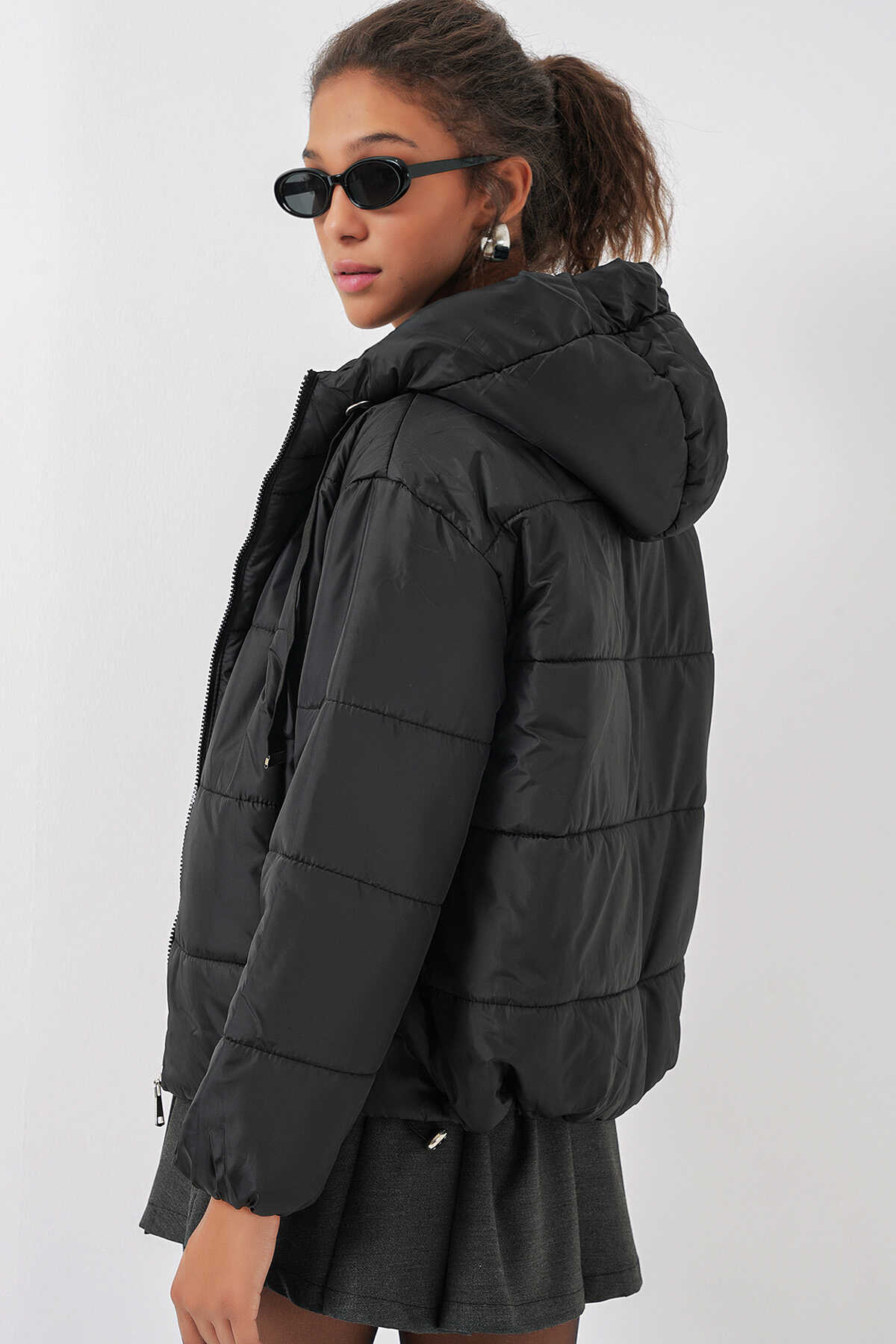 5117 Kapşonlu Şişme Mont - Siyah - Kombin