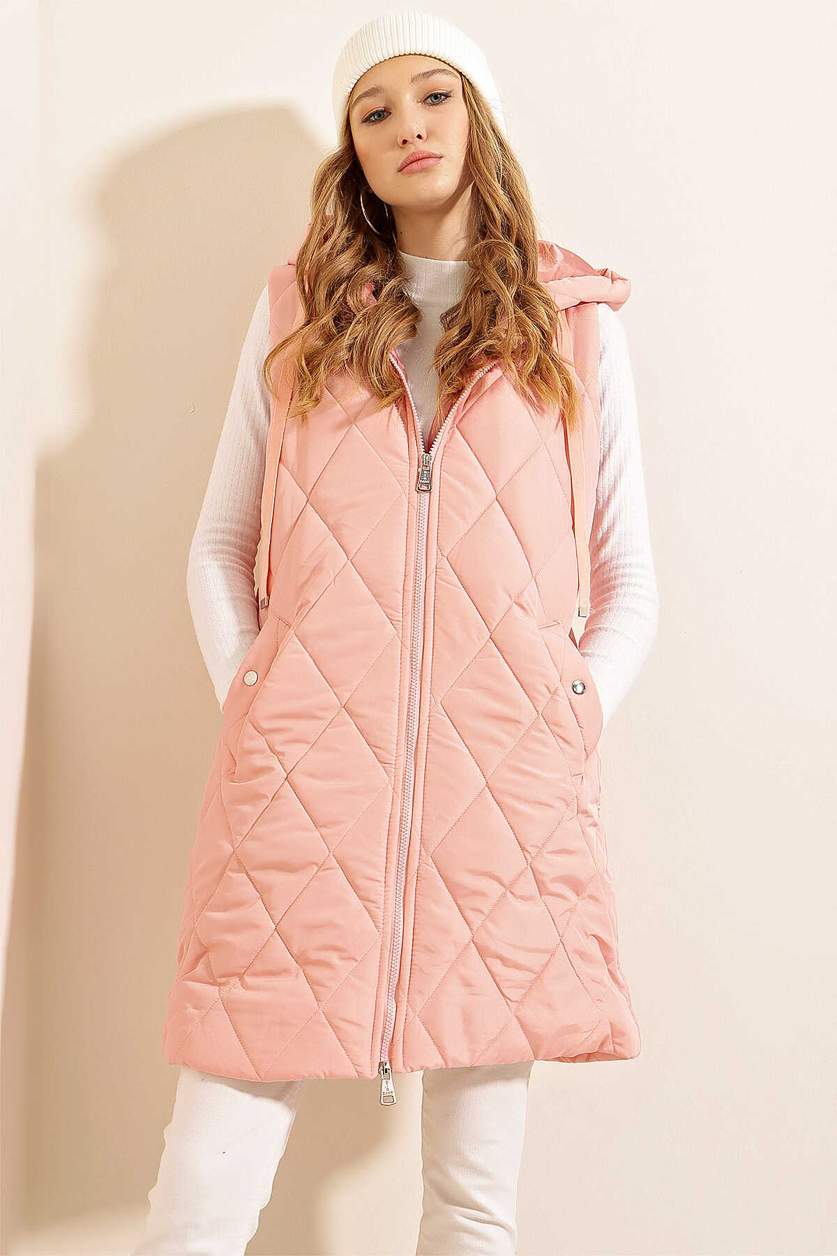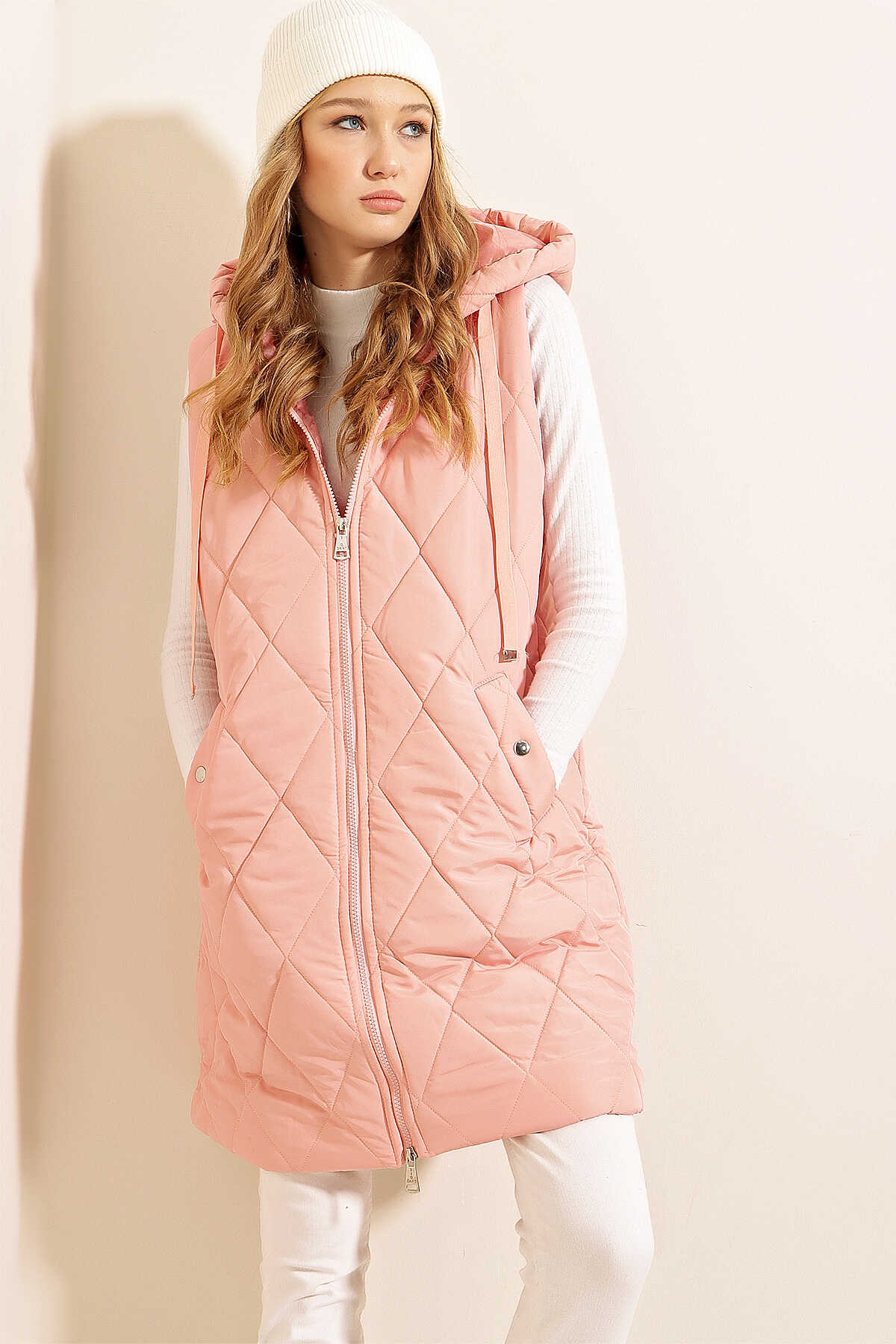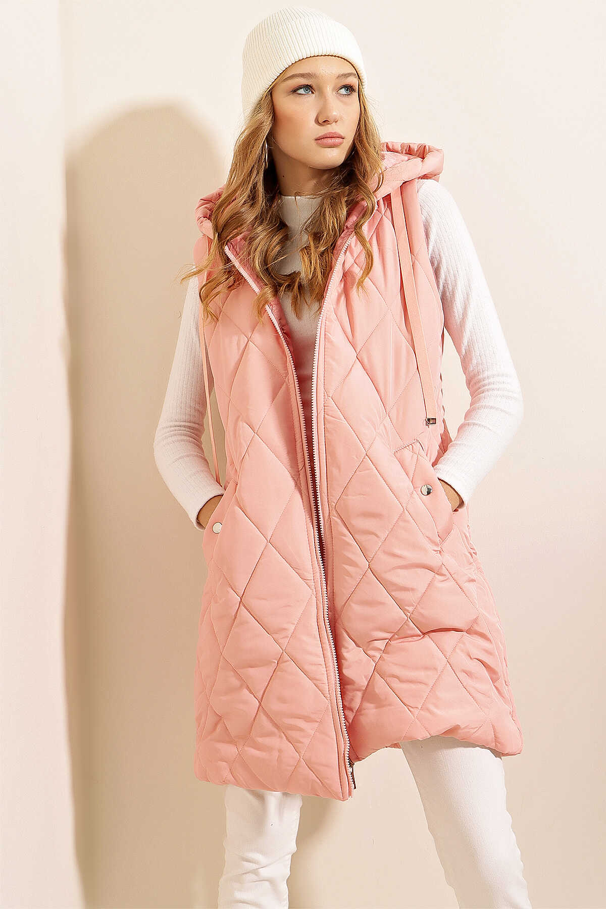 5140 Kapşonlu Uzun Şişme Yelek - Pudra - Kombin