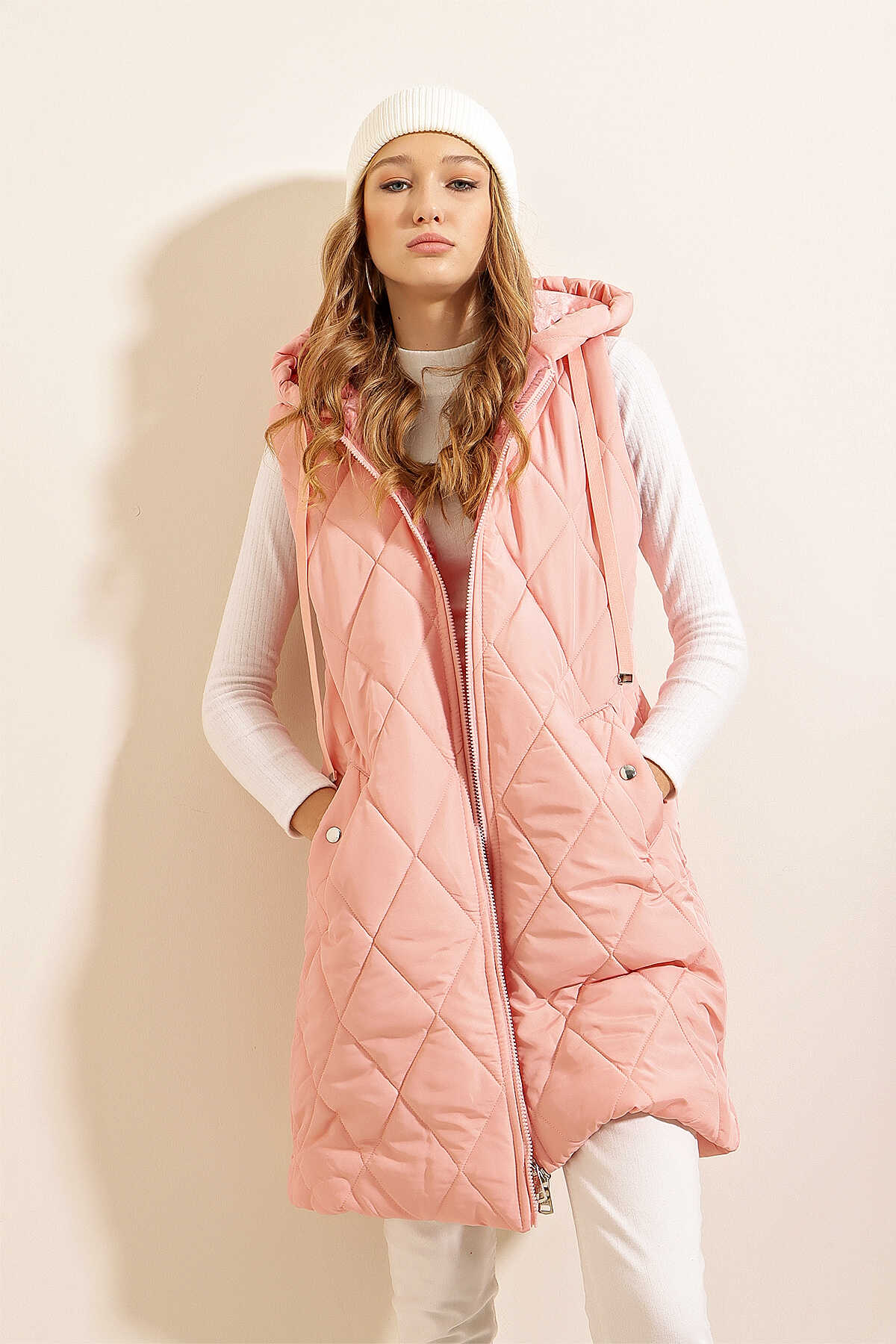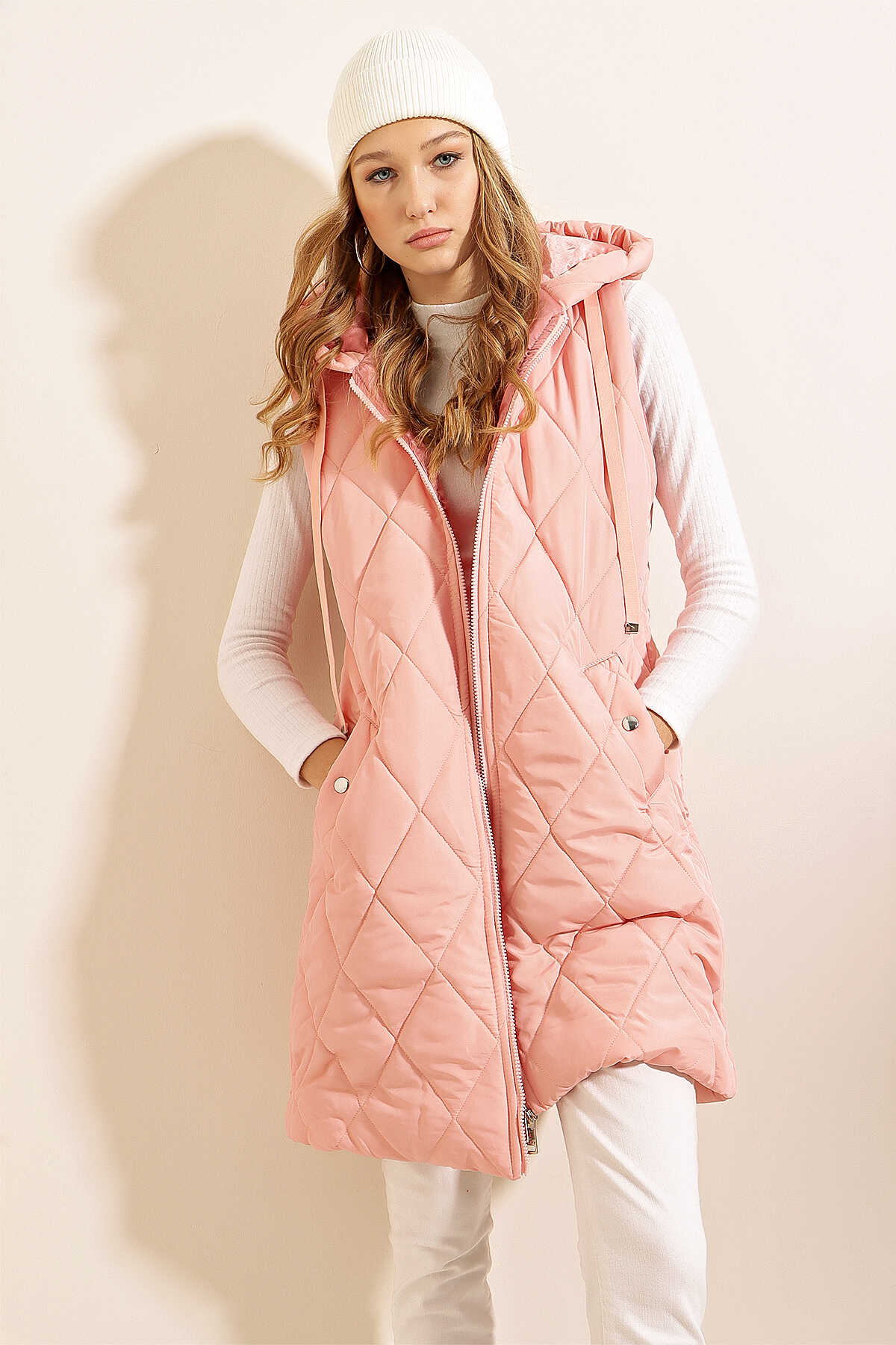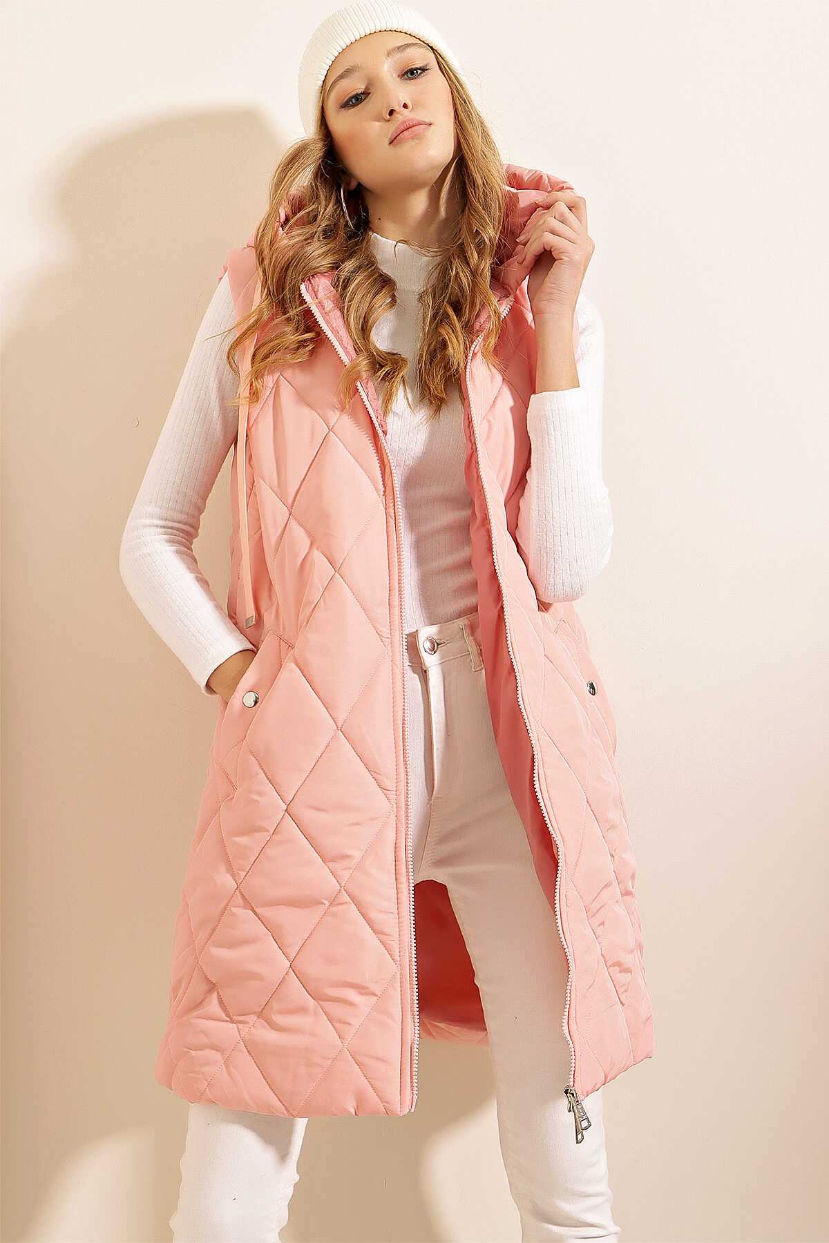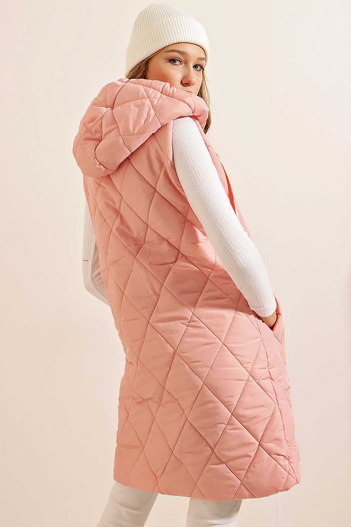 5140 Kapşonlu Uzun Şişme Yelek - Pudra - Kombin