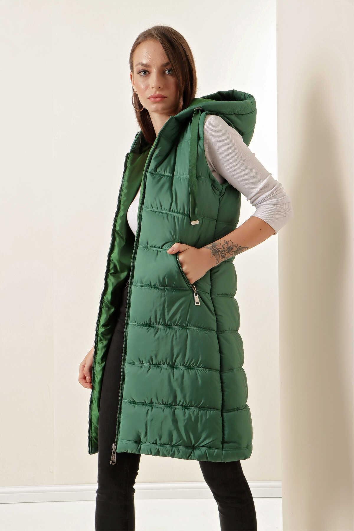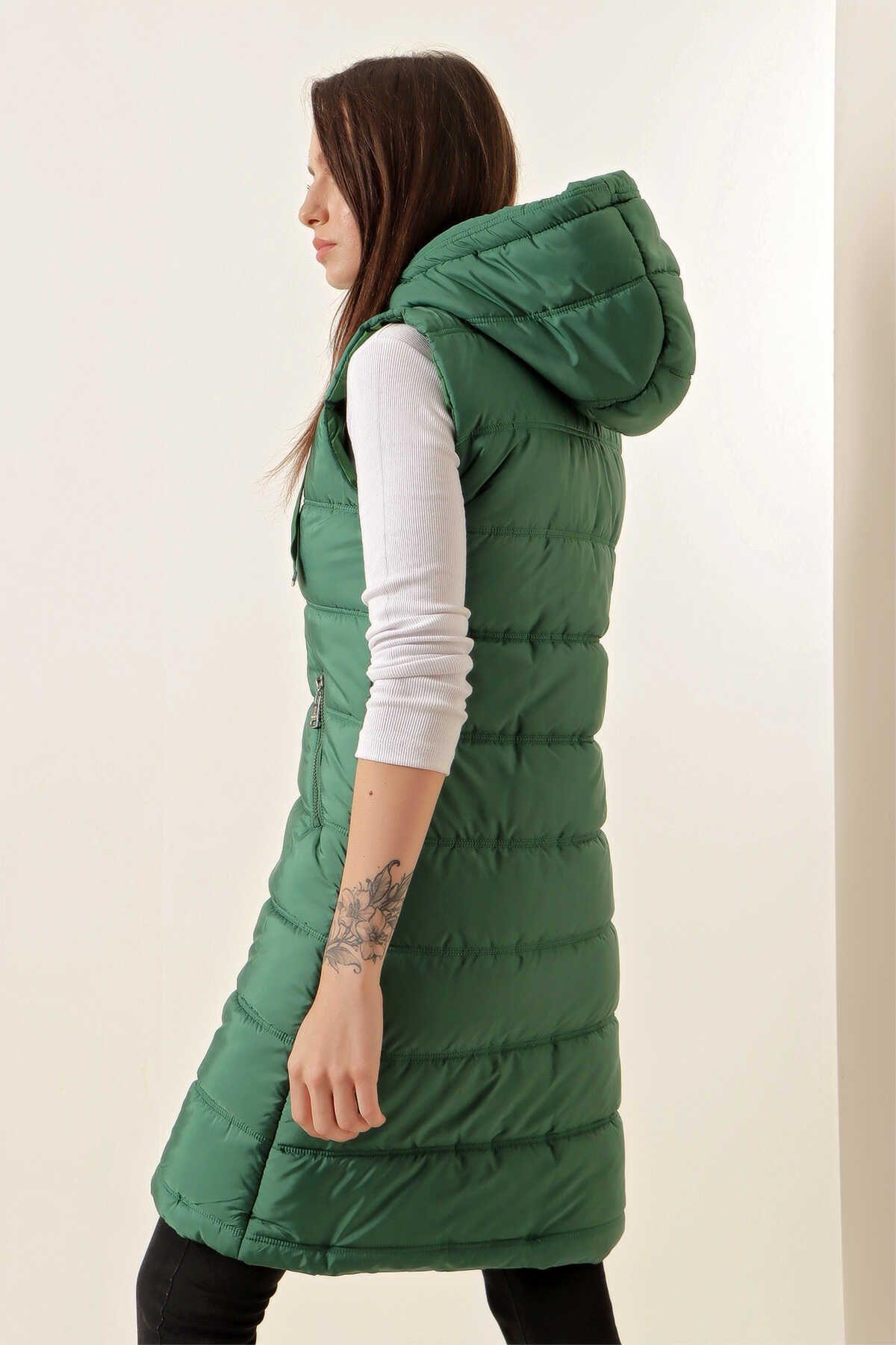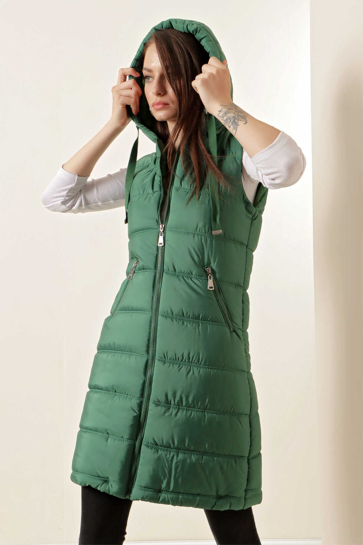 5140 Kapşonlu Uzun Şişme Yelek - Zümrüt Yeşili - Kombin