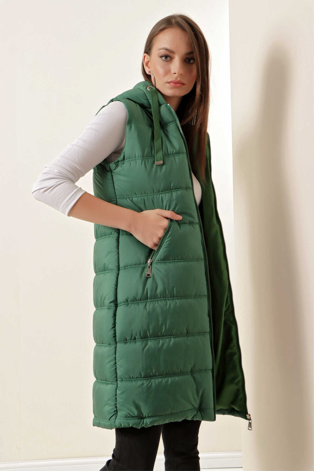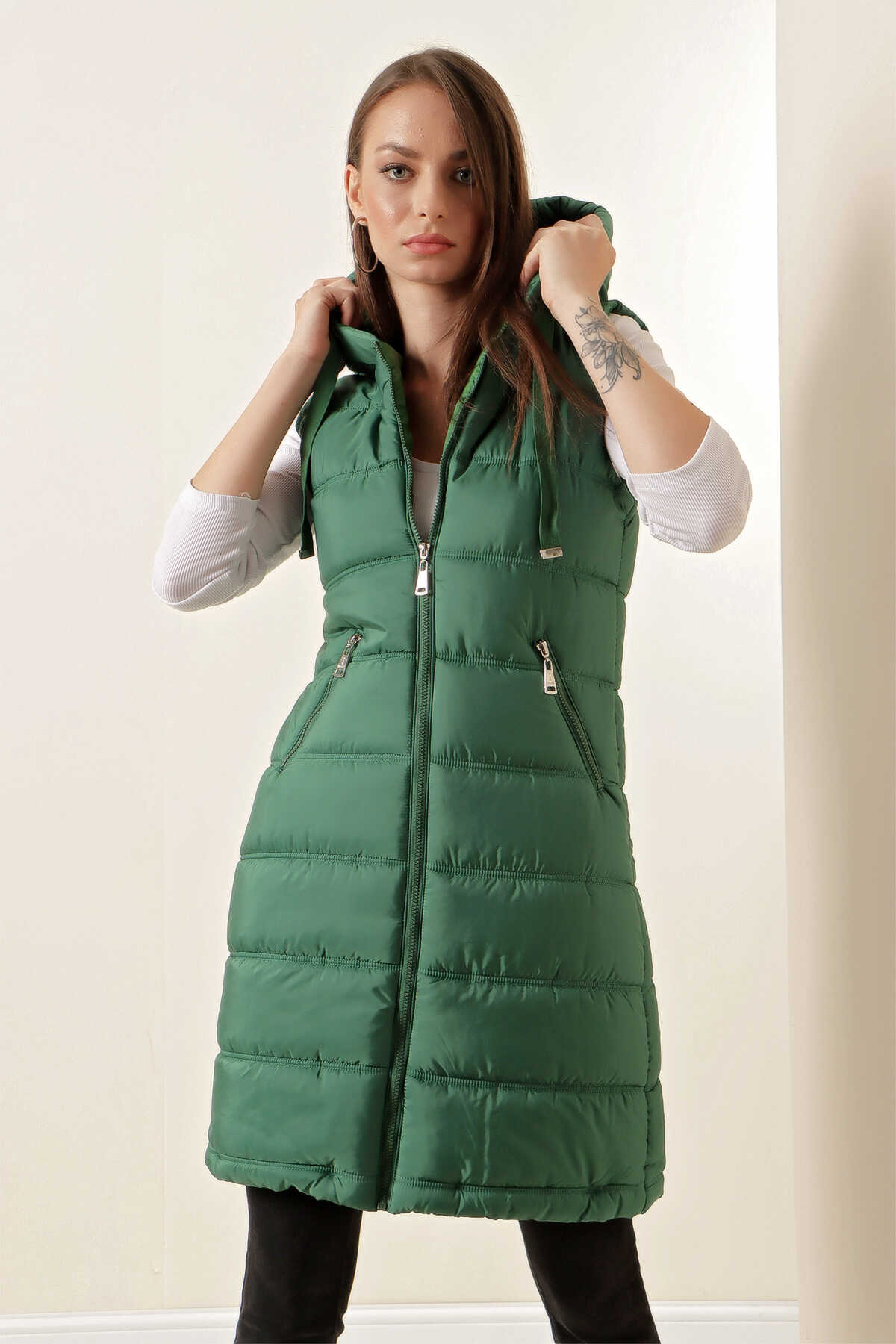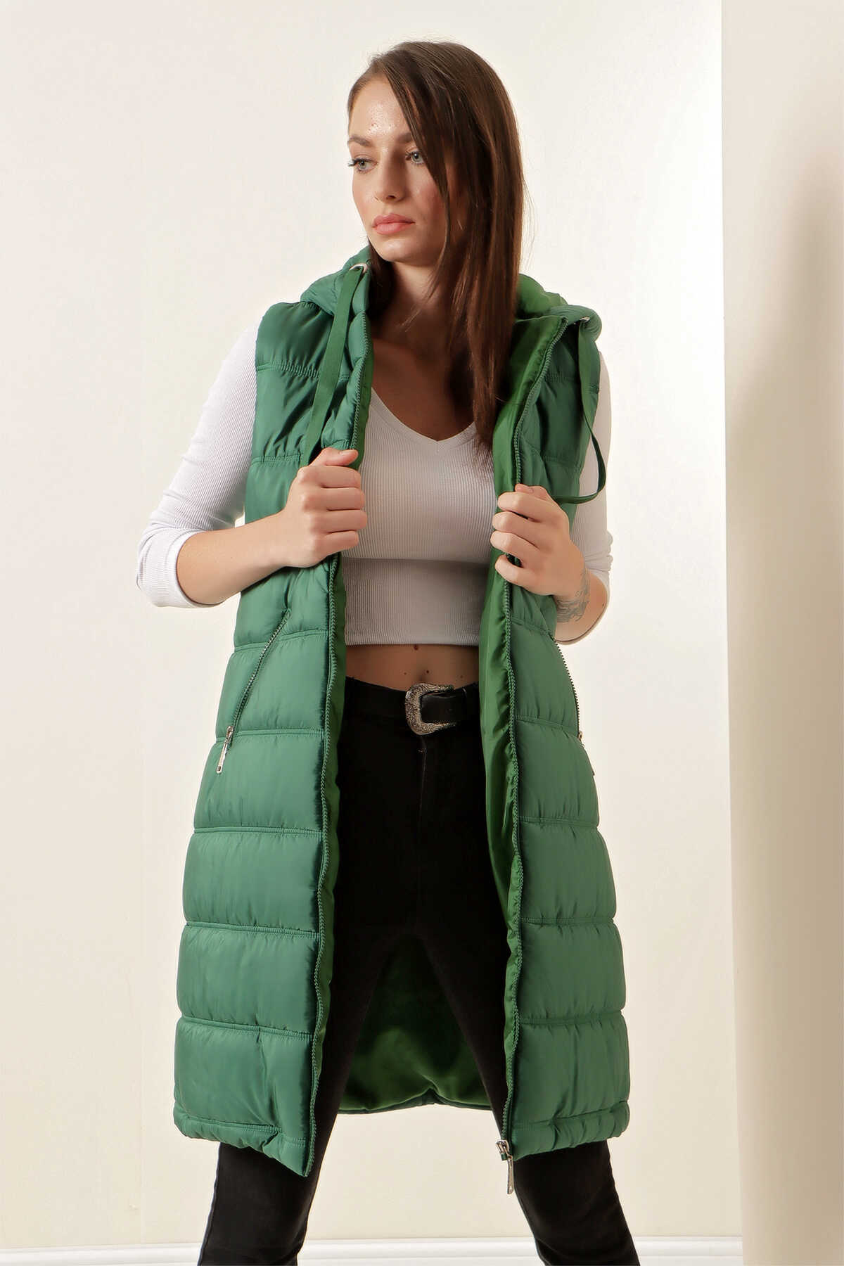 5140 Kapşonlu Uzun Şişme Yelek - Zümrüt Yeşili - Kombin