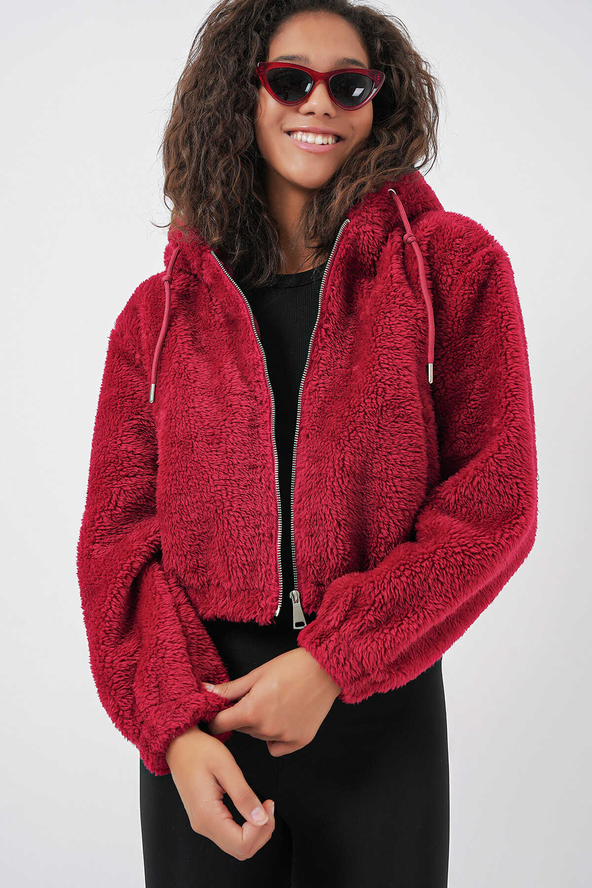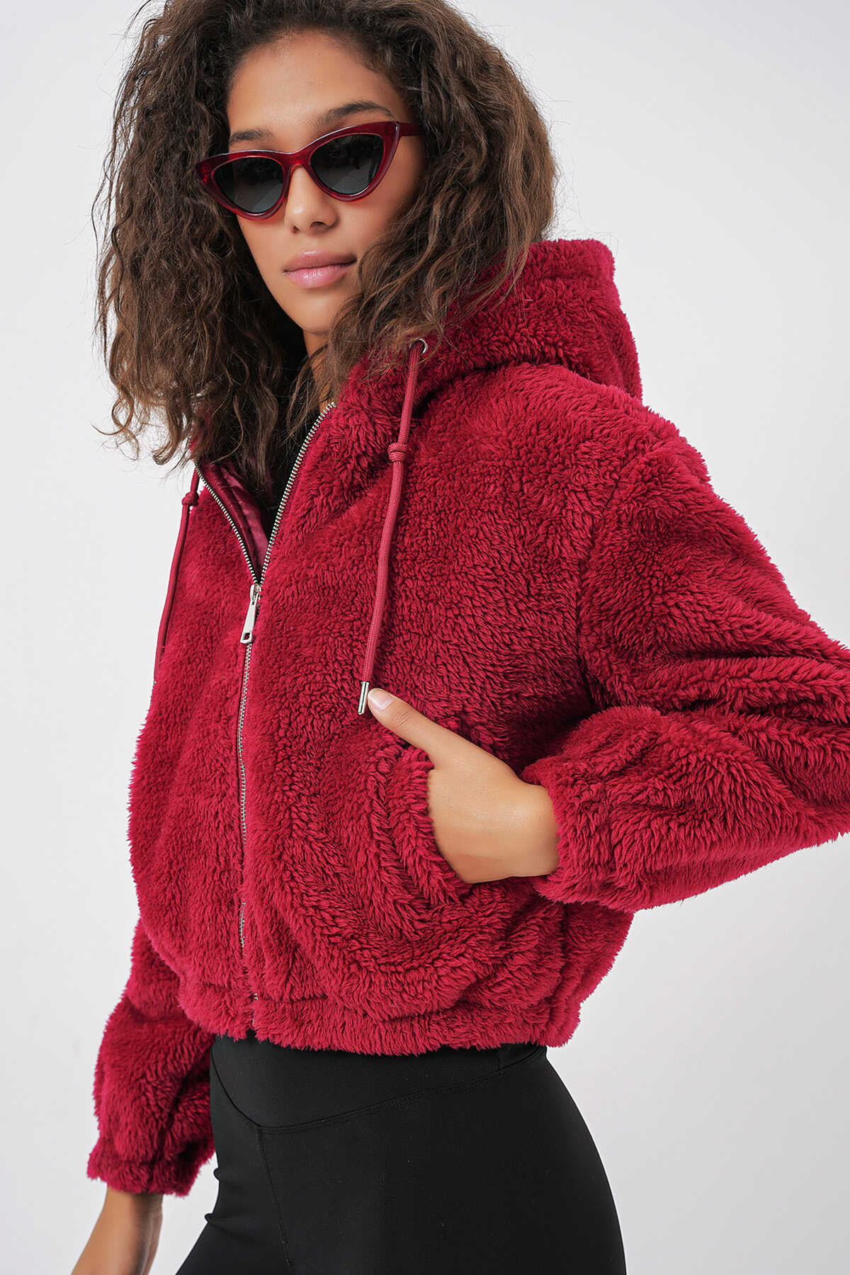 5193 Kapüşonlu Peluş Crop Ceket - Bordo - Kombin